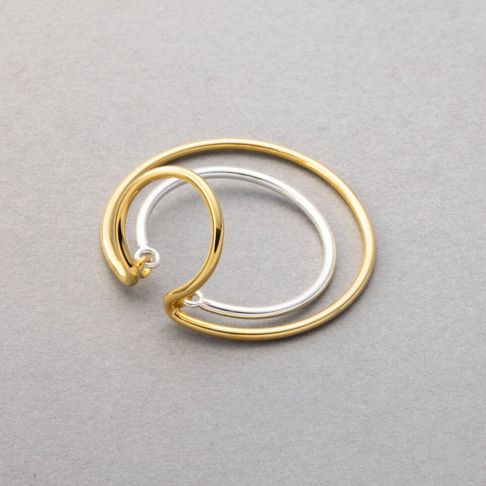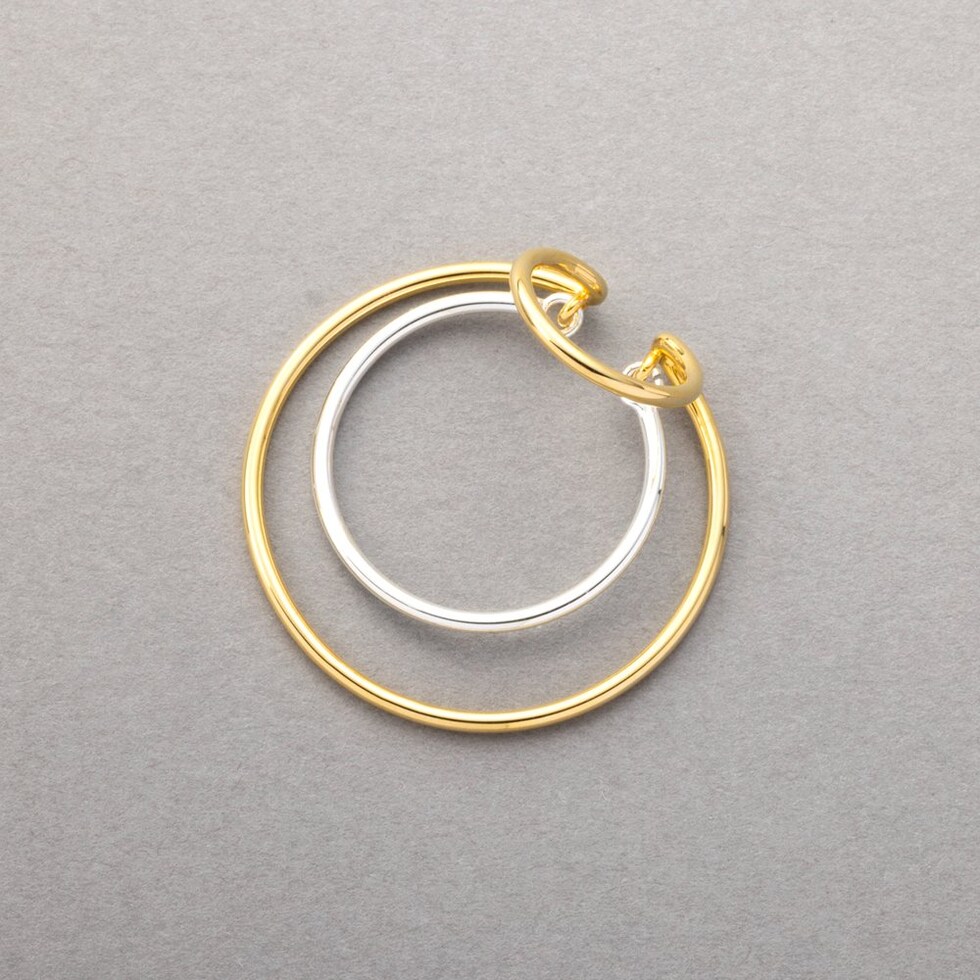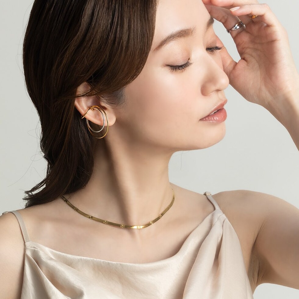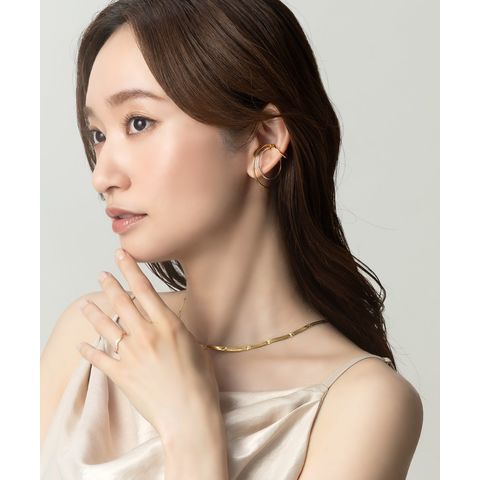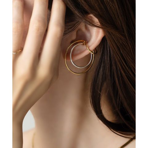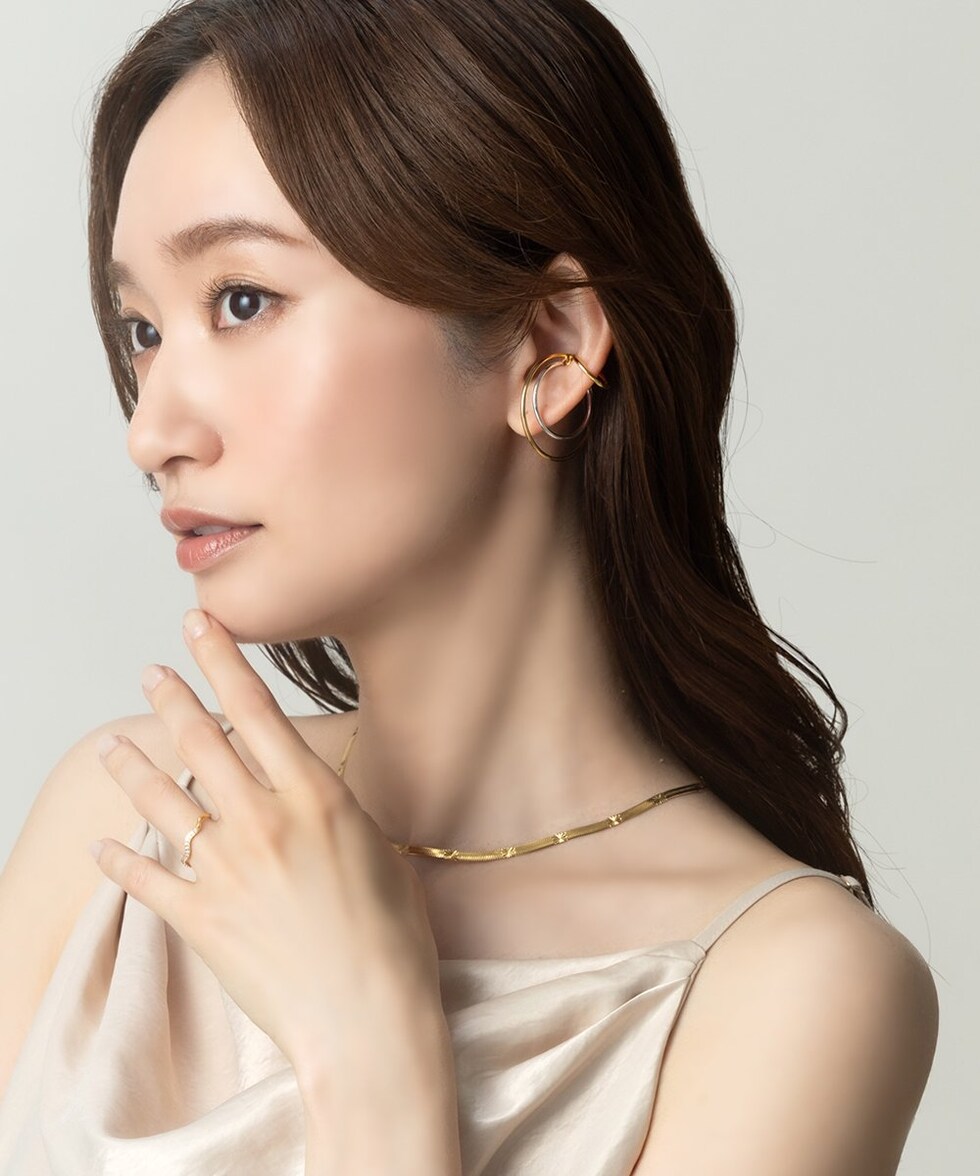 フープを重ねづけしたような片耳用イヤーカフ。トレンドのMIXカラーと立体的なデザインで、顔周りをぐっとこなれた印象に。中央のフープは固定されていないため自然にフィットします◎
