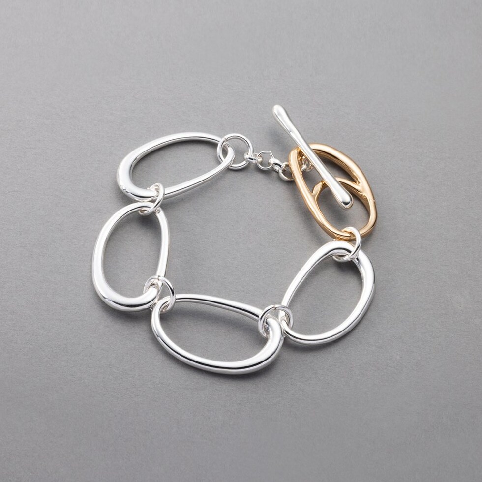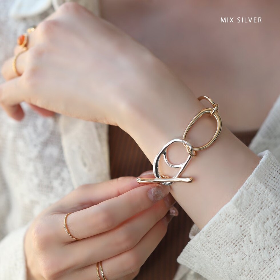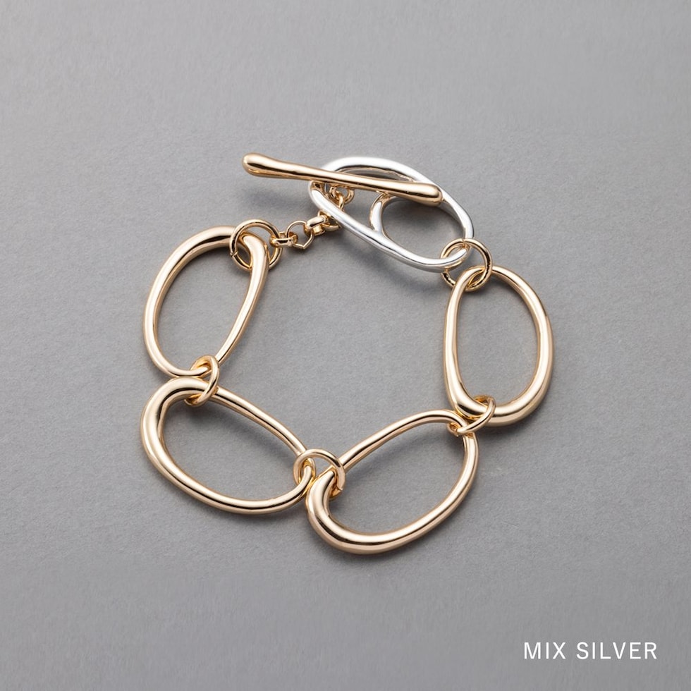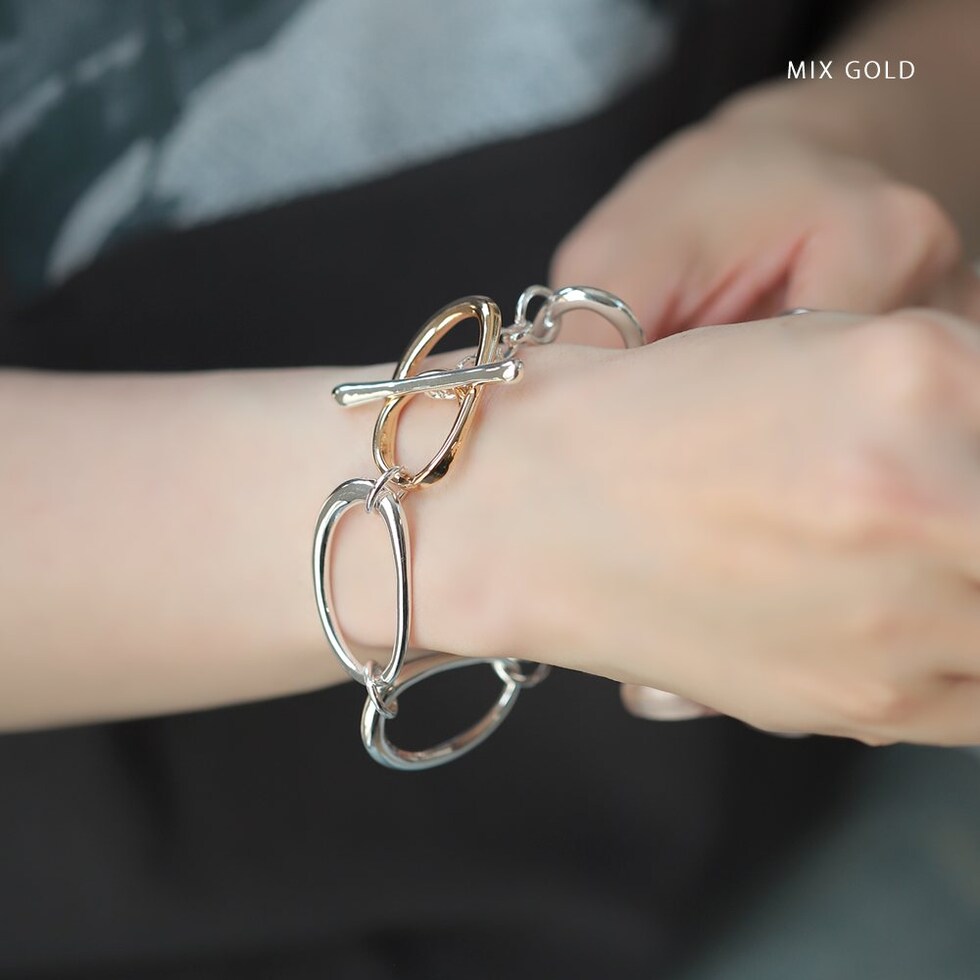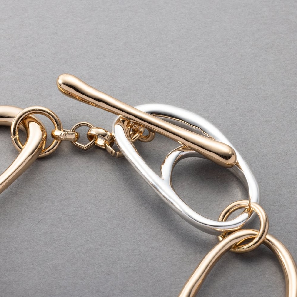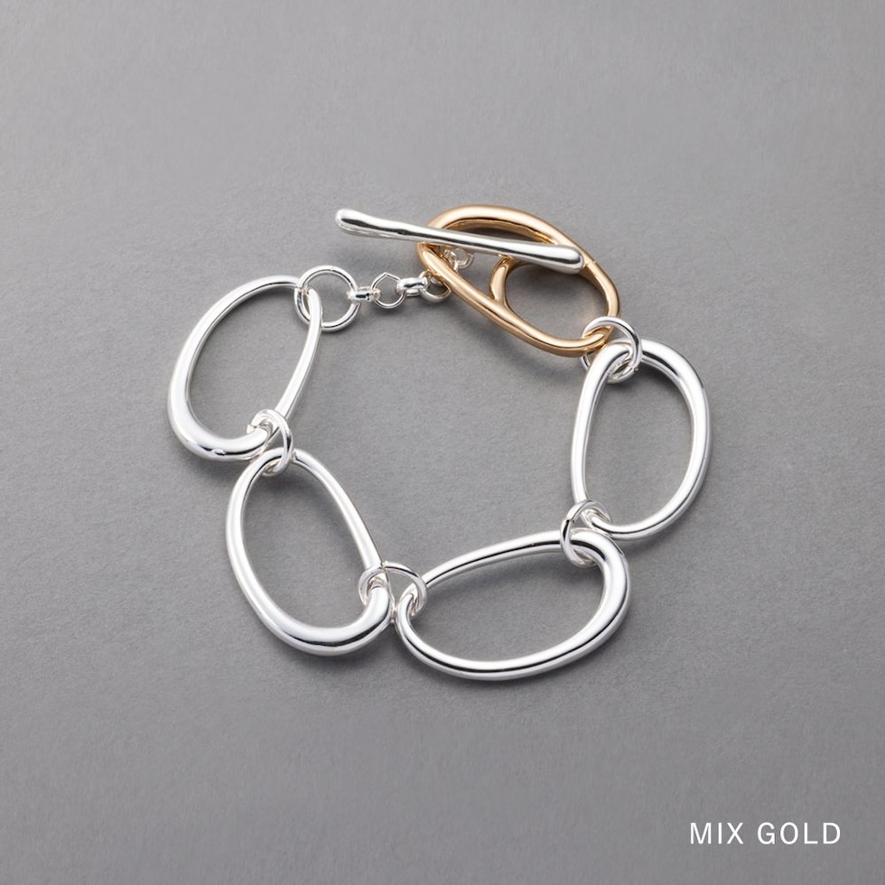 クラフト感ある少し歪な形のオーバルチェーンが連なるブレスレット。チェーンと留め具部分のコンビカラーが抜け感のあるお洒落な手元を演出◎存在感バツグンなルックスでいつものスタイリングをクラスアップしてくれます。低アレルギーのニッケルフリー素材を使用しているので、長時間の着用も安心です。