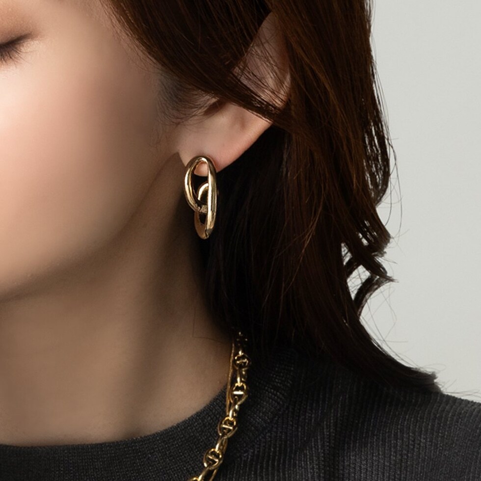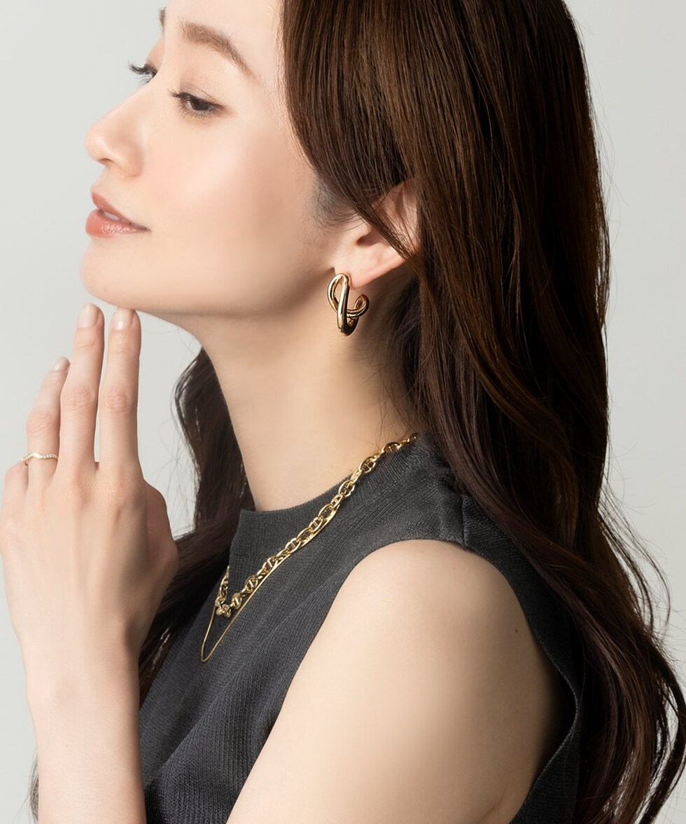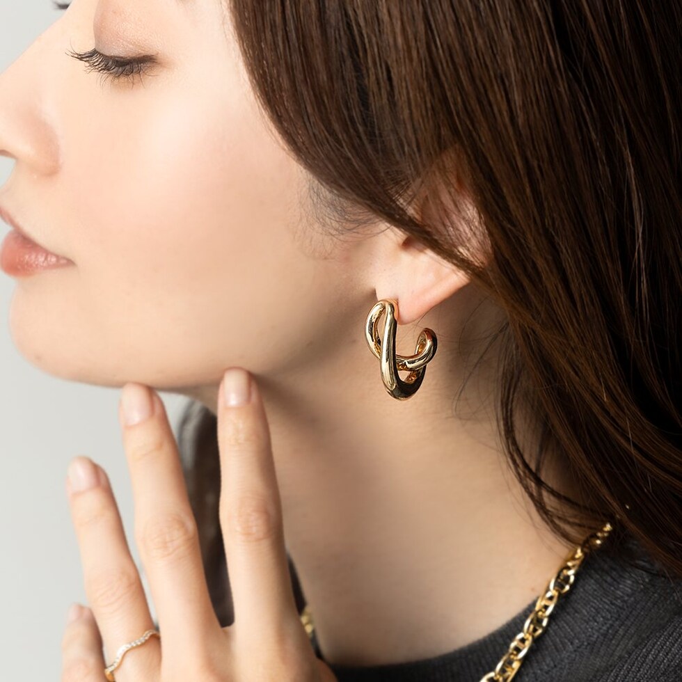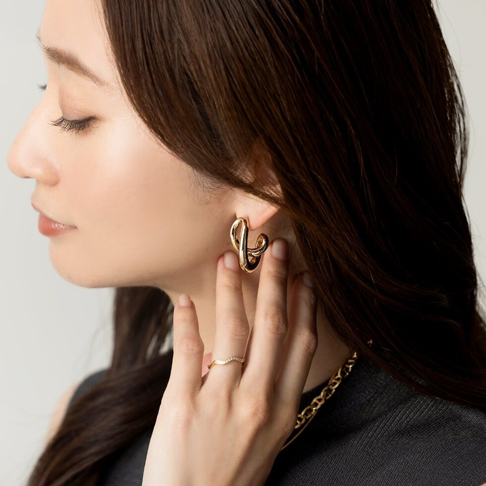個性的なフォルムが目を惹くフープピアス。立体感のある変形デザインが、見る角度によって表情豊かに艶めきます。サッと着けるだけで顔周りが映えるオススメのアイテム◎
