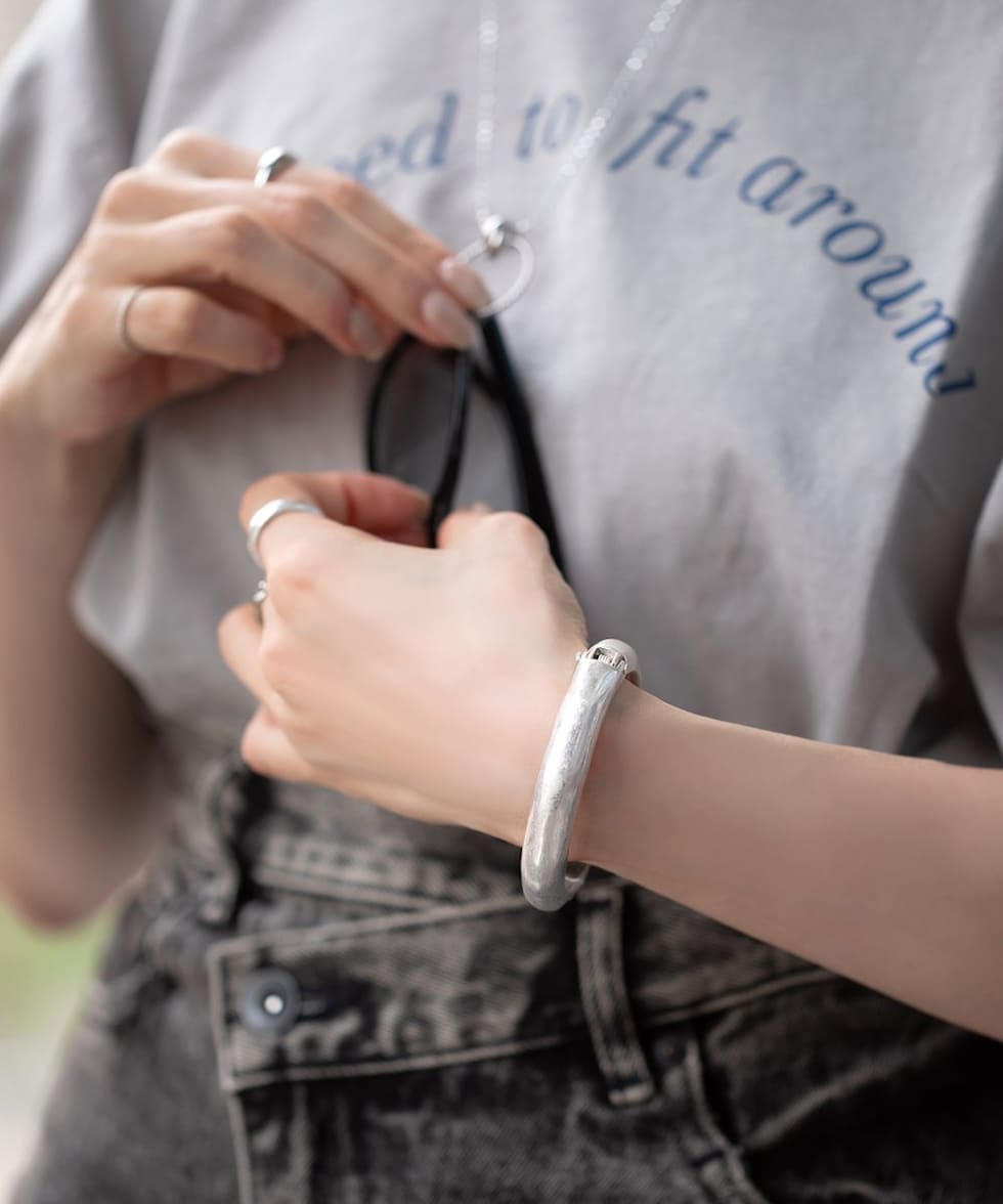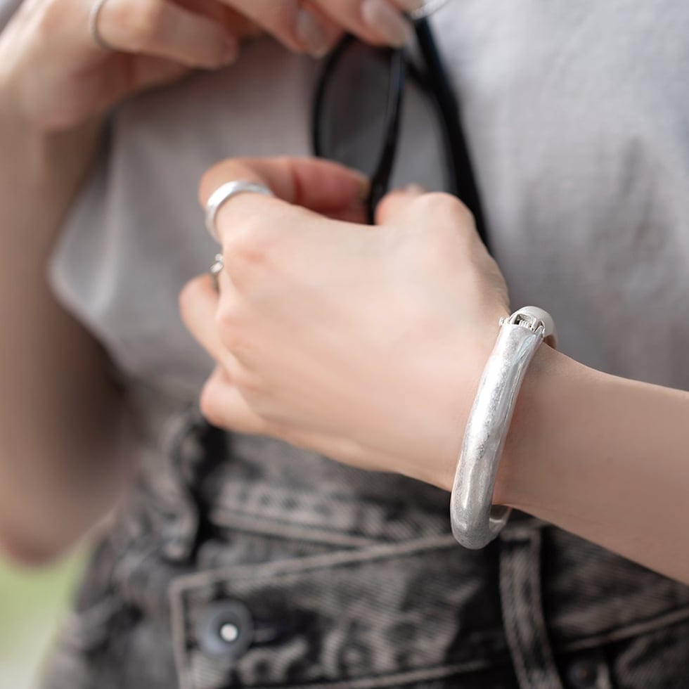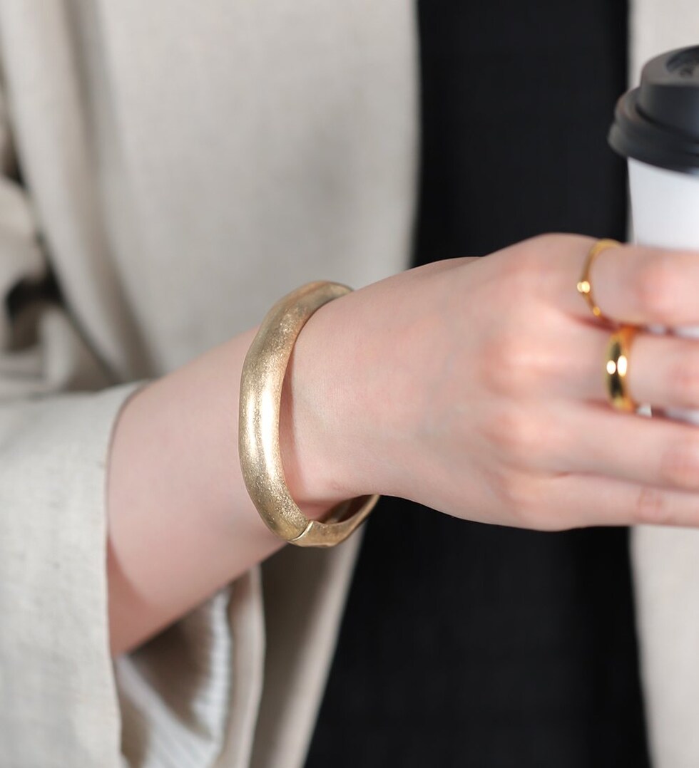 クラフト感のあるヴィンテージ調メタルバングル。艶を抑えたセミマットなメタルで大人コーデのアクセントにぴったり。開閉式タイプでカチッと留まるから着脱も簡単です。
