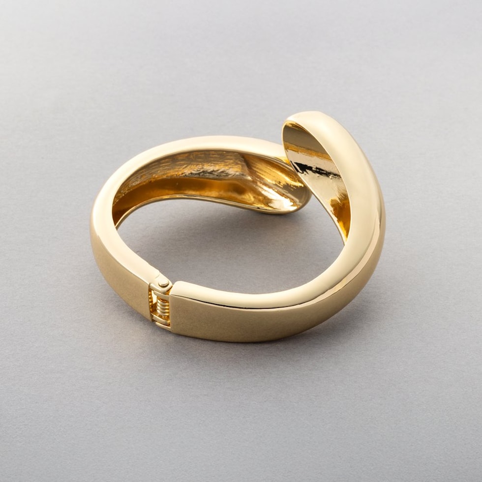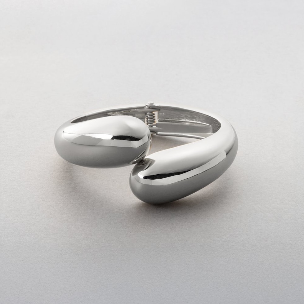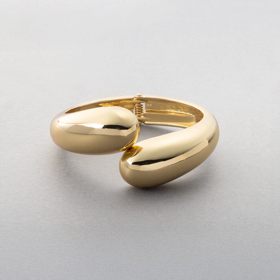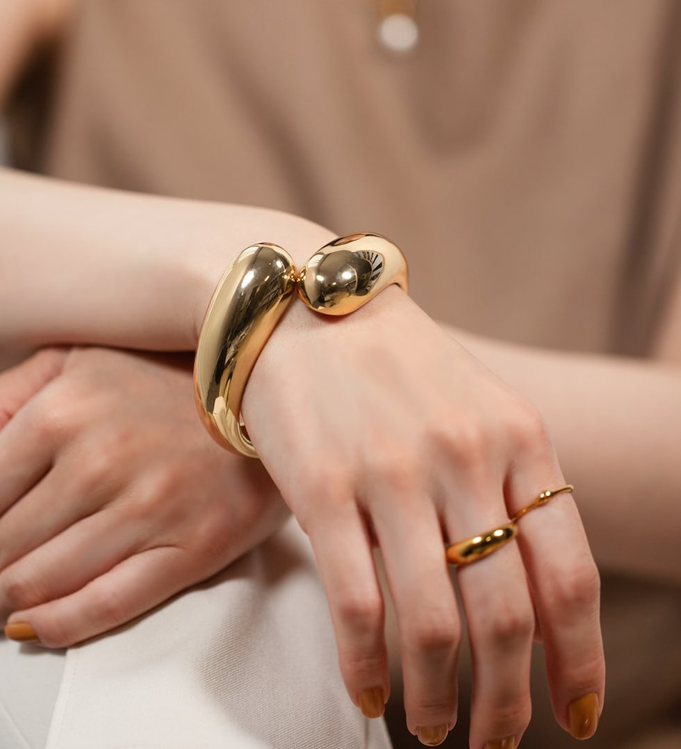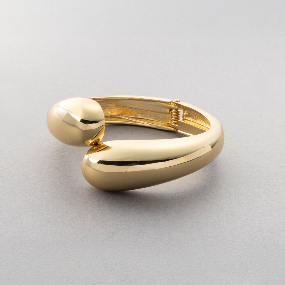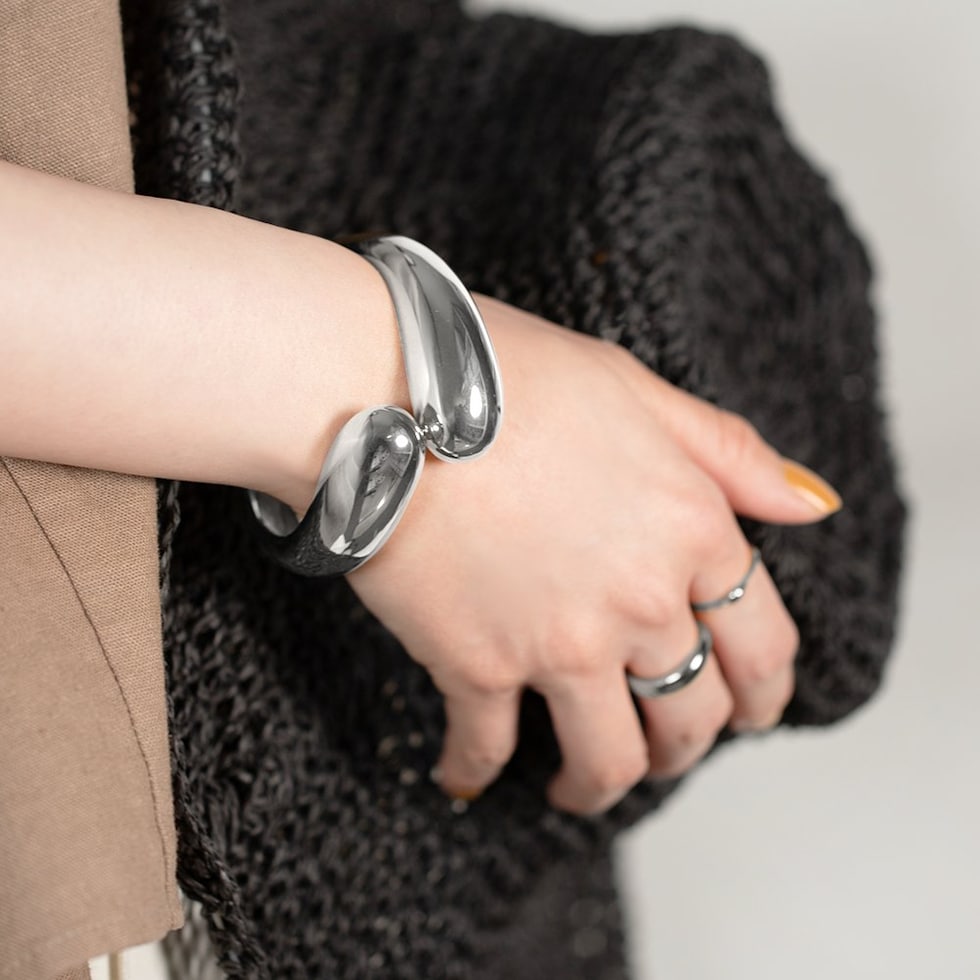 ドロップのようなぷっくりシルエットがこなれ感たっぷりなメタルバングル。艶やかなメタルとほど良く重みがあり高見えするアイテム。手元コーデを格上げする主役級のデザインが、これからの季節に重宝しそう◎開閉式タイプでカチッと留まるから着脱も簡単です。