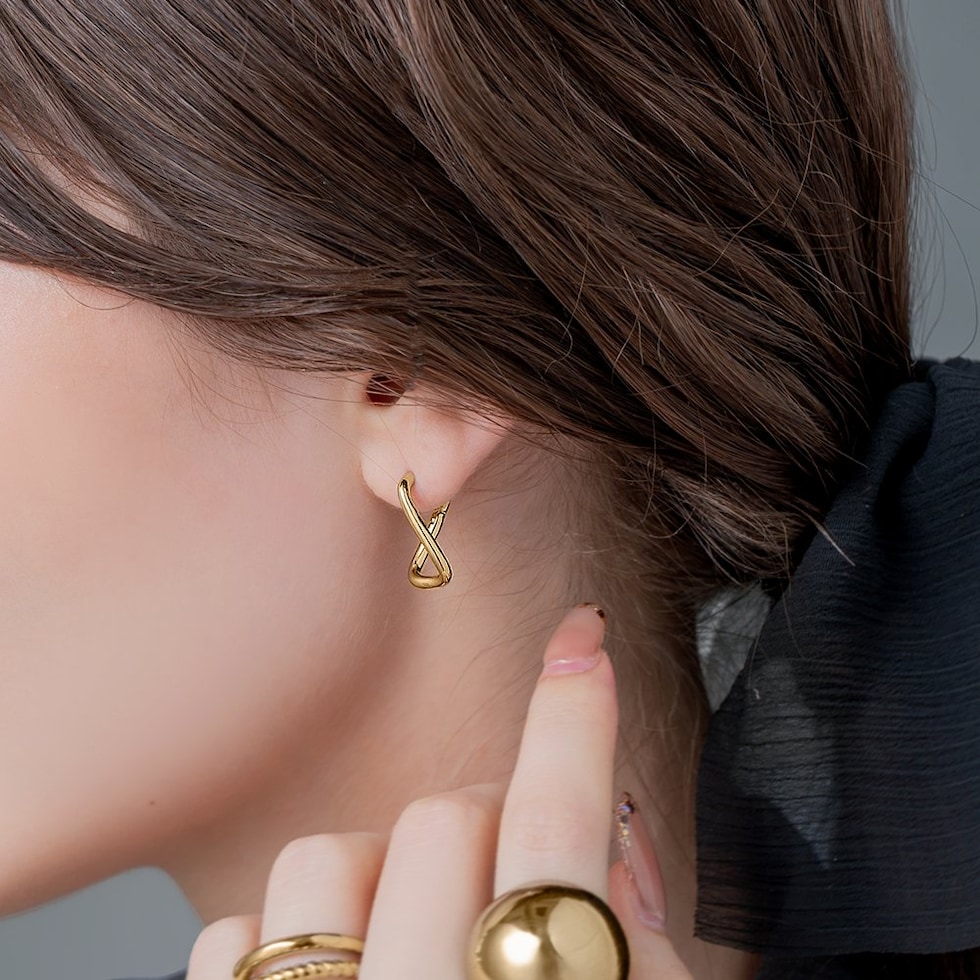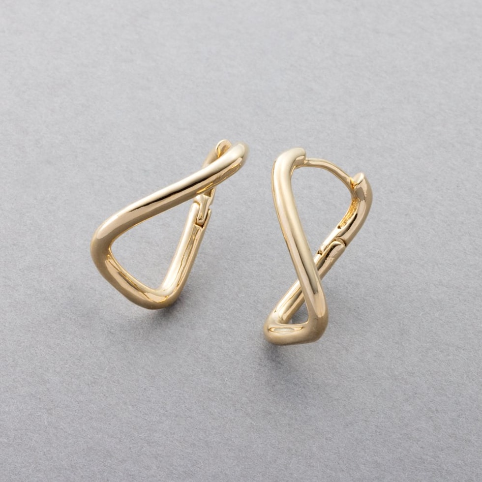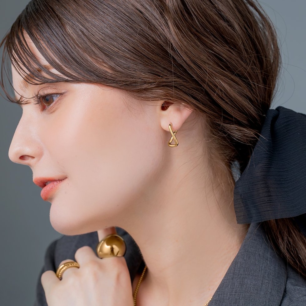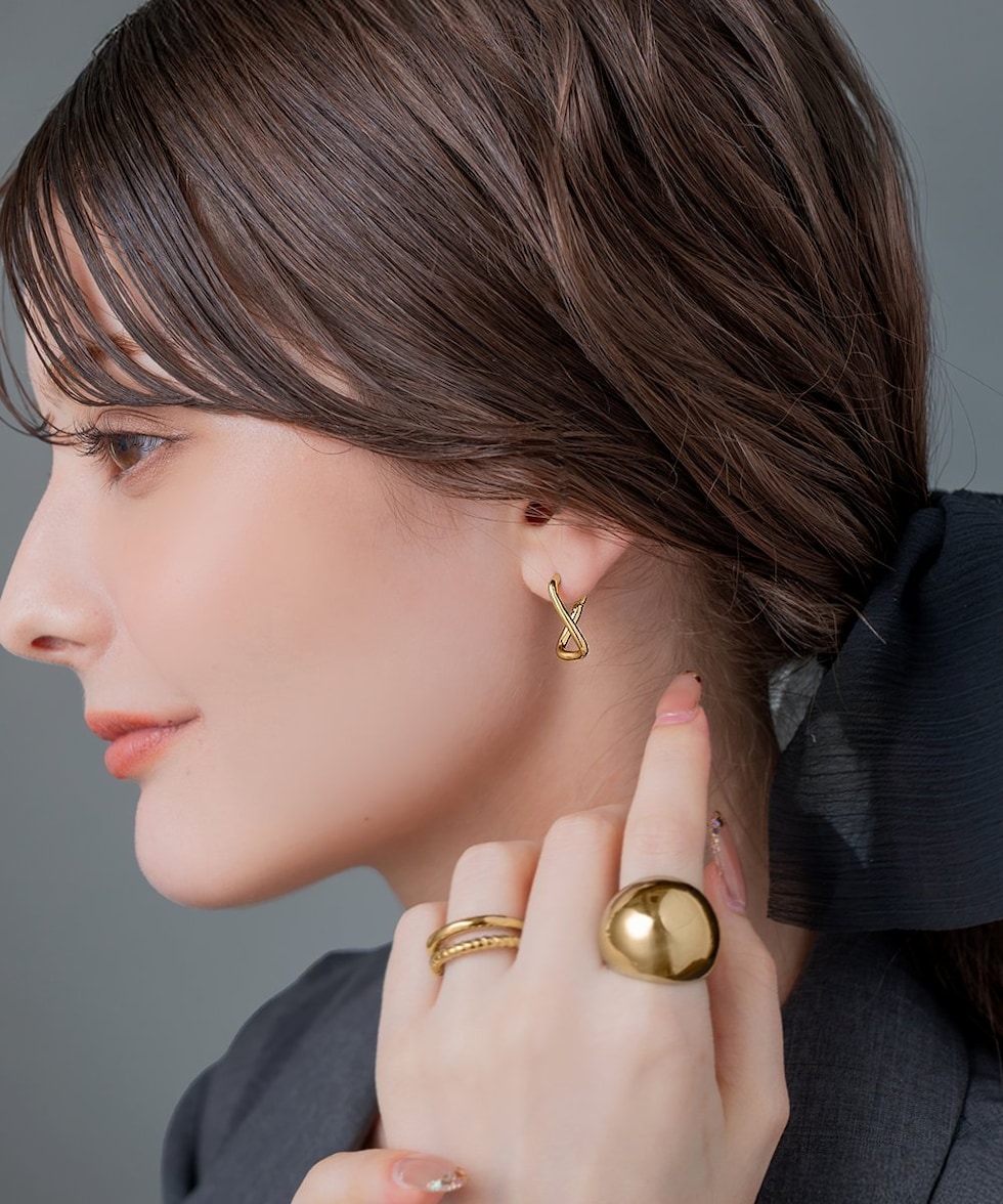 立体的なクロスラインのフープピアス。角度によって印象が違う個性的なフォルムがグッとこなれた雰囲気に仕上がるひと品。程よく目を惹く、コーデのアクセントにオススメのデザインです。