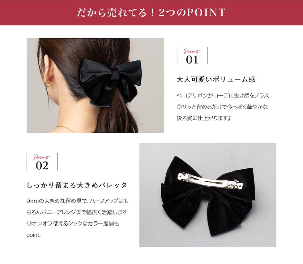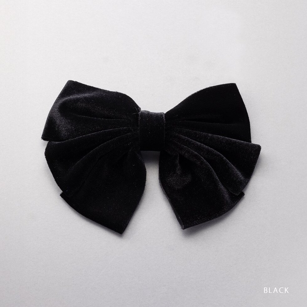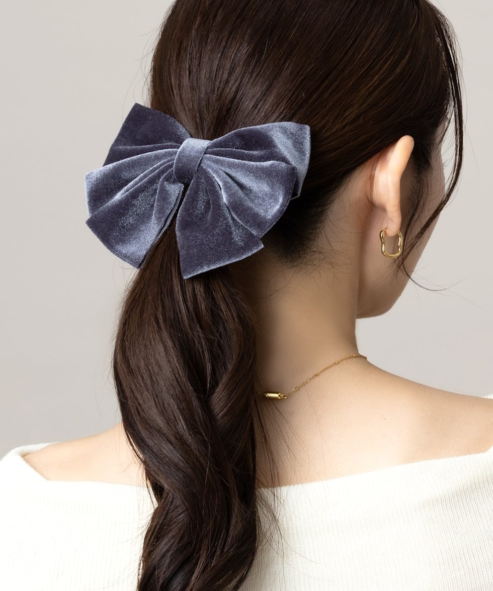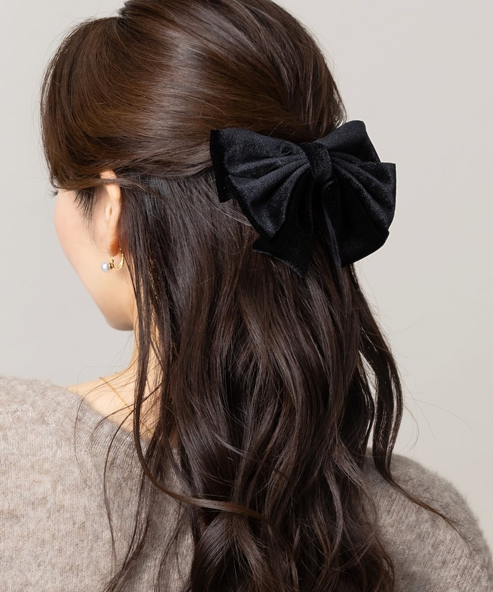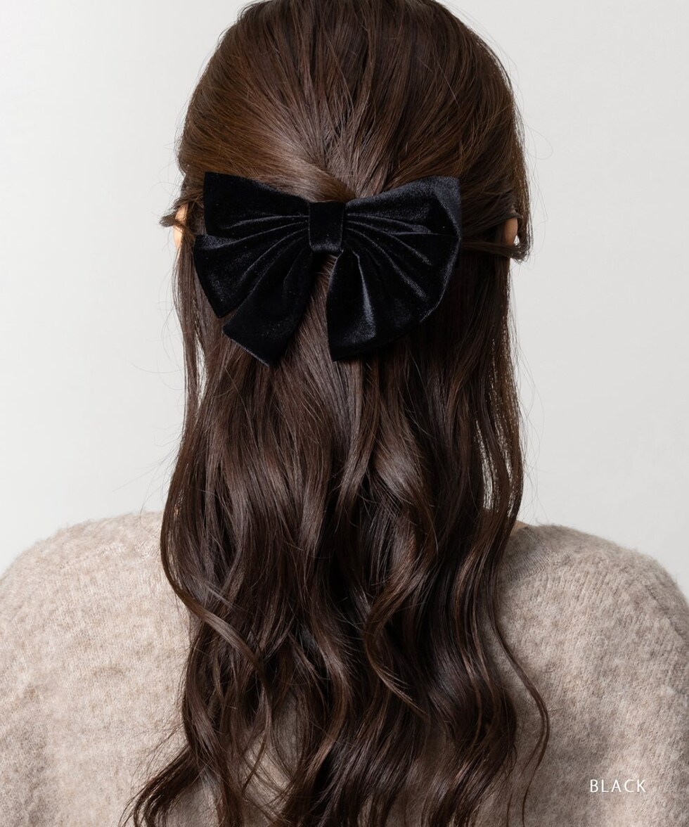 シックなカラーリングのベロアリボンを重ねたバレッタ。ボリュームたっぷりでさっと留めるだけで華やかなアレンジに仕上がります。デイリーはもちろん、オケージョンにも使えるアイテム◎