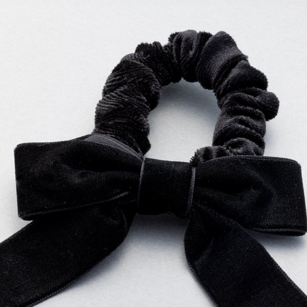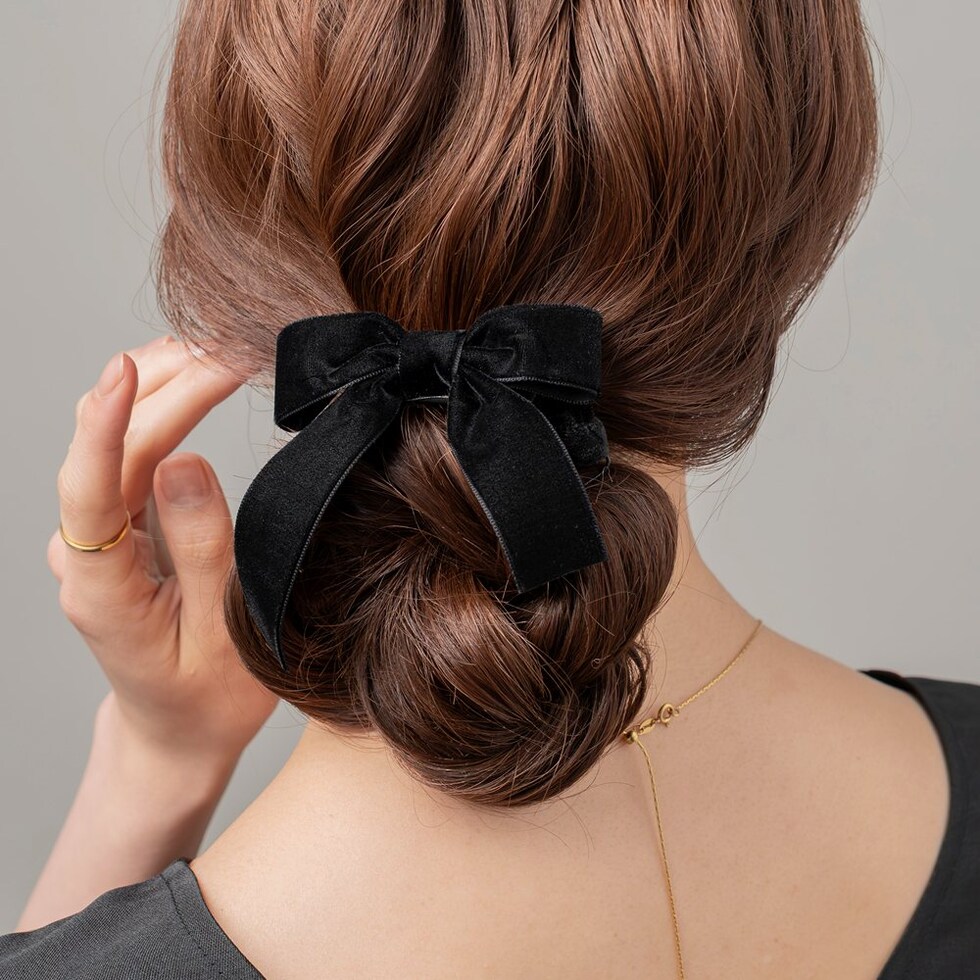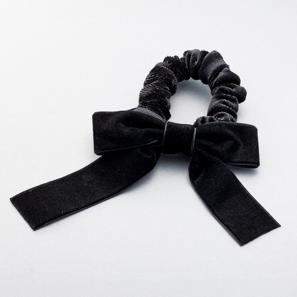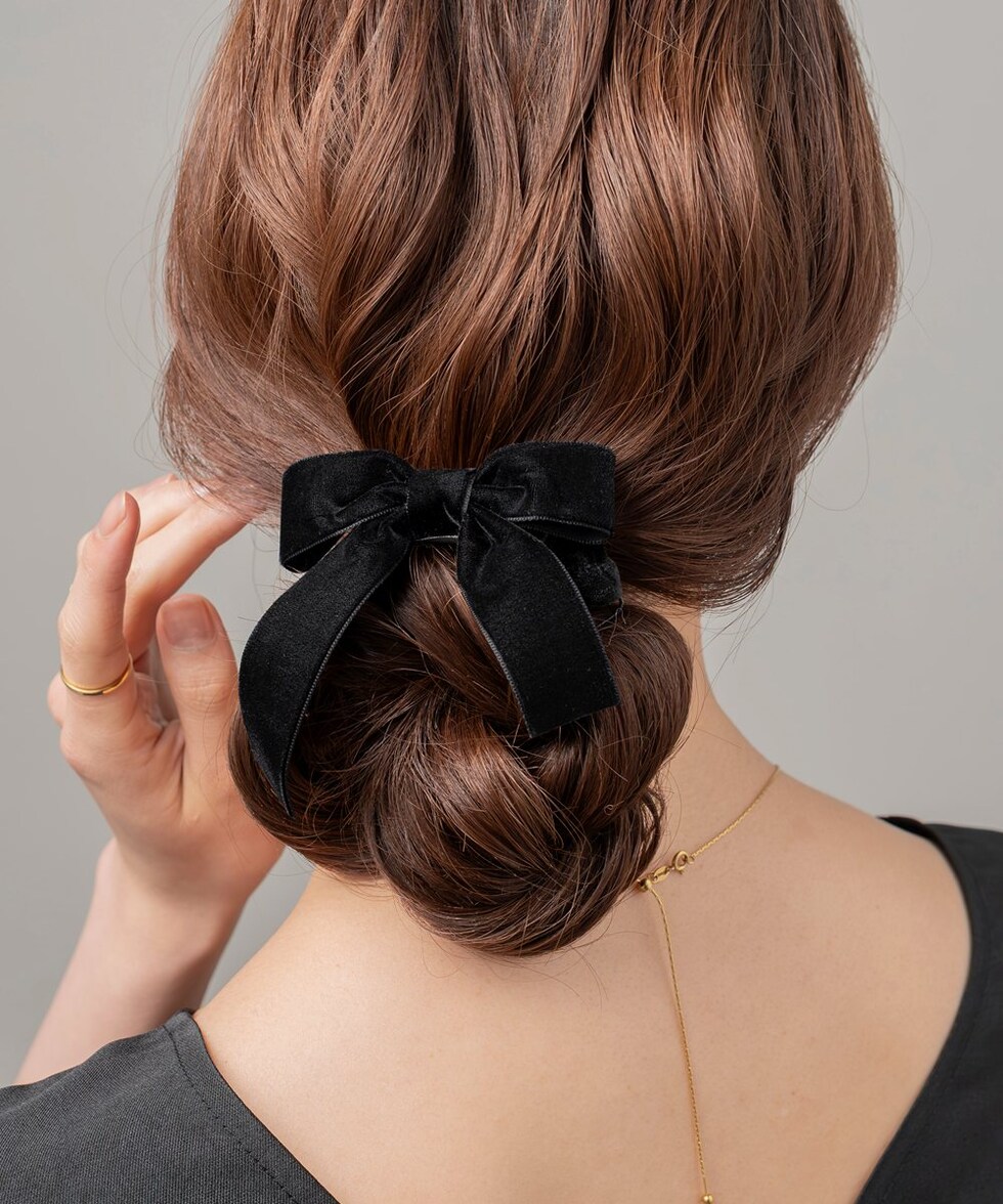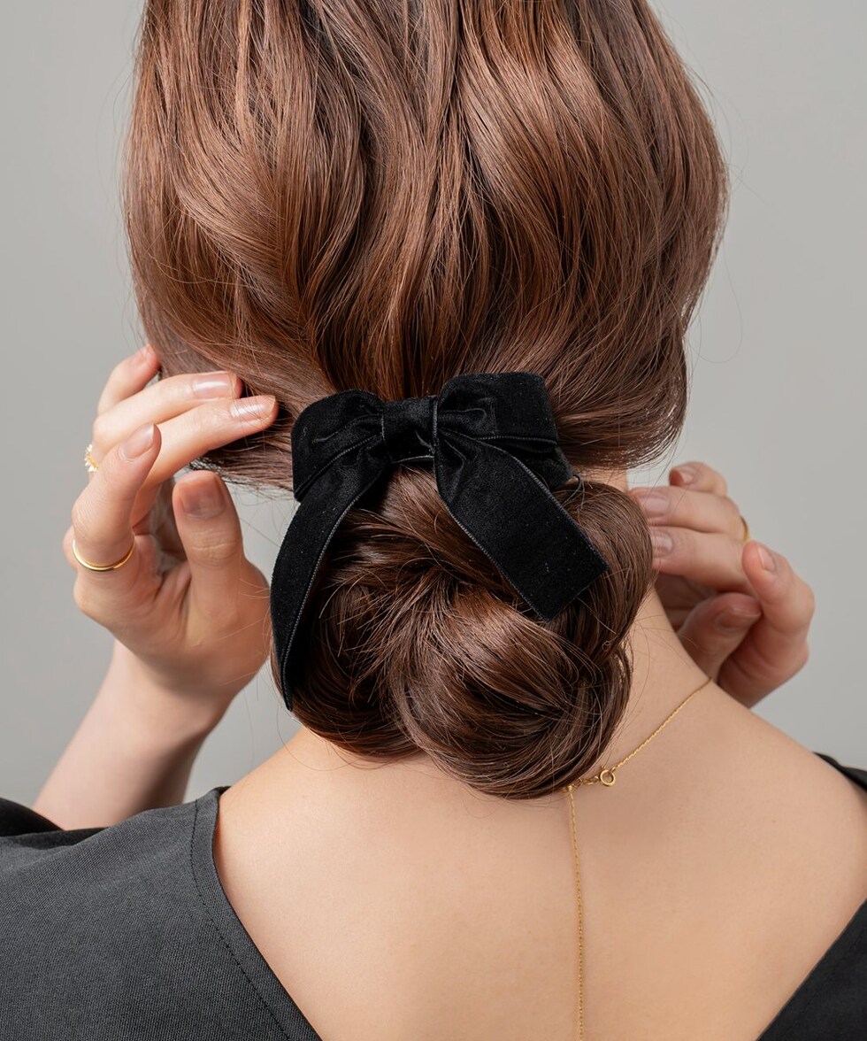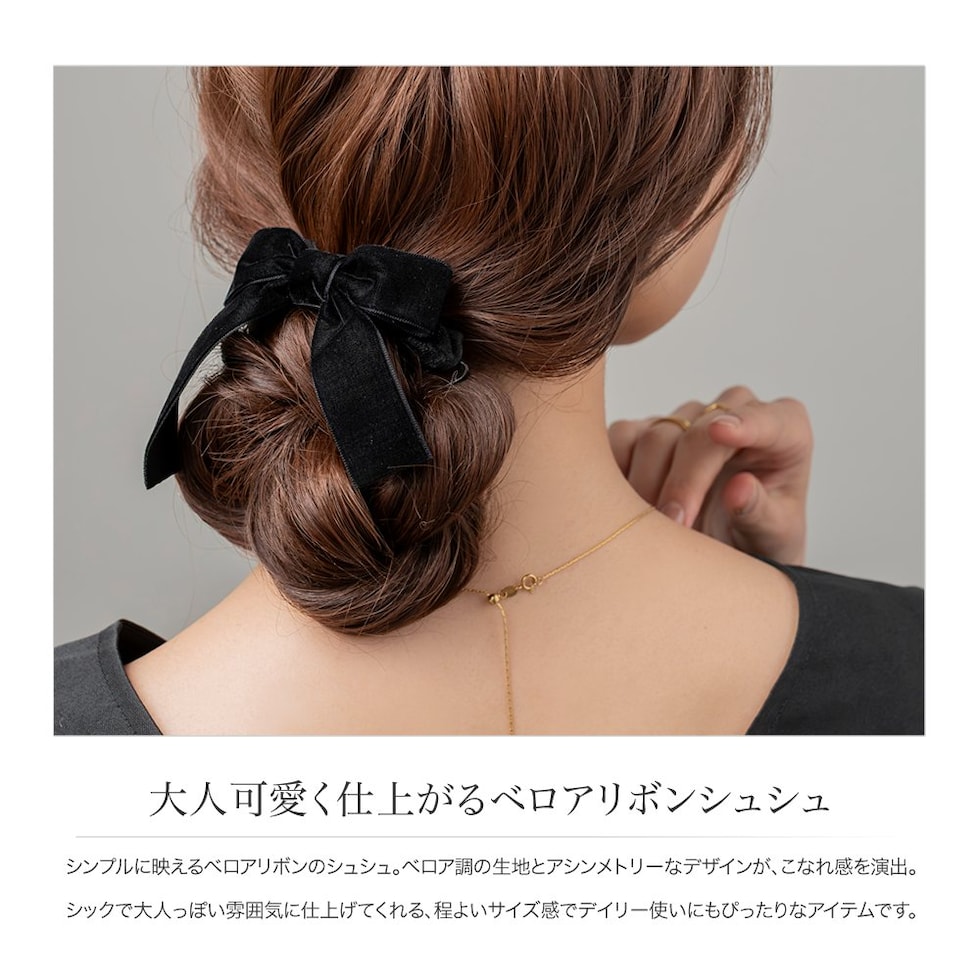 シンプルに映えるベロアリボンのシュシュ。ベロア調の生地とアシンメトリーなデザインが、こなれ感を演出。シックで大人っぽい雰囲気に仕上げてくれる、程よいサイズ感でデイリー使いにもぴったりなアイテムです。