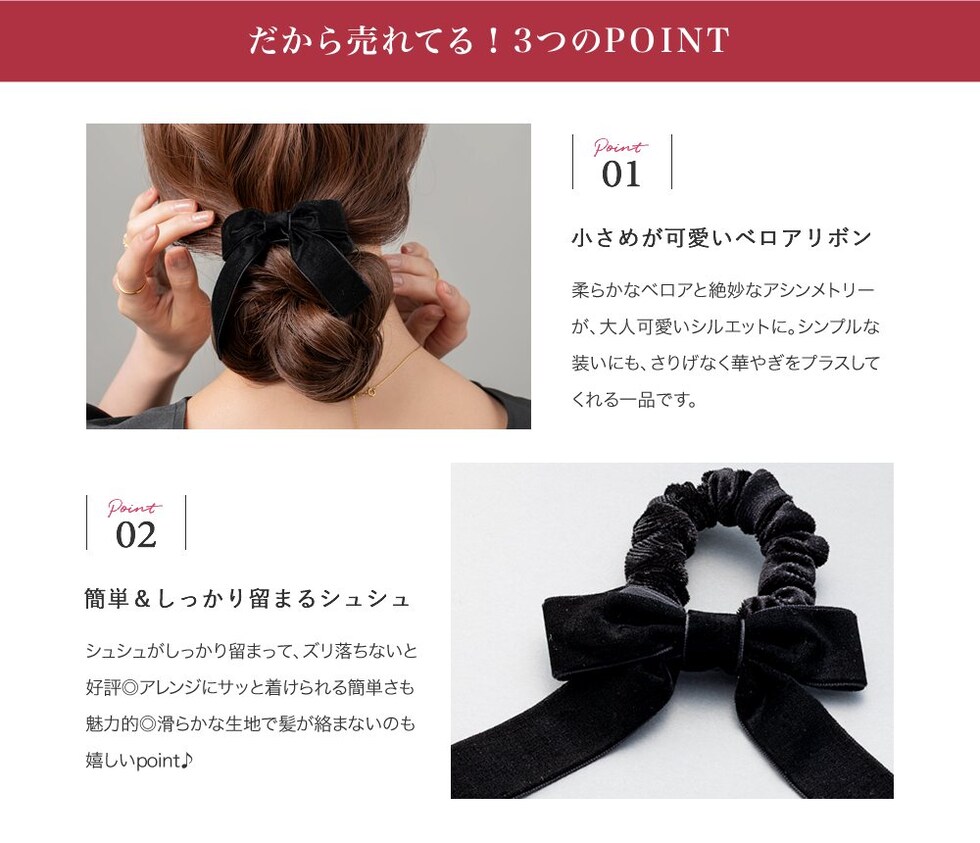 シュシュがしっかり留まって、ズリ落ちないと好評◎アレンジにサッと着けられる簡単さも魅力的◎滑らかな生地で髪が絡まないのも嬉しいpoint♪