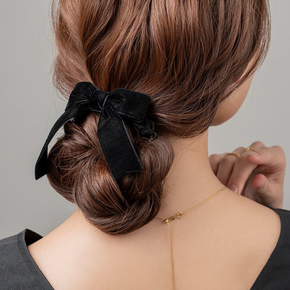 ヘアアクセサリー レディース シュシュ リボン ベロア ベルベット 光沢感 アシンメトリー 小さめ ヘアゴム ヘアアクセ ヘアアレンジ 簡単 まとめ髪 髪留め シック cream dot ゆうパケット [ブラック_ワンサイズ]