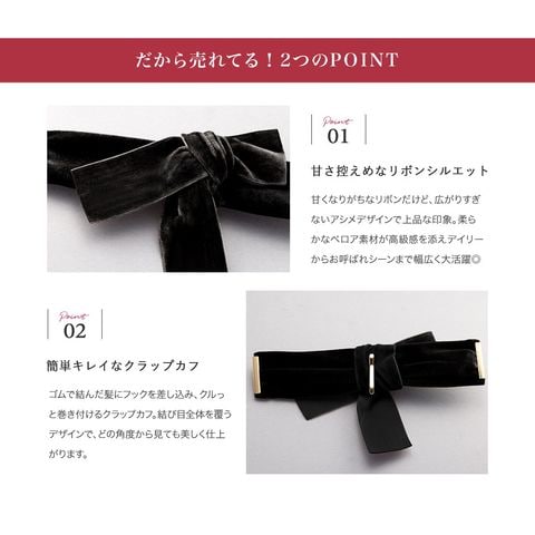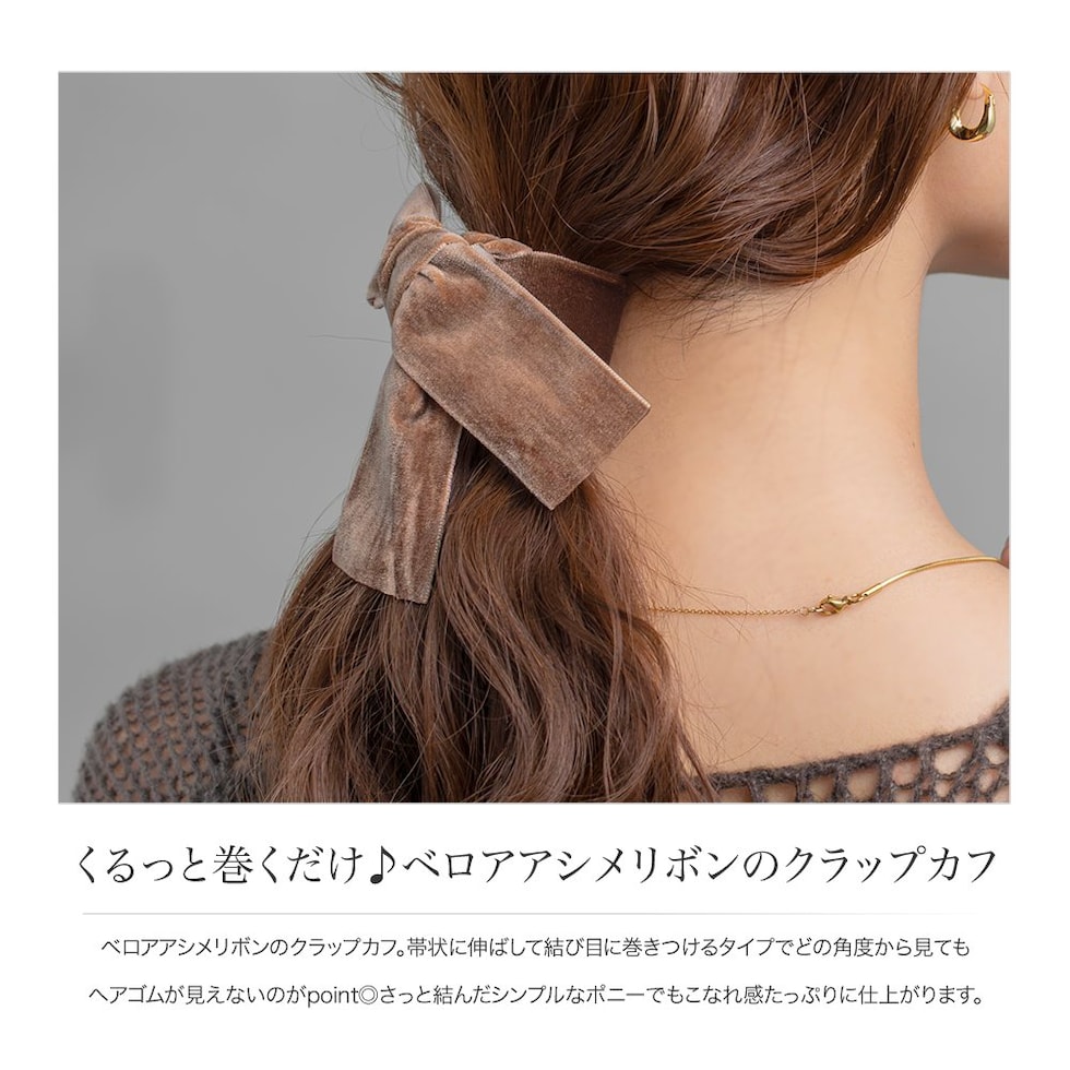 ベロアアシメリボンのクラップカフ。帯状に伸ばして結び目に巻きつけるタイプでどの角度から見てもヘアゴムが見えないのがpoint◎さっと結んだシンプルなポニーでもこなれ感たっぷりに仕上がります。