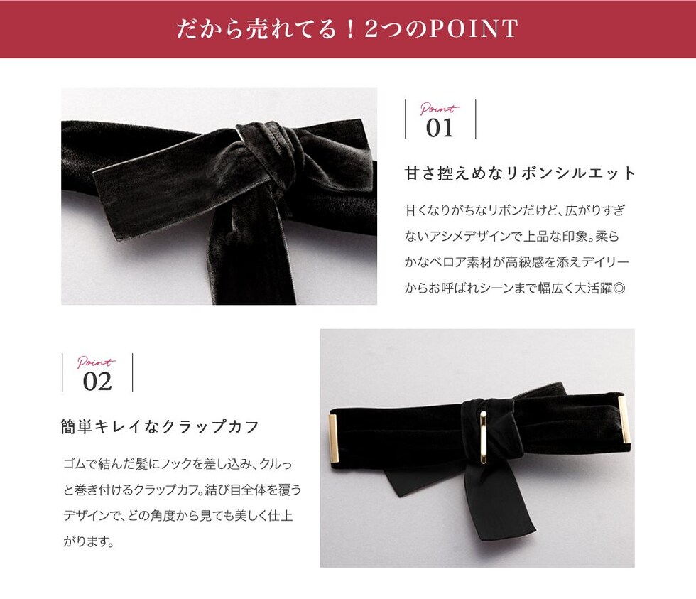 ゴムで結んだ髪にフックを差し込み、クルっと巻き付けるクラップカフ。結び目全体を覆うリボンで角度から見ても美しく仕上がります。
