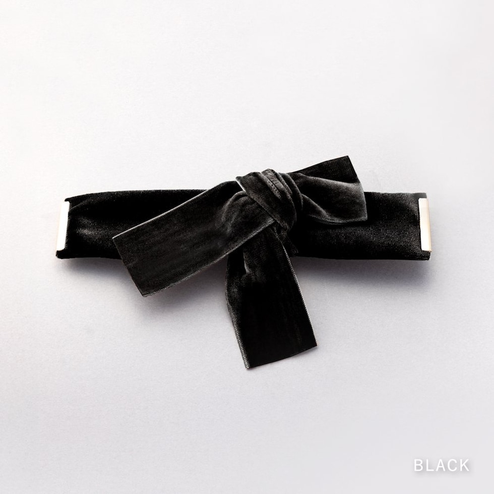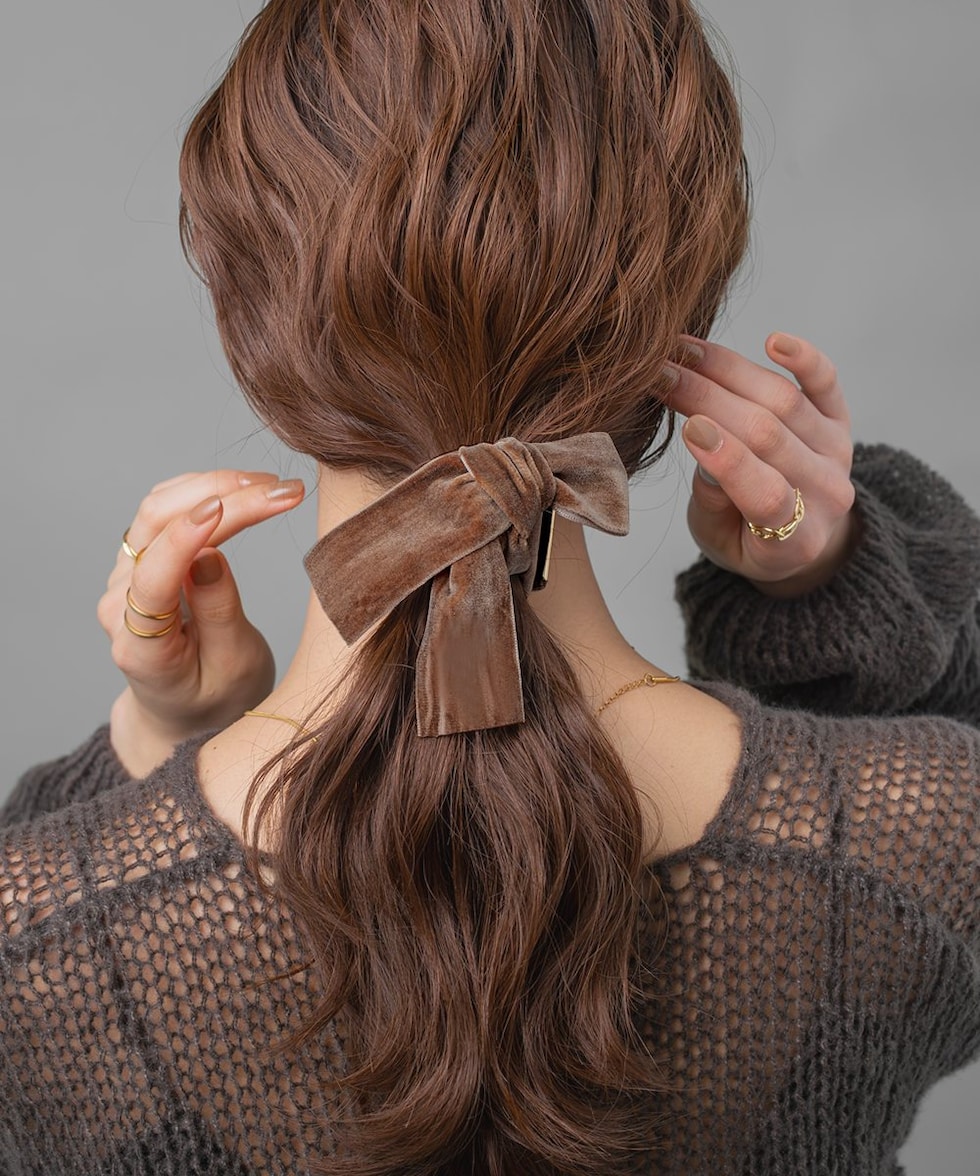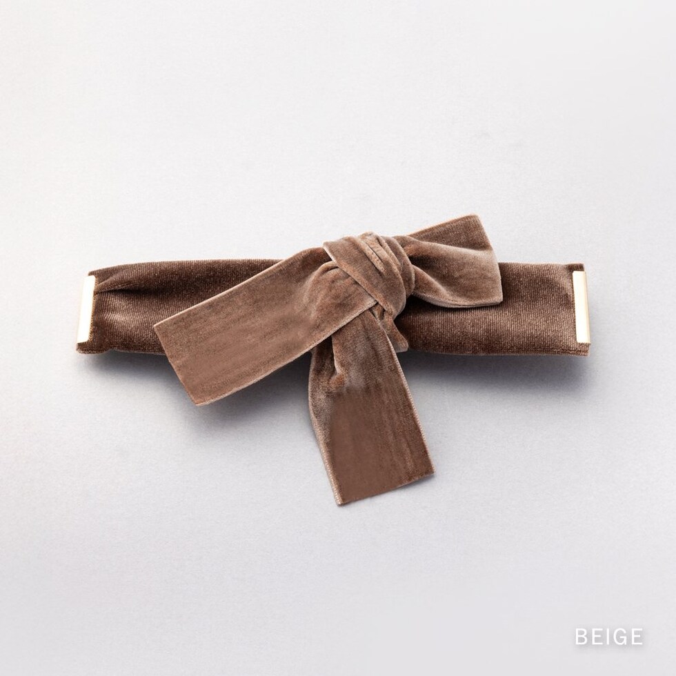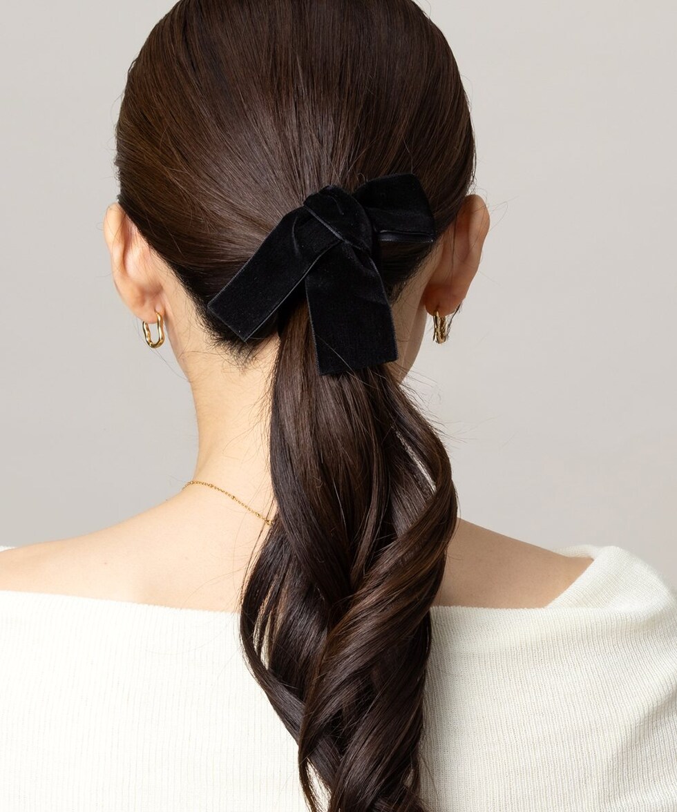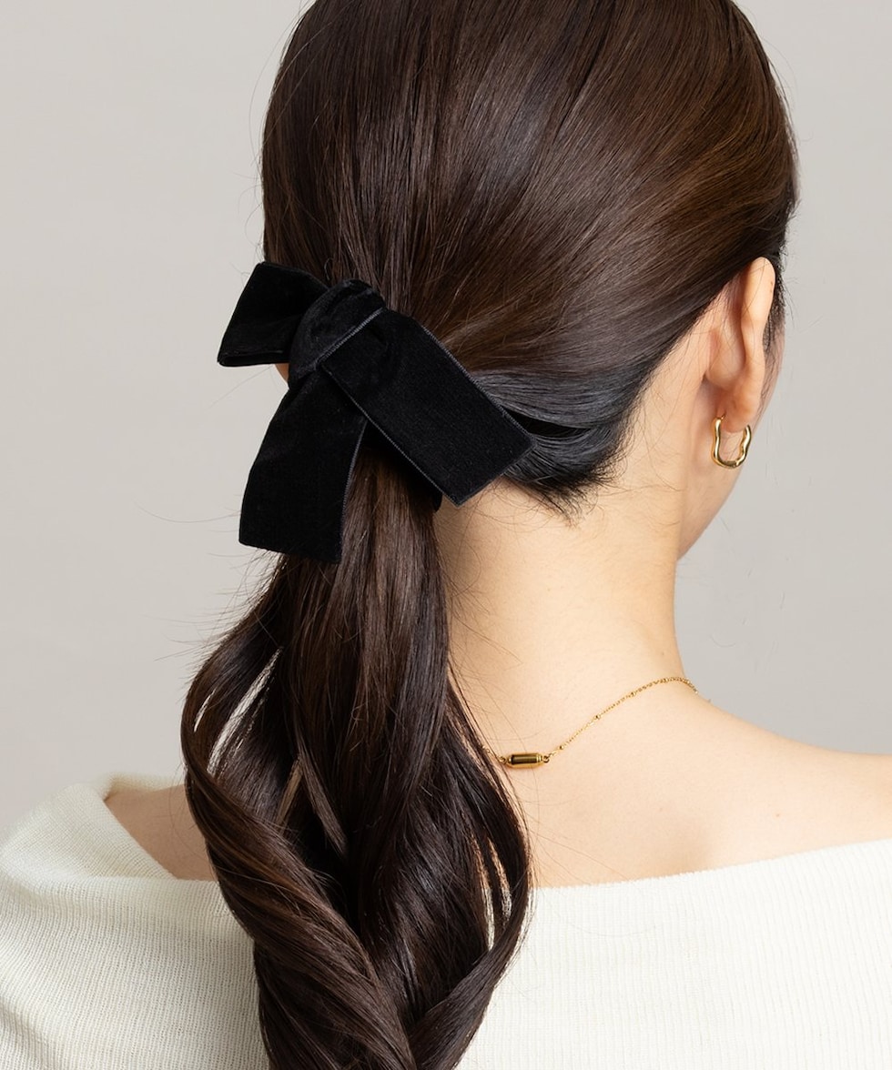 甘くなりがちなリボンだけど、広がりすぎないアシメデザインで上品な印象。柔らかなベロア素材が高級感を添えデイリーからお呼ばれシーンまで幅広く大活躍◎