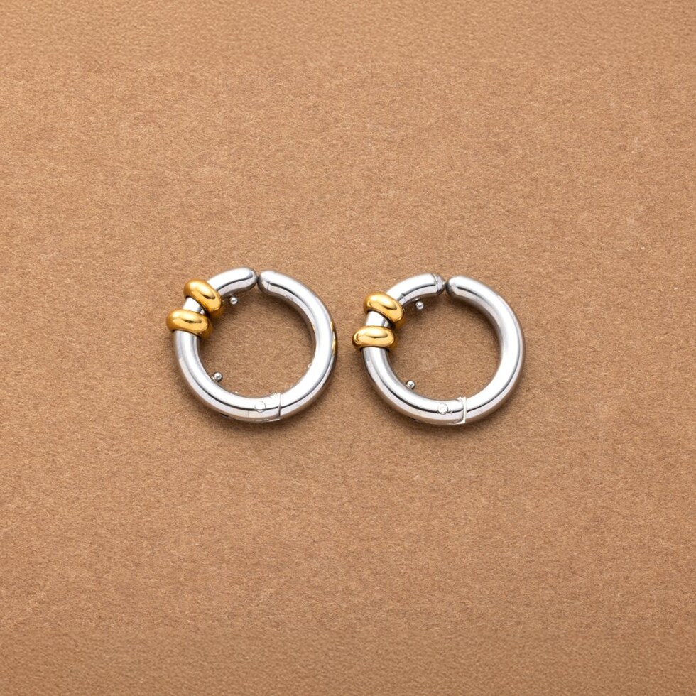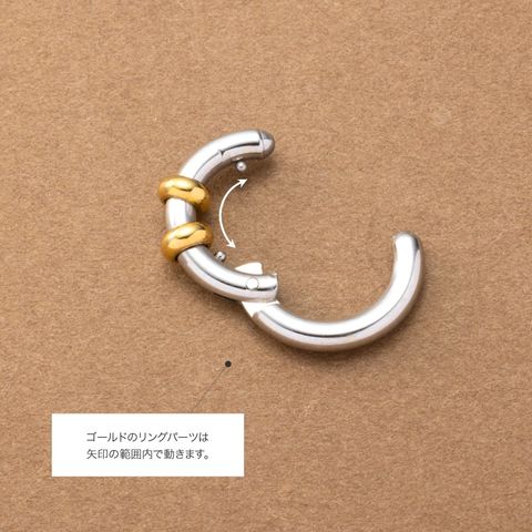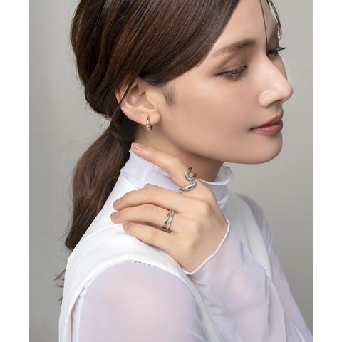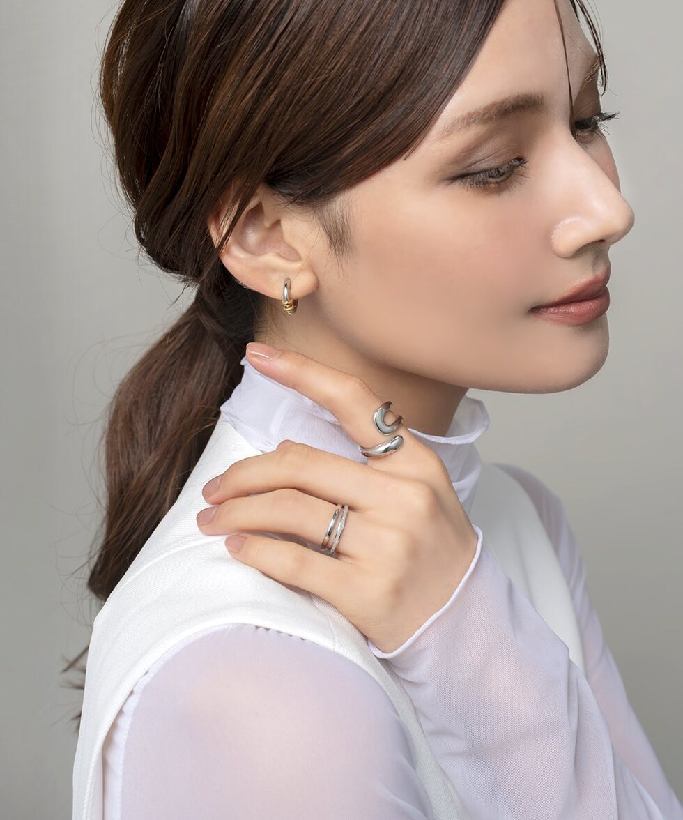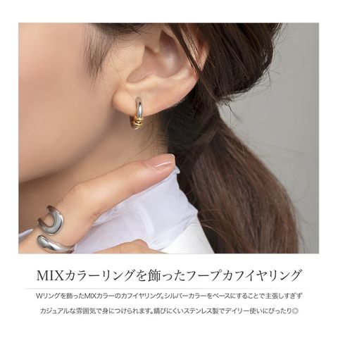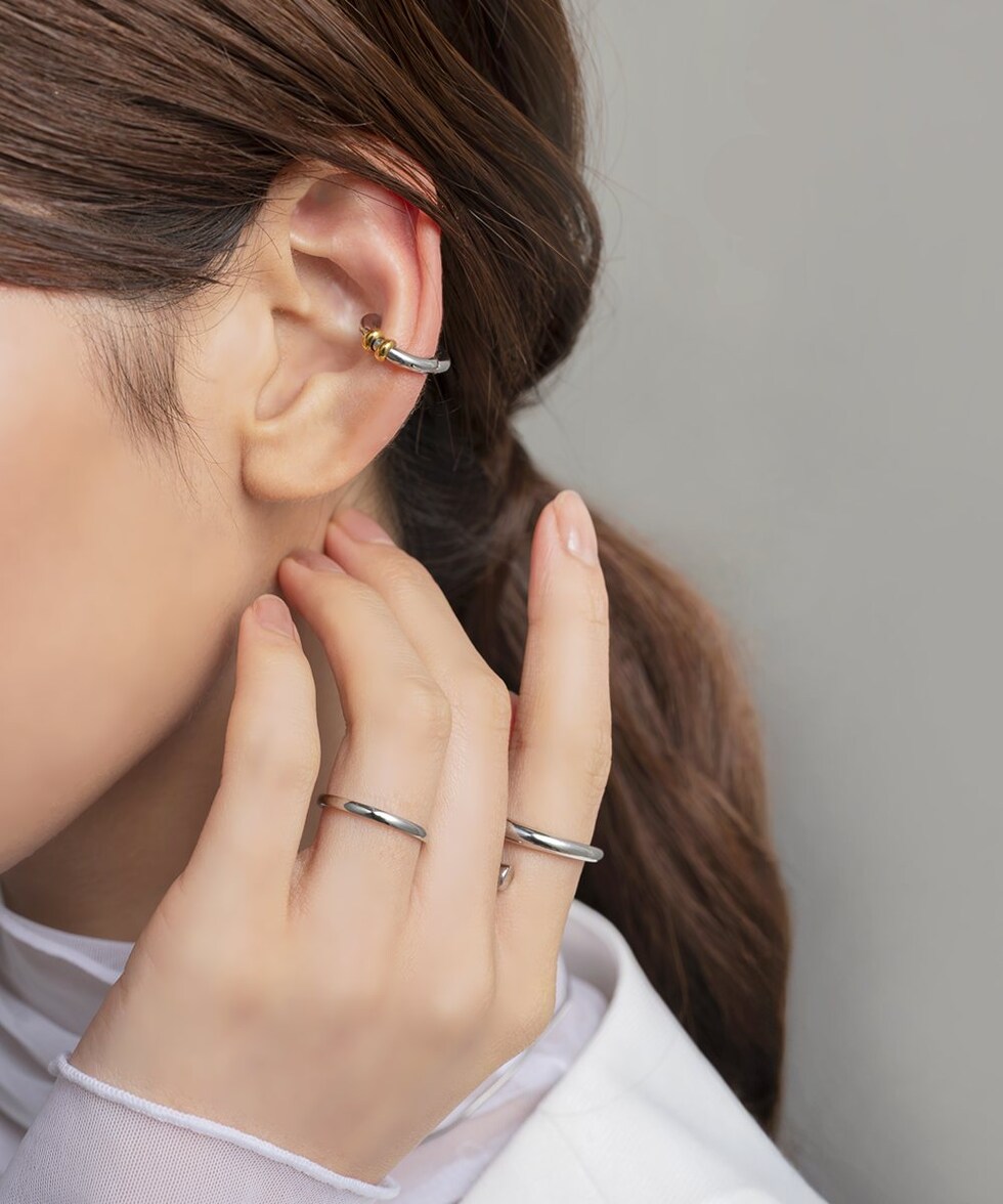 Wリングを飾ったMIXカラーのカフイヤリング。シルバーカラーをベースにすることで、主張しすぎずカジュアルな雰囲気で身につけられます。錆びにくいステンレス製でデイリー使いにぴったり◎