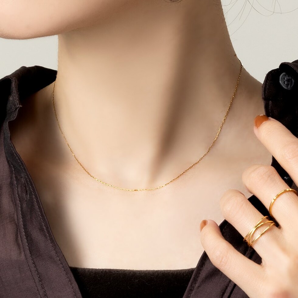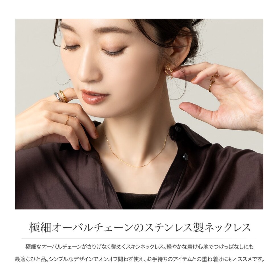 極細なオーバルチェーンがさりげなく艶めくスキンネックレス。軽やかな着け心地でつけっぱなしにも最適なひと品。シンプルなデザインでオンオフ問わず使え、お手持ちのアイテムとの重ね着けにもオススメです。