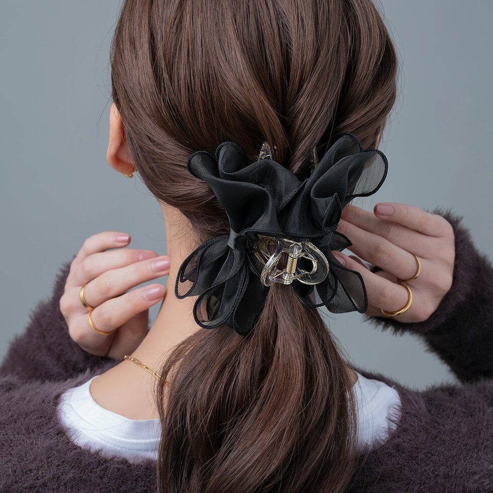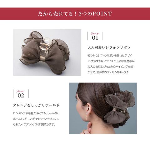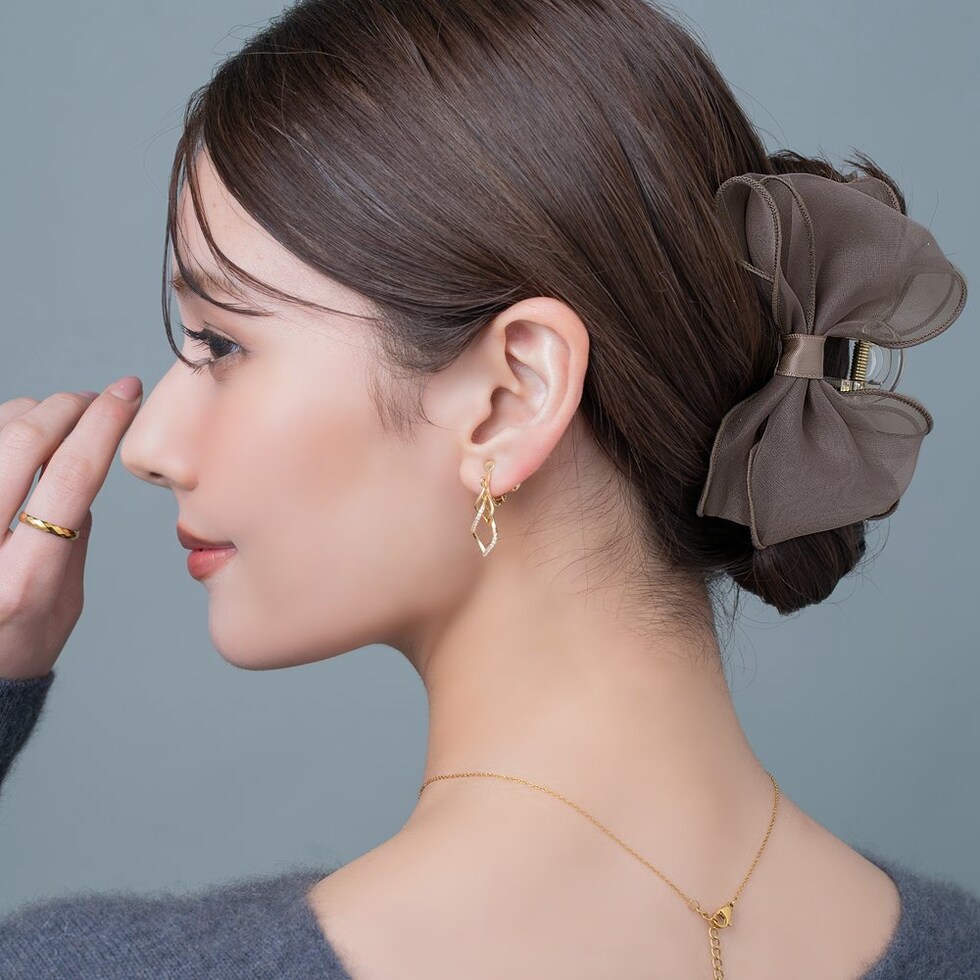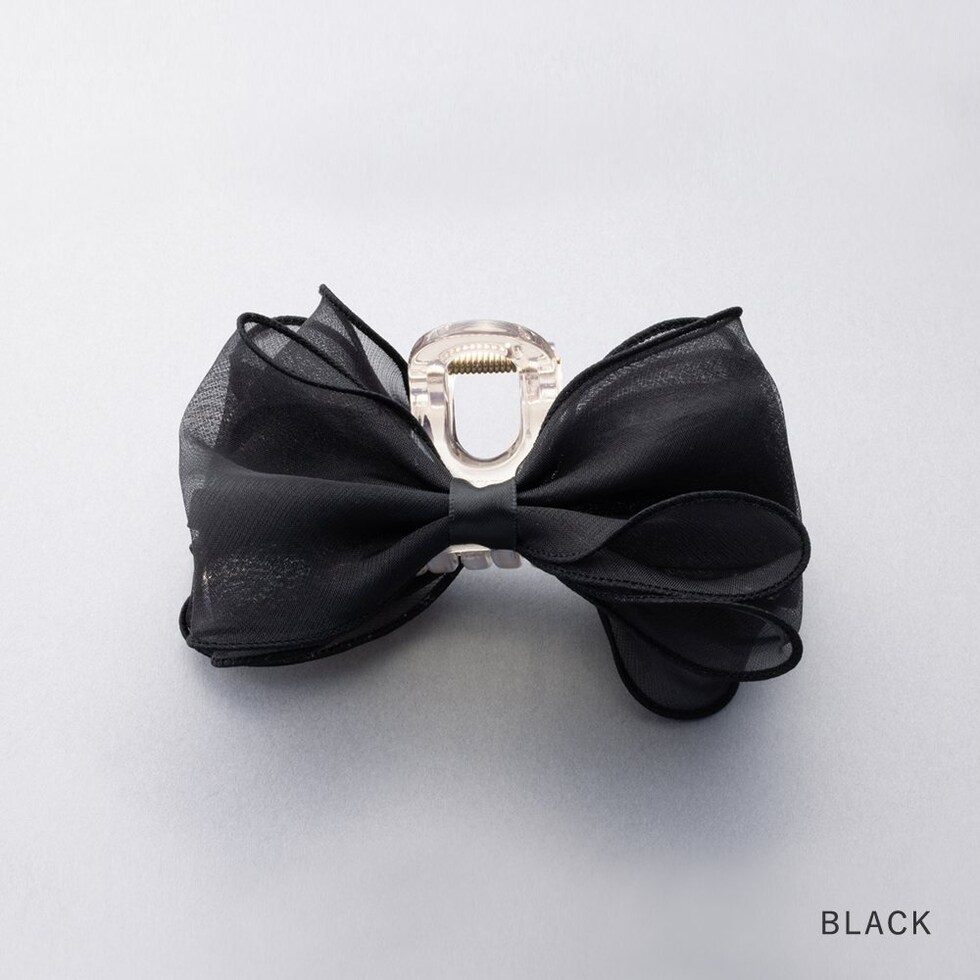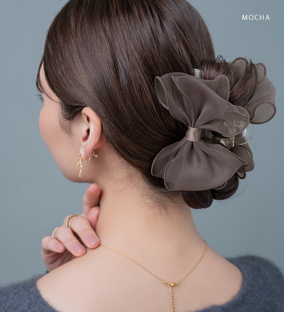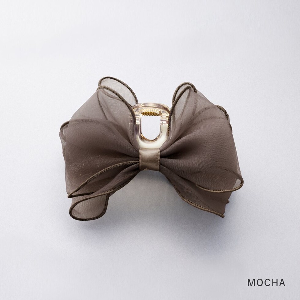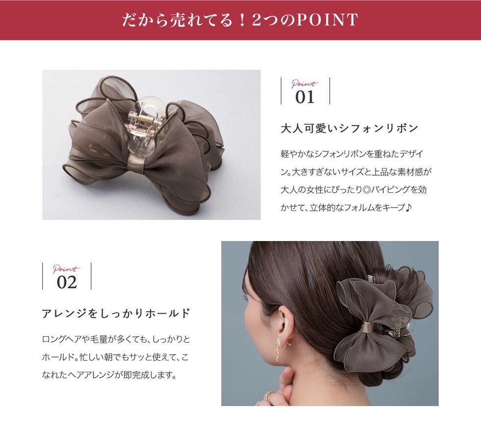 軽やかなシアー素材のシフォンリボンを重ねたバンスクリップ。大きすぎないリボンモチーフと上品な素材感が大人の女性でも取り入れやすいアイテム◎いつものまとめ髪にサッと挟むだけでこなれヘアが完成します。