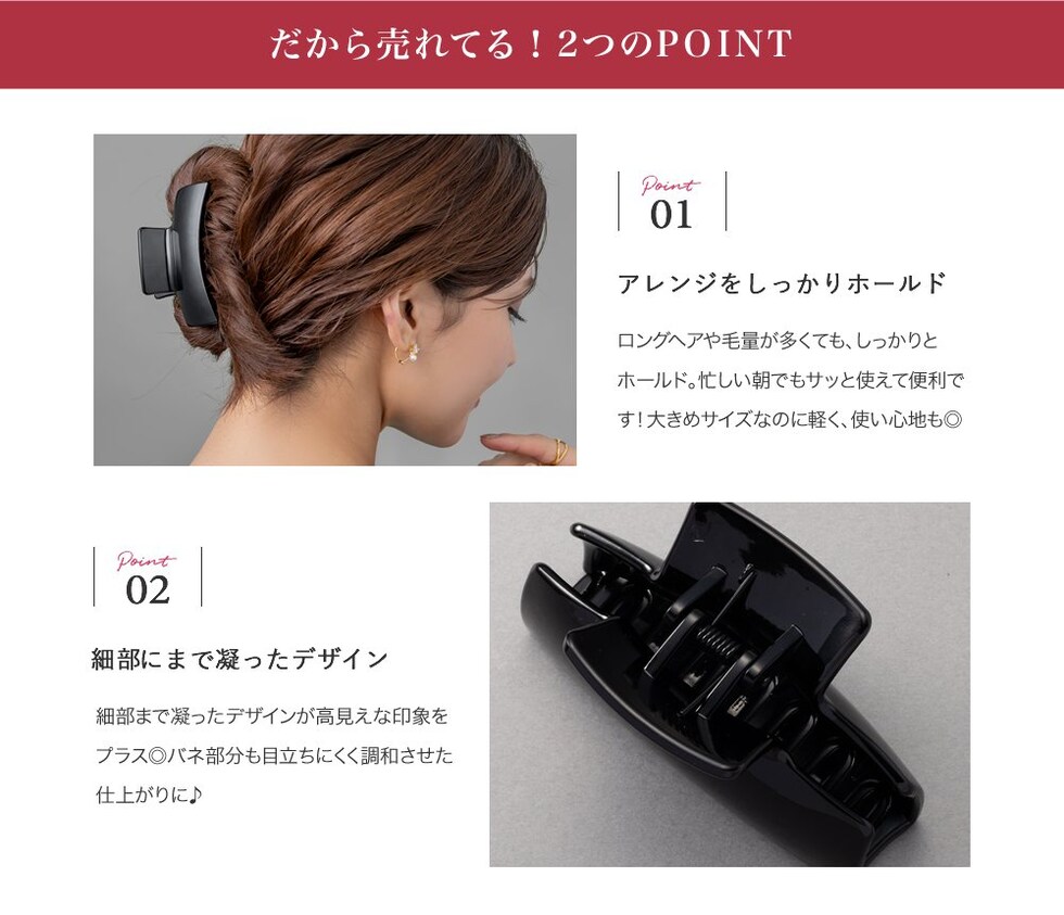 ロングヘアや毛量が多くても、しっかりとホールド。忙しい朝でもサッと使えて便利です!大きめサイズなのに軽く、使い心地も◎