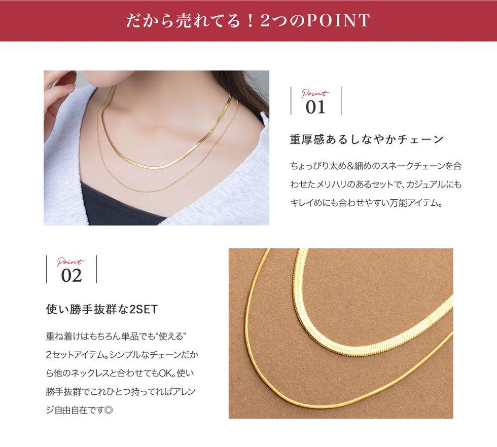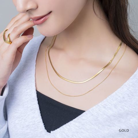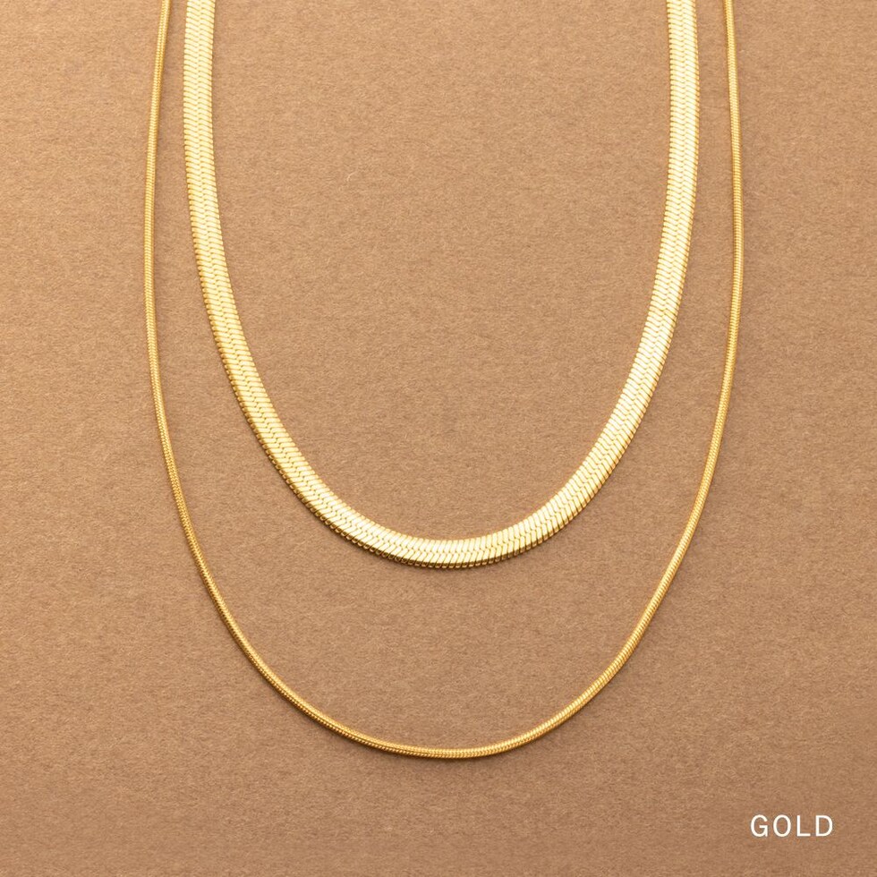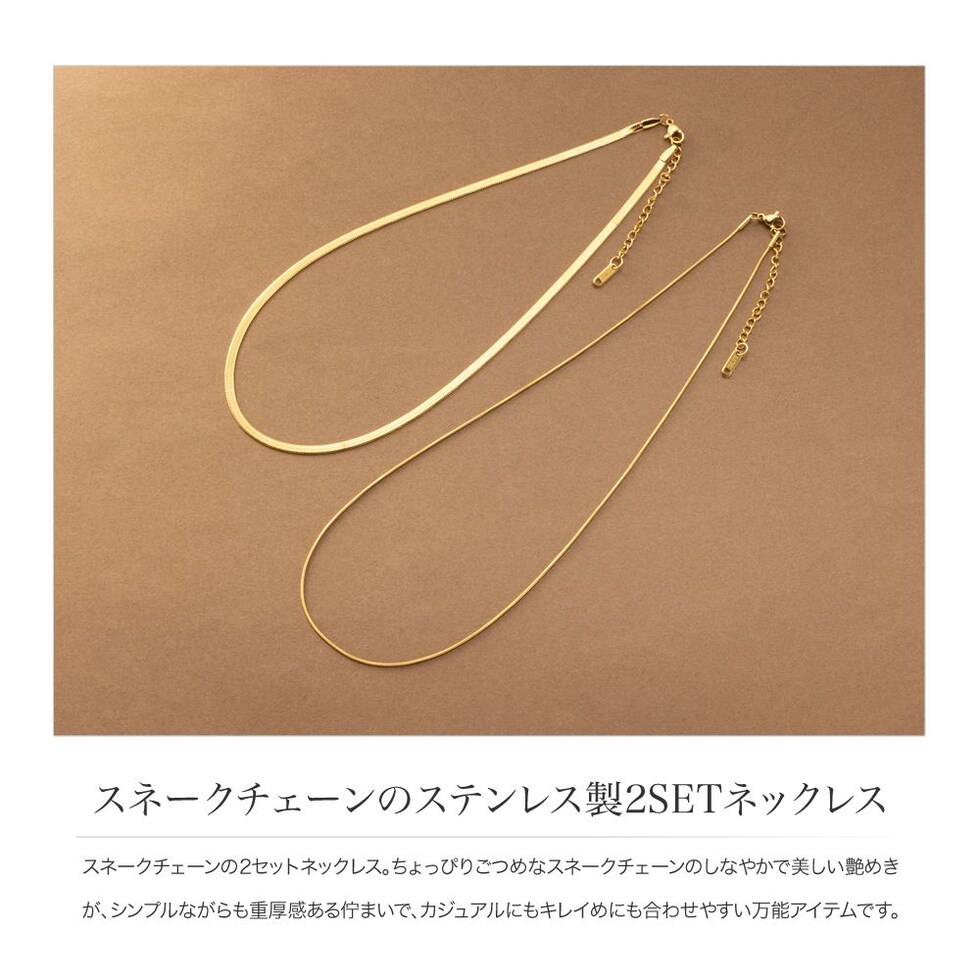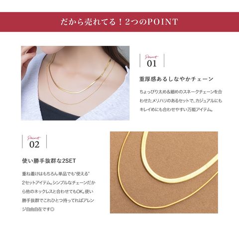 ちょっぴり太め&細めのスネークチェーンを合わせたメリハリのあるセットで、カジュアルにもキレイめにも合わせやすい万能アイテム。