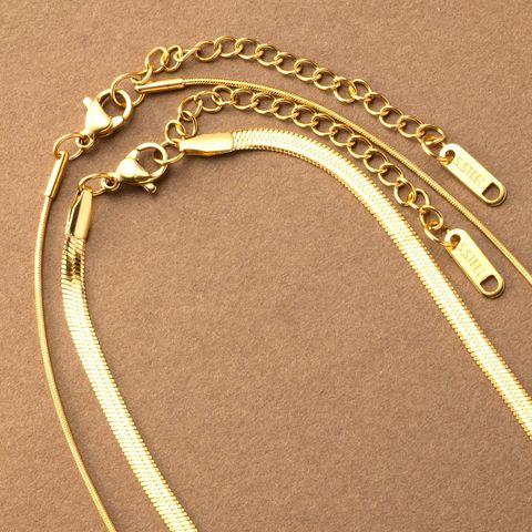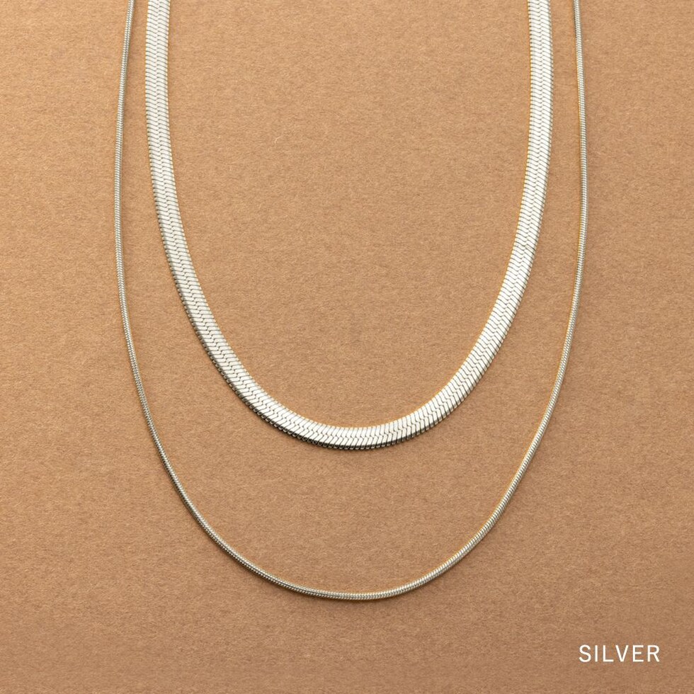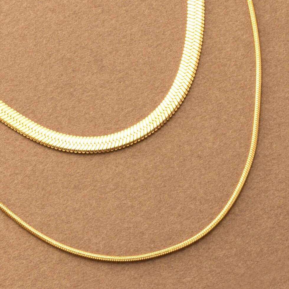スネークチェーンの2セットネックレス。ちょっぴりごつめなスネークチェーンのしなやかで美しい艶めきが、シンプルながらも重厚感ある佇まいで、カジュアルにもキレイめにも合わせやすい万能アイテムです。