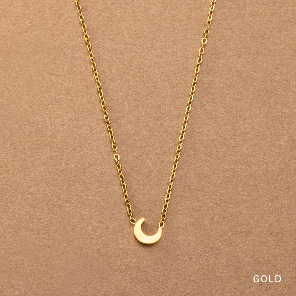 ムーンメタルのステンレス製ネックレス。シンプルで神秘的なシンボルが品のある大人びた表情に導いてくれます。主張しすぎないミニマルサイズでカジュアルスタイルのアクセント使いに重宝しそう◎