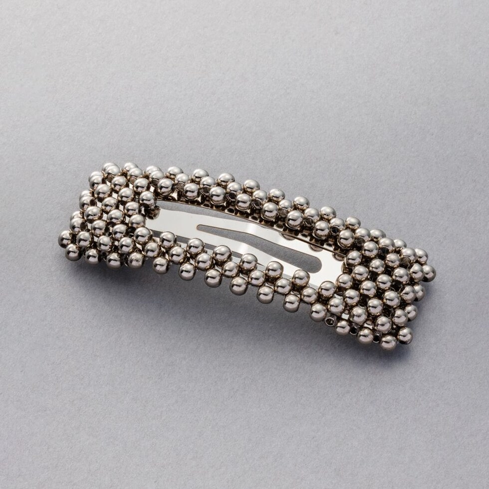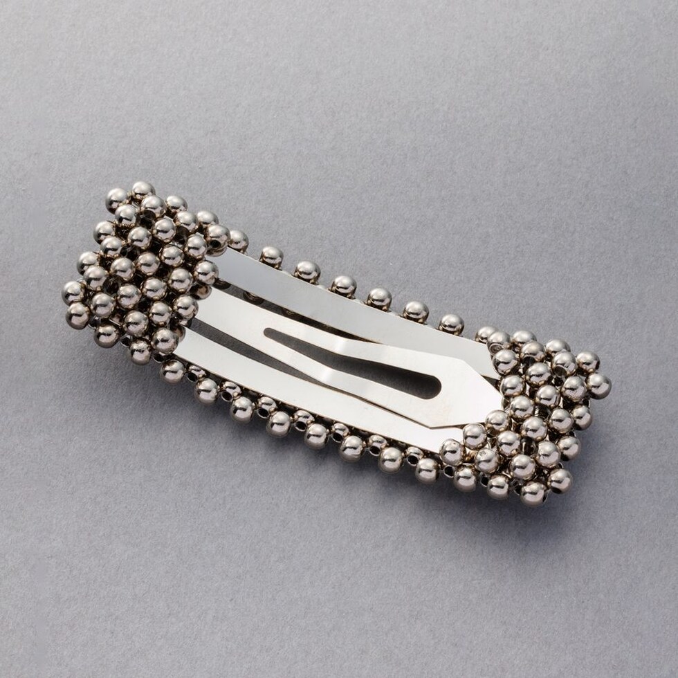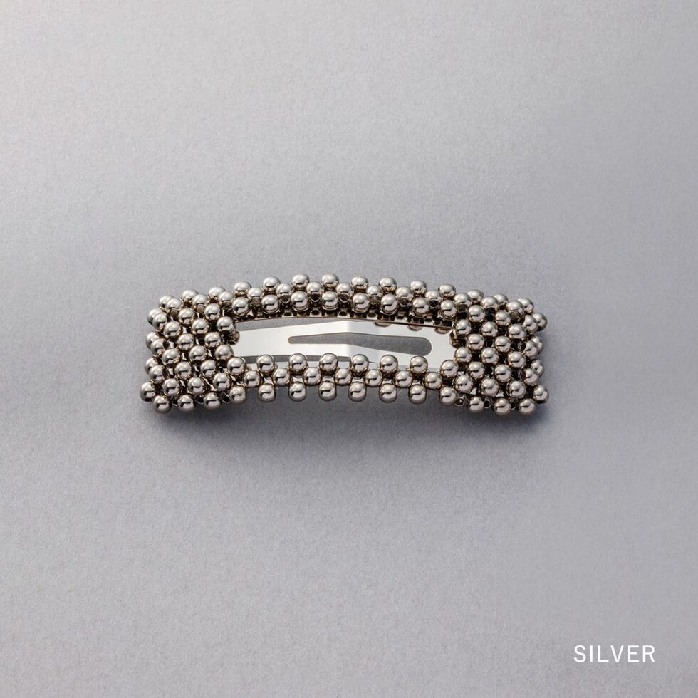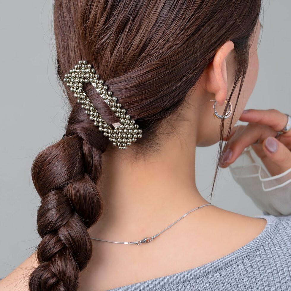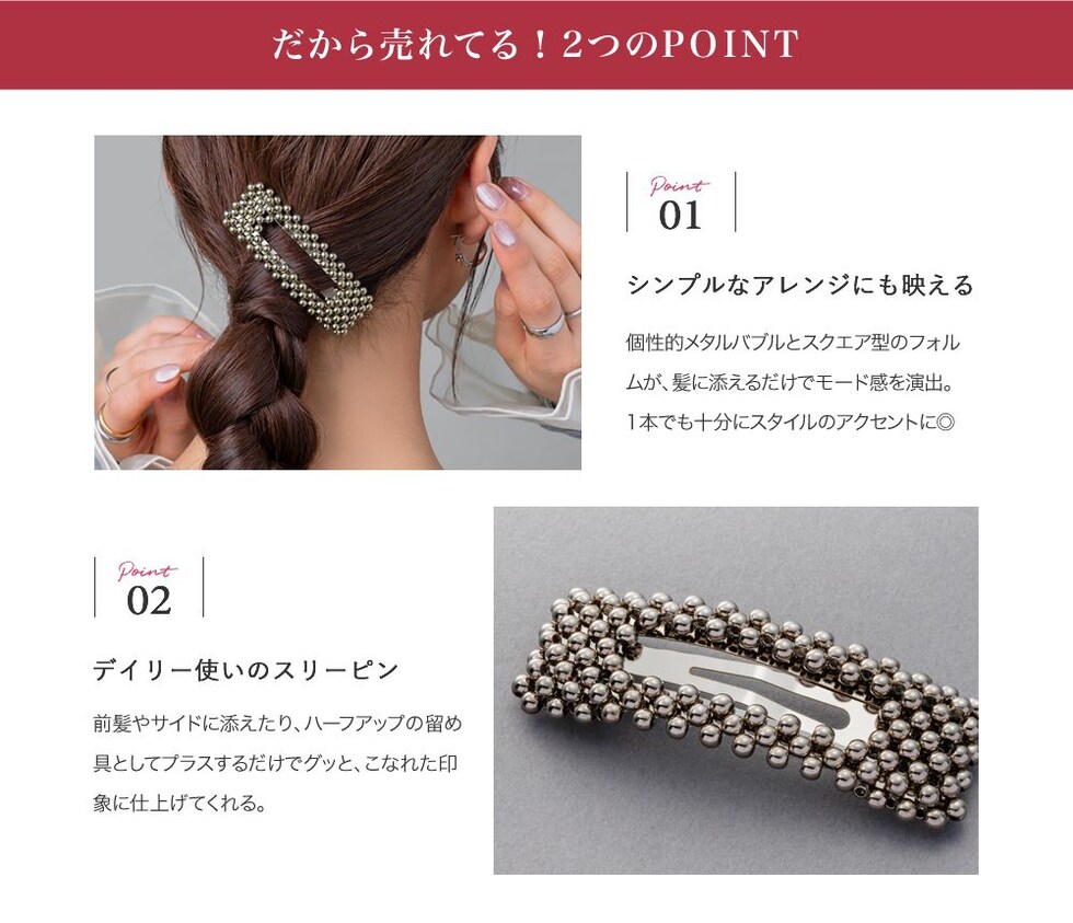 個性的メタルバブルとスクエア型のフォルムが、髪に添えるだけでモード感を演出。1本でも十分にスタイルのアクセントに◎