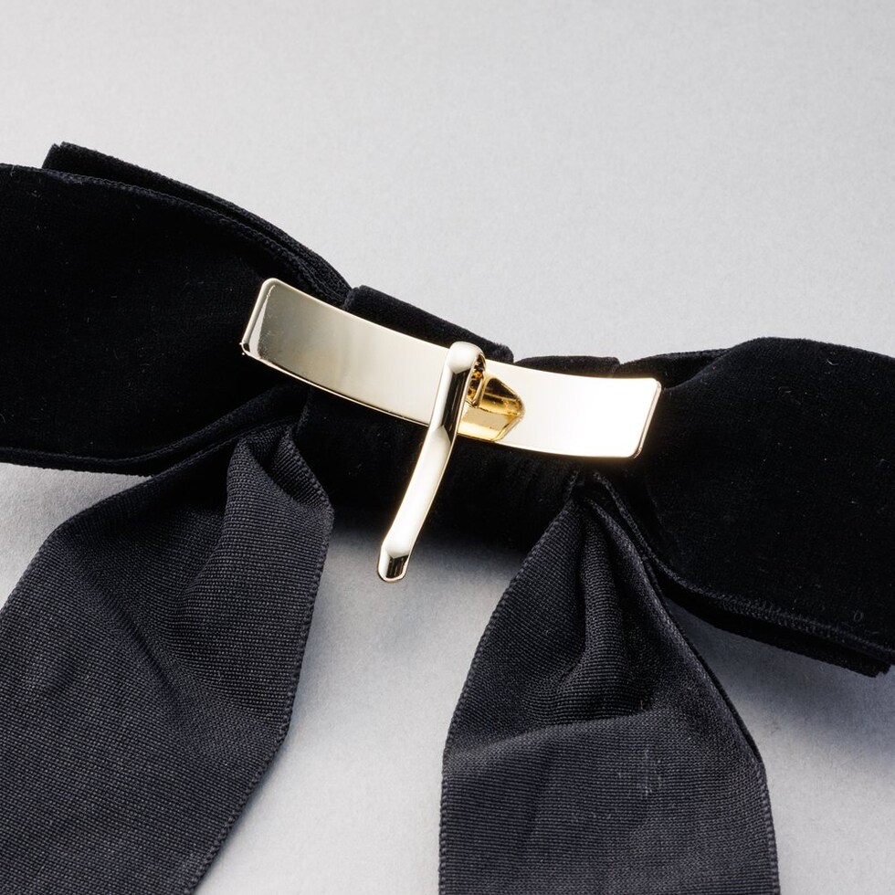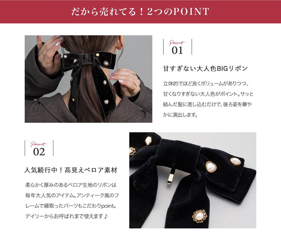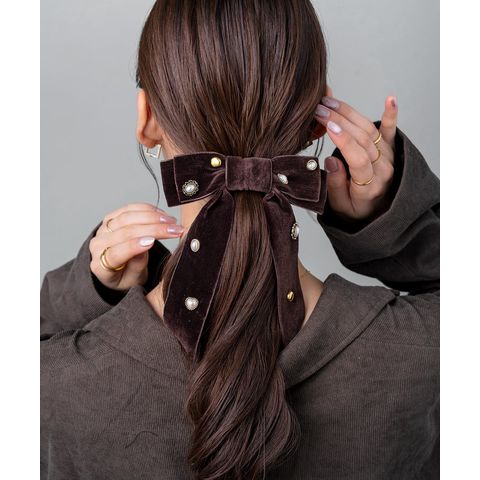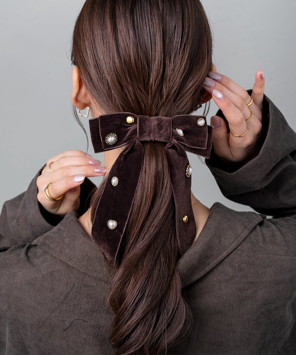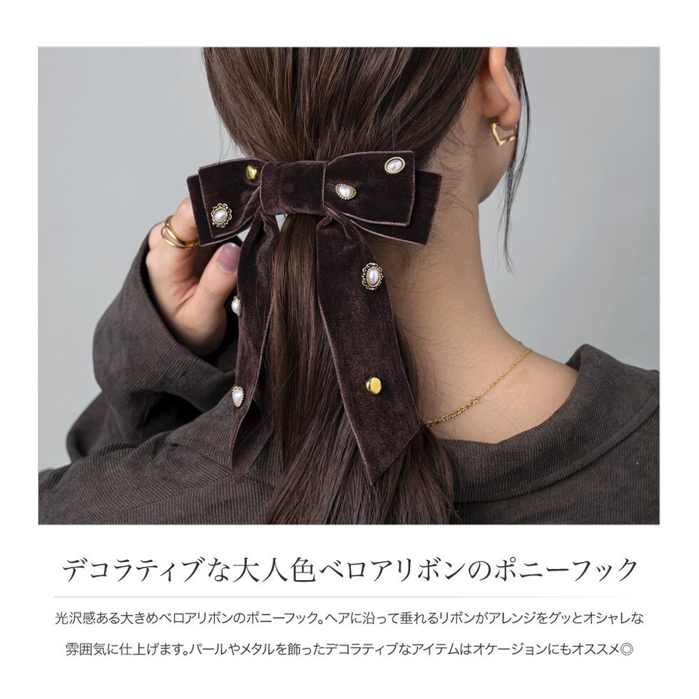 光沢感ある大きめベロアリボンのポニーフック。ヘアに沿って垂れるリボンがアレンジをグッとオシャレな雰囲気に仕上げます。パールやメタルを飾ったデコラティブなアイテムはオケージョンにもオススメ◎