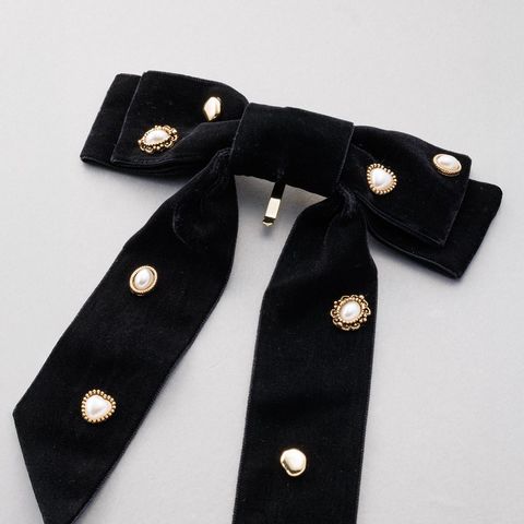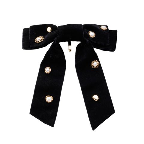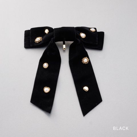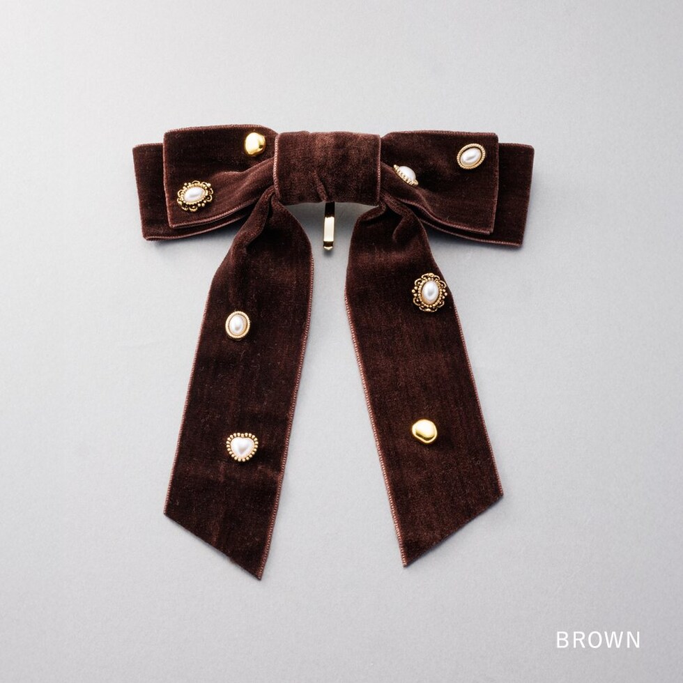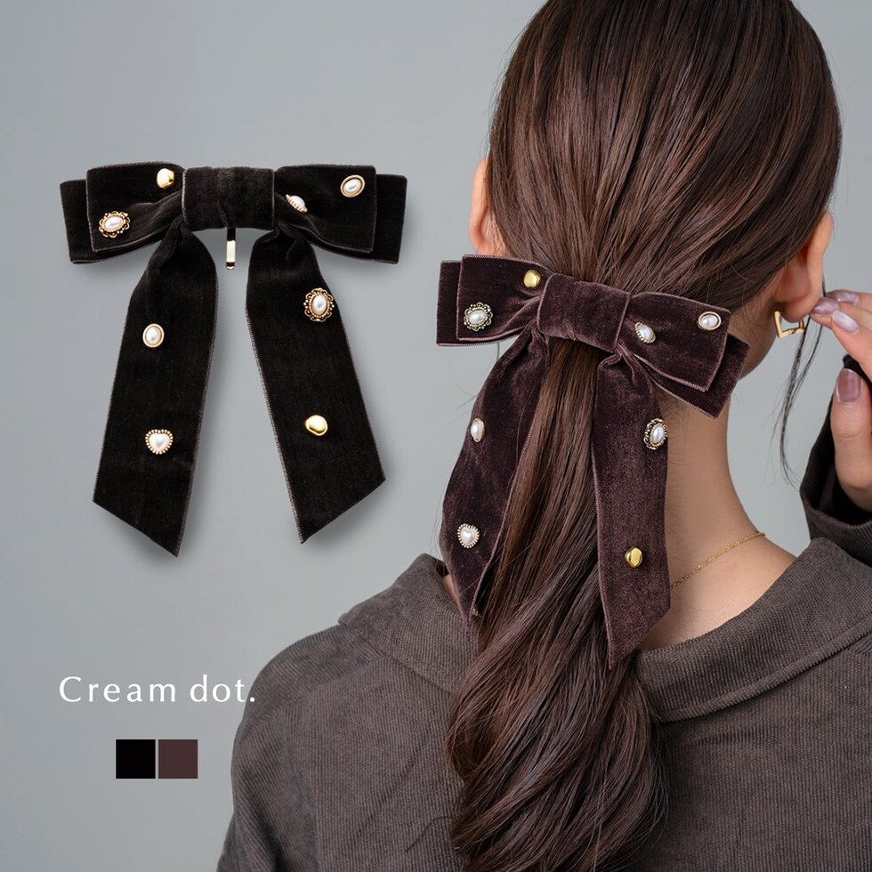 ヘアアクセサリー レディース ポニーフック リボン ベロア ベルベット 微光沢 パール メタル デコラティブ 大きめ ヘアフック ヘアカフス ヘアアクセ ヘアアレンジ 簡単 まとめ髪 髪留め ヘアゴム ブラウン cream dot ゆうパケット [ブラック_ワンサイズ]