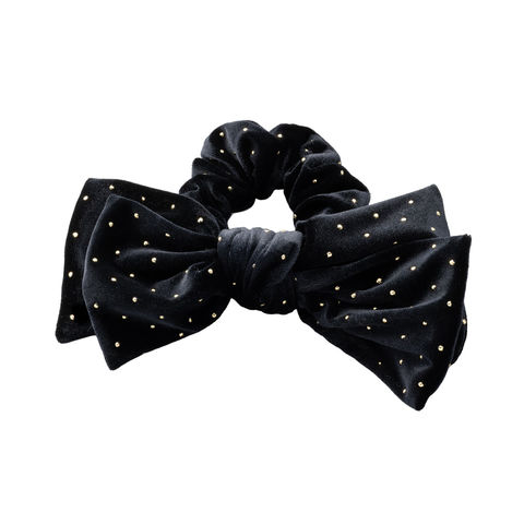 ベロア生地にミニスタッズを散りばめたシーズンムード高まるシュシュ。繊細に煌めく極小のスタッズと存在感のあるボリュームリボンが後ろ姿を格上げする大人顔アイテム。今っぽく仕上がるオススメのひと品です。