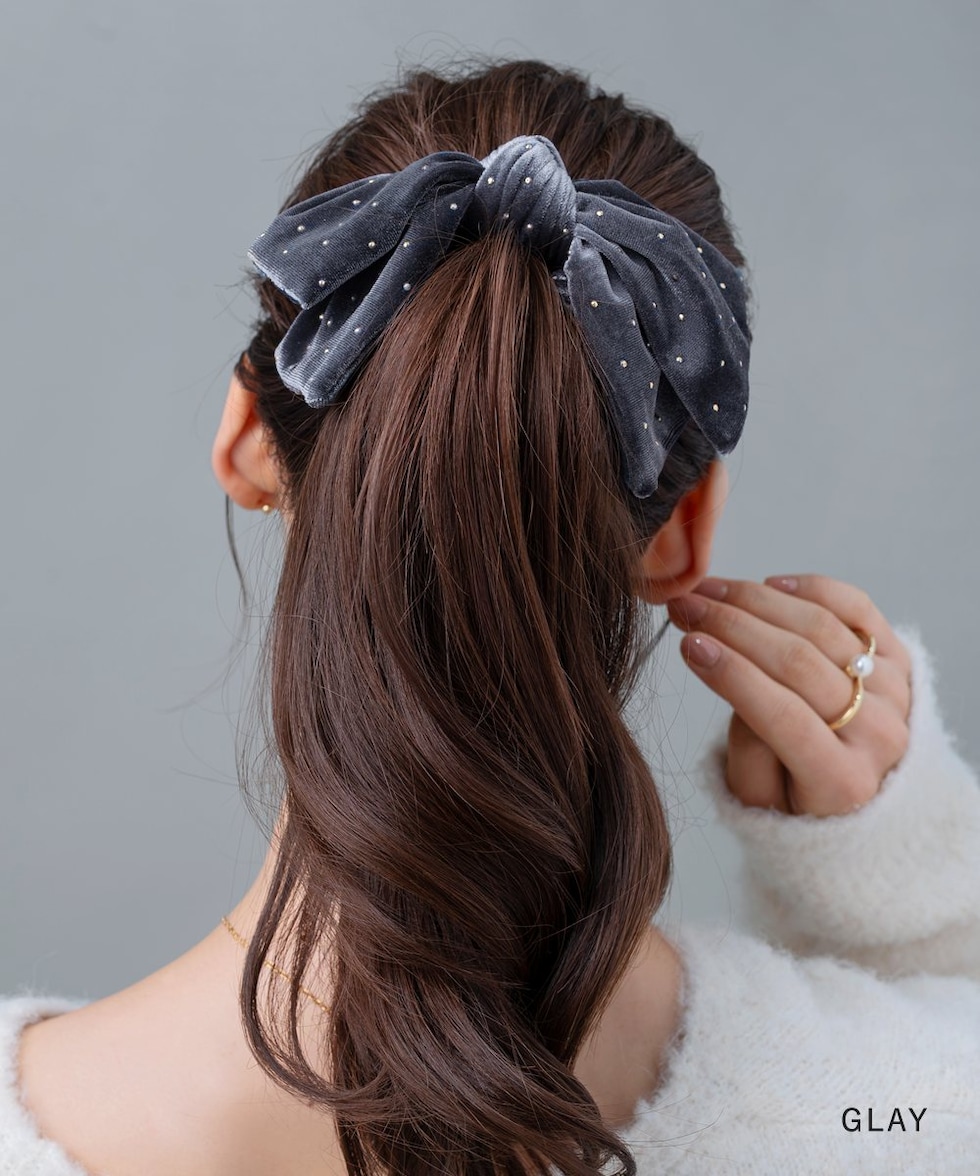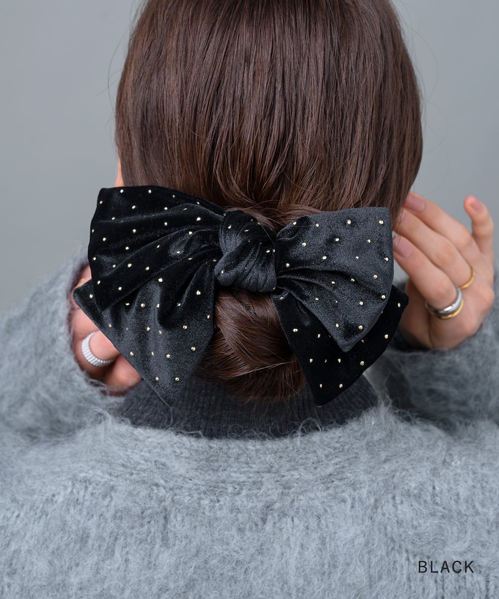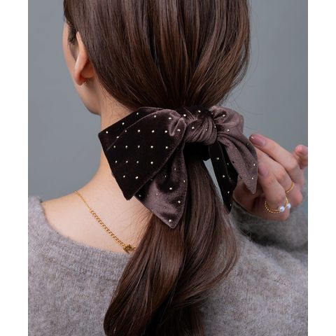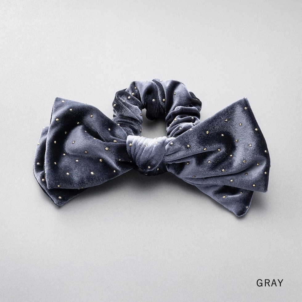 ベロア生地にミニスタッズを散りばめたシーズンムード高まるシュシュ。繊細に煌めく極小のスタッズと存在感のあるボリュームリボンが後ろ姿を格上げする大人顔アイテム。今っぽく仕上がるオススメのひと品です。