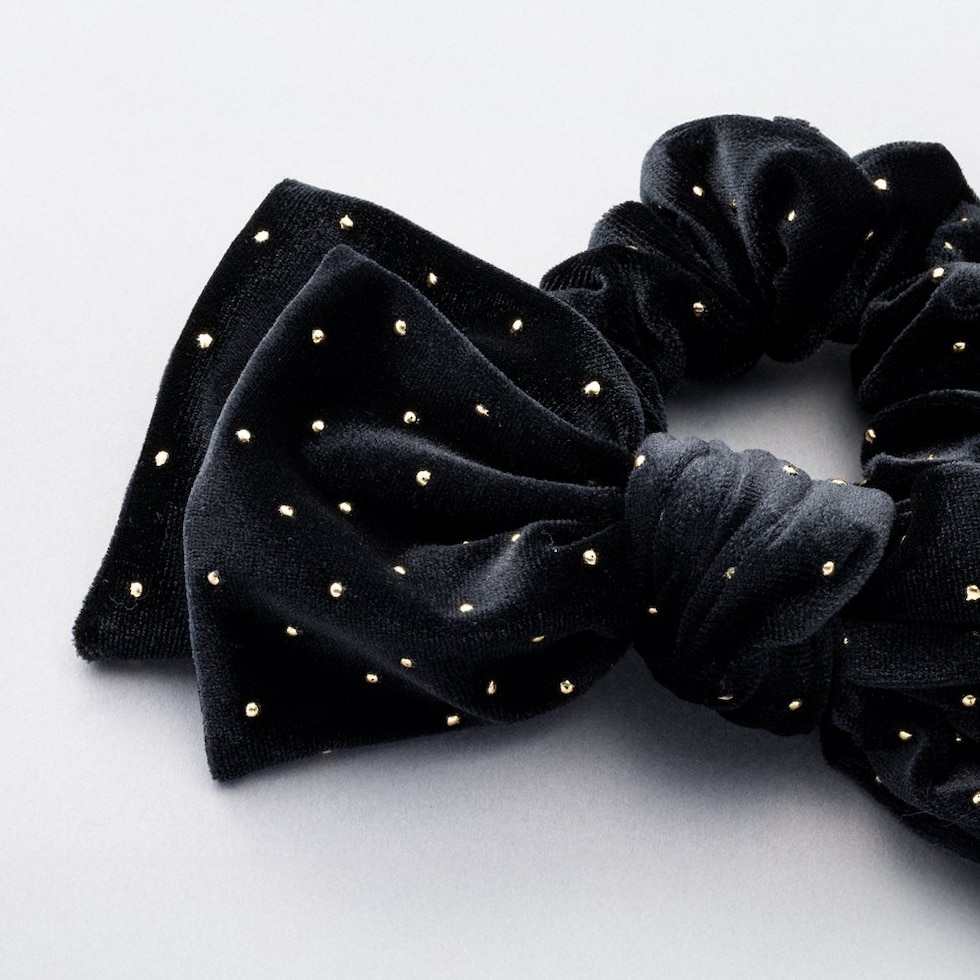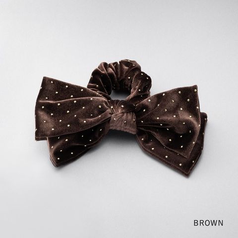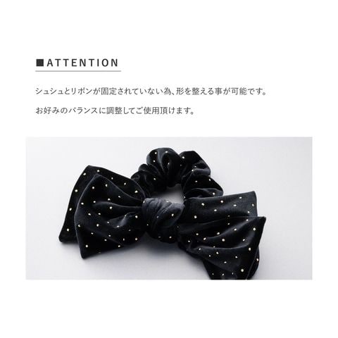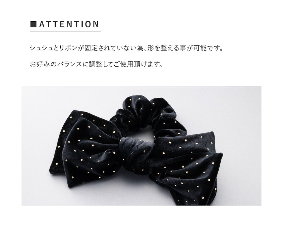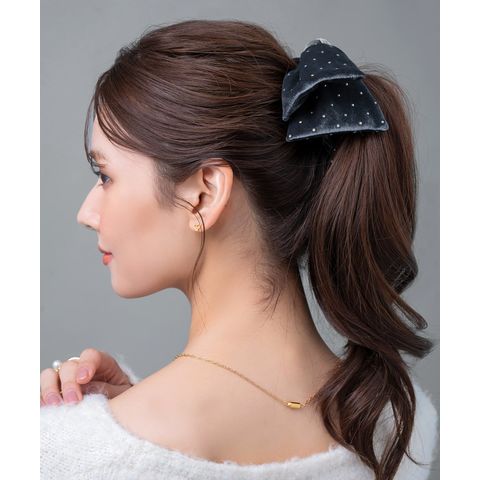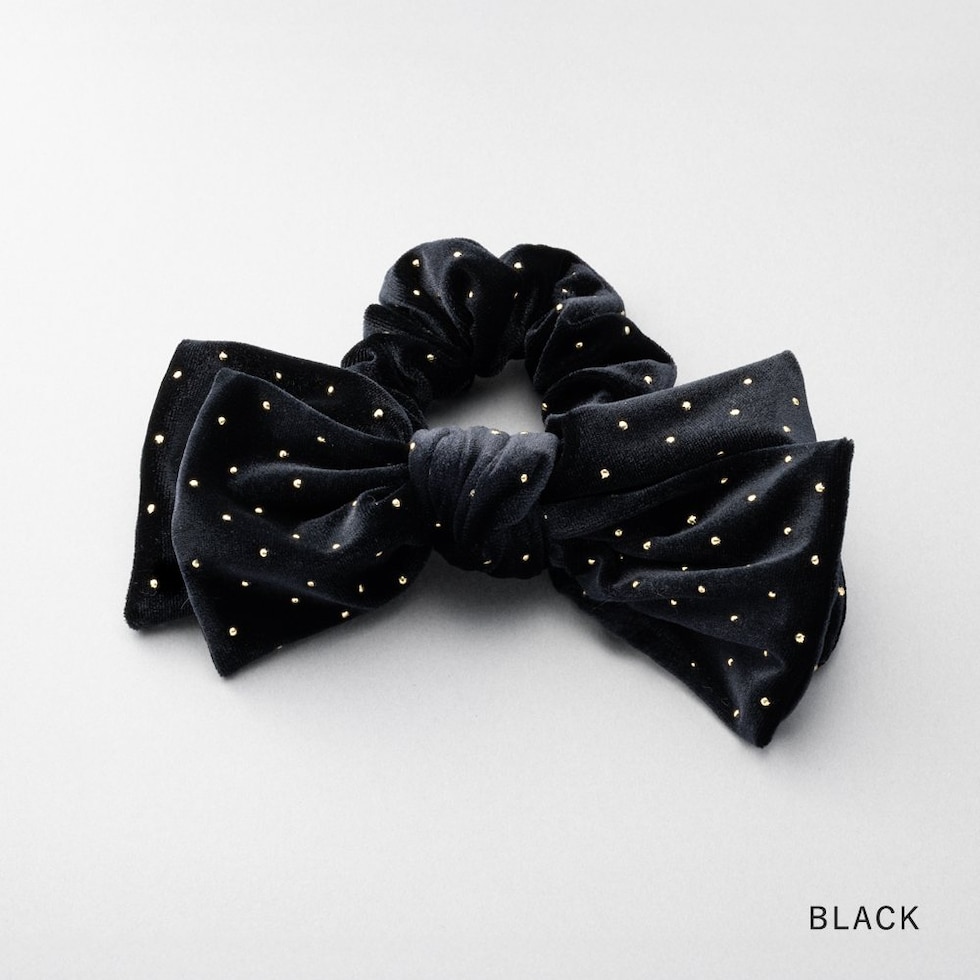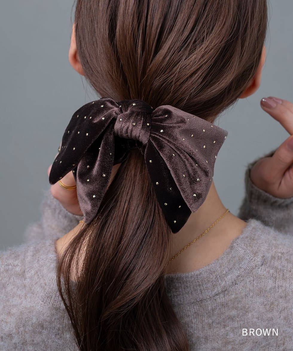 ベロア生地にミニスタッズを散りばめたシーズンムード高まるシュシュ。繊細に煌めく極小のスタッズと存在感のあるボリュームリボンが後ろ姿を格上げする大人顔アイテム。今っぽく仕上がるオススメのひと品です。