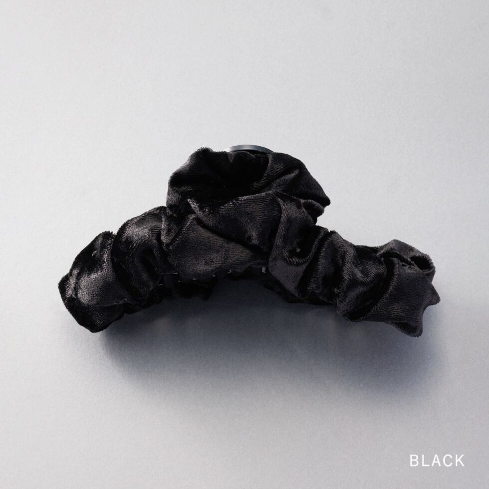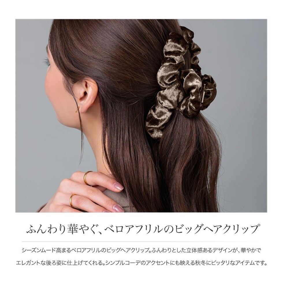 シーズンムード高まるベロアフリルのビッグヘアクリップ。ふんわりとした立体感あるデザインが、華やかでエレガントな後ろ姿に仕上げてくれる。シンプルコーデのアクセントにも映える秋冬にピッタリなアイテムです。