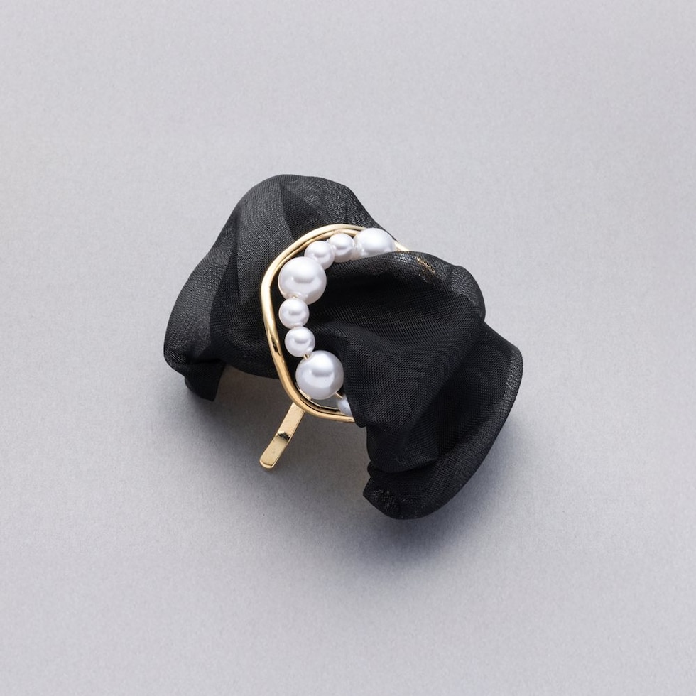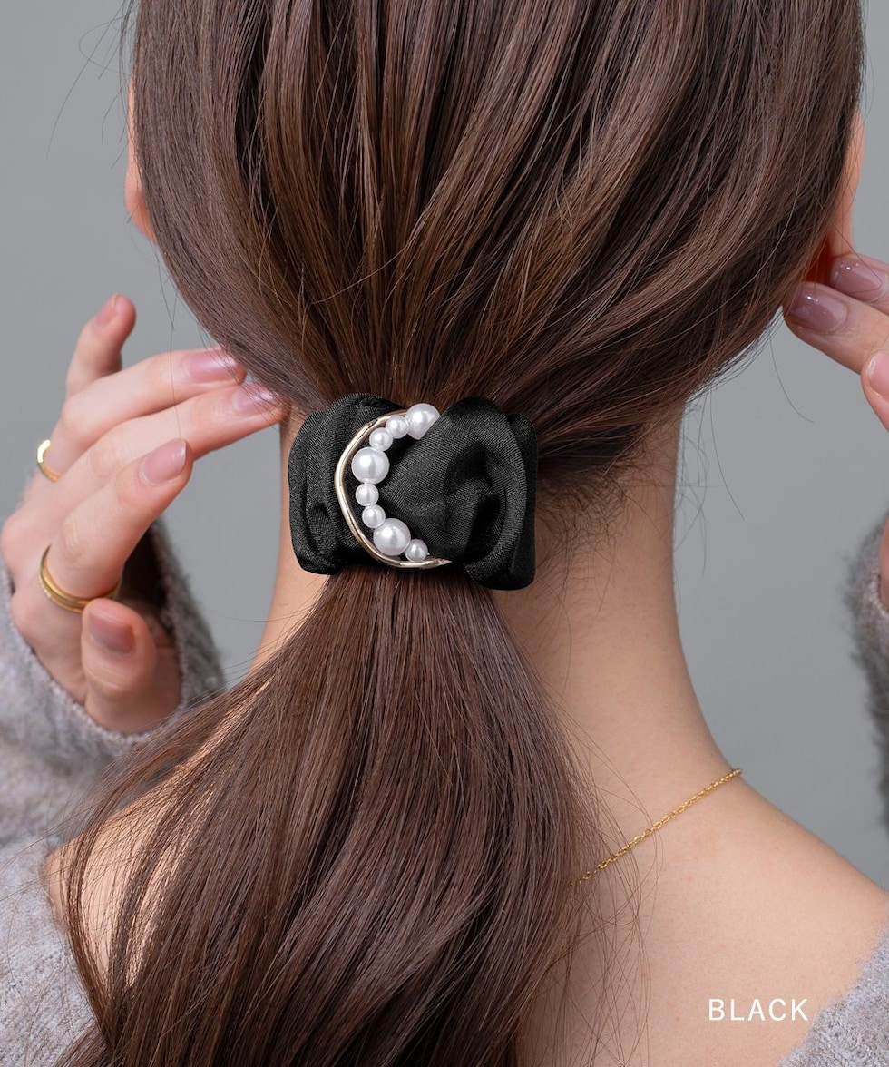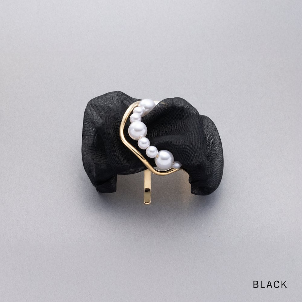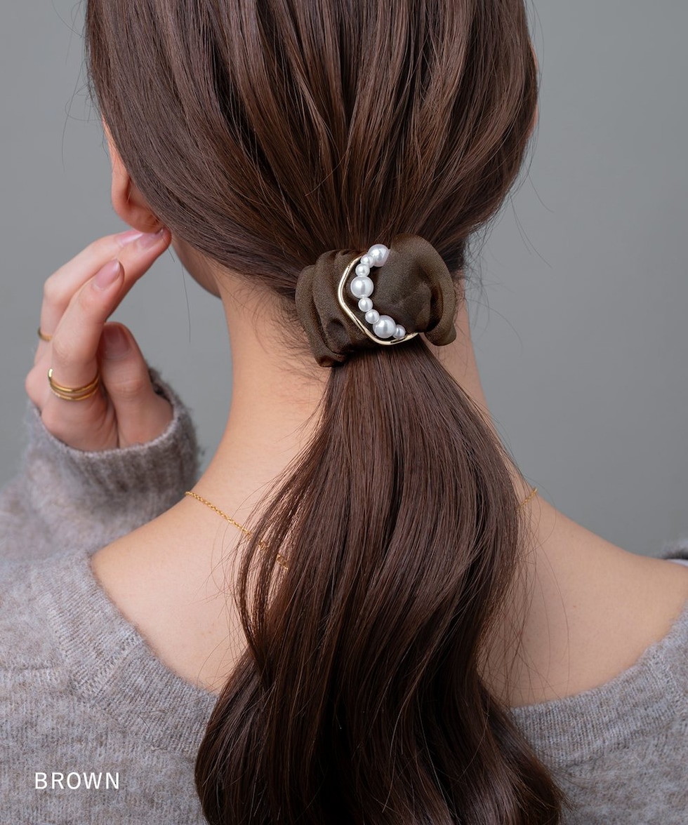 透け感オーガンジー生地にパールとサークルメタルをあしらったポニーフック。程よいボリュームで華やかな雰囲気を演出します。デイリーコーデになじむカラーで、いつものまとめ髪がぐっとおしゃれに仕上がります。