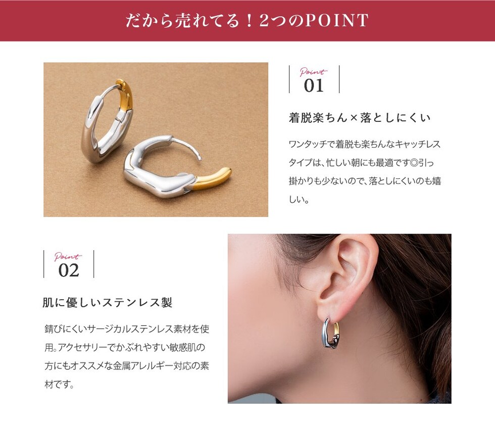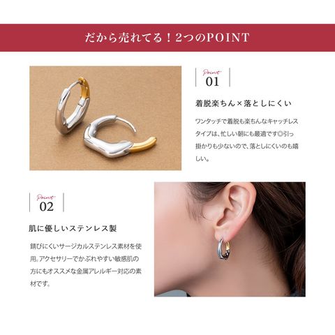 ワンタッチで着脱も楽ちんなキャッチレスタイプは、忙しい朝にも最適です◎引っ掛かりも少ないので、落としにくいのも嬉しい。