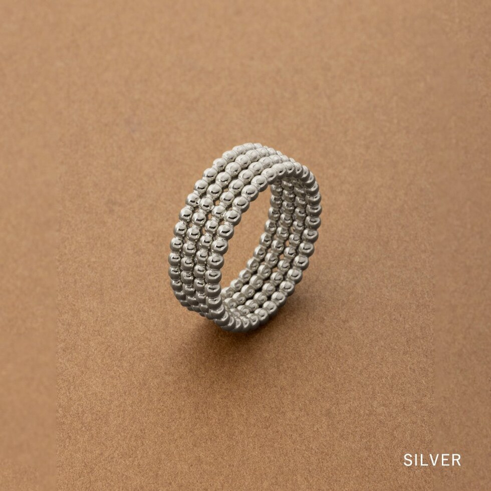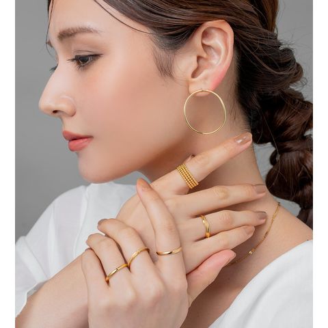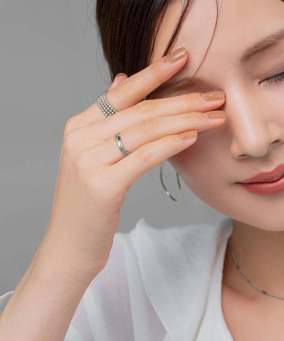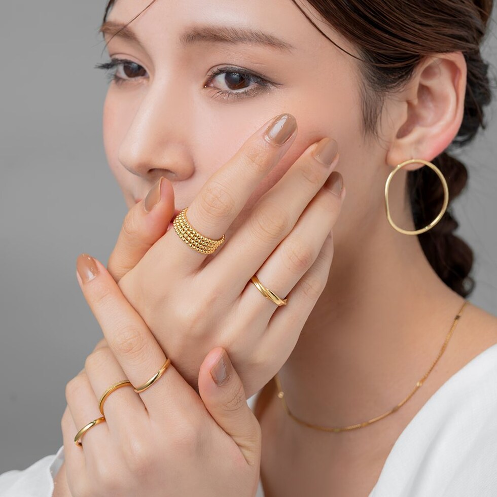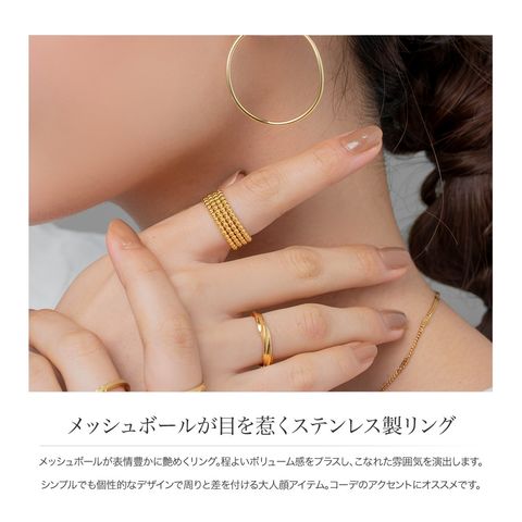 メッシュボールが表情豊かに艶めくリング。程よいボリューム感をプラスし、こなれた雰囲気を演出します。シンプルでも個性的なデザインで周りと差を付ける大人顔アイテム。コーデのアクセントにオススメです。