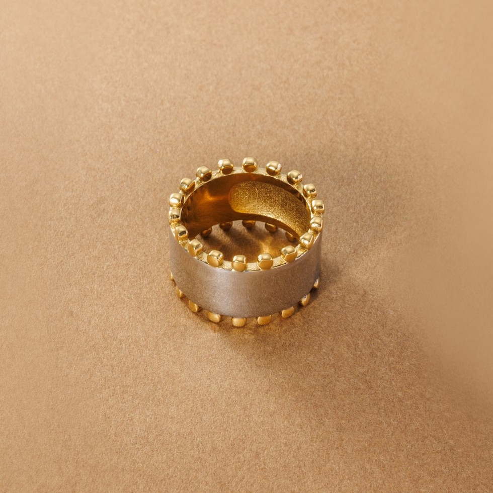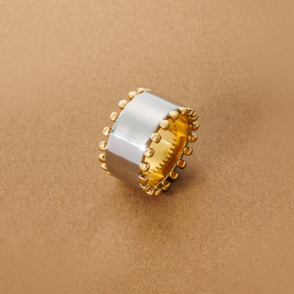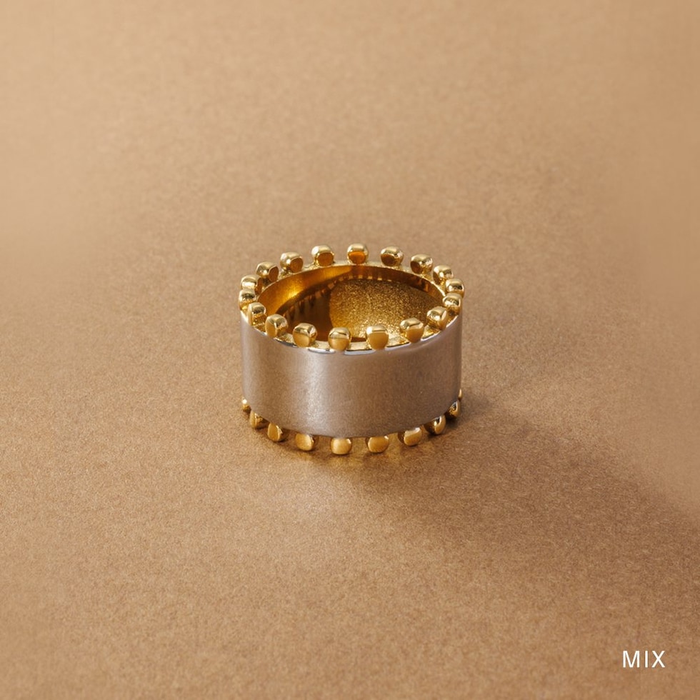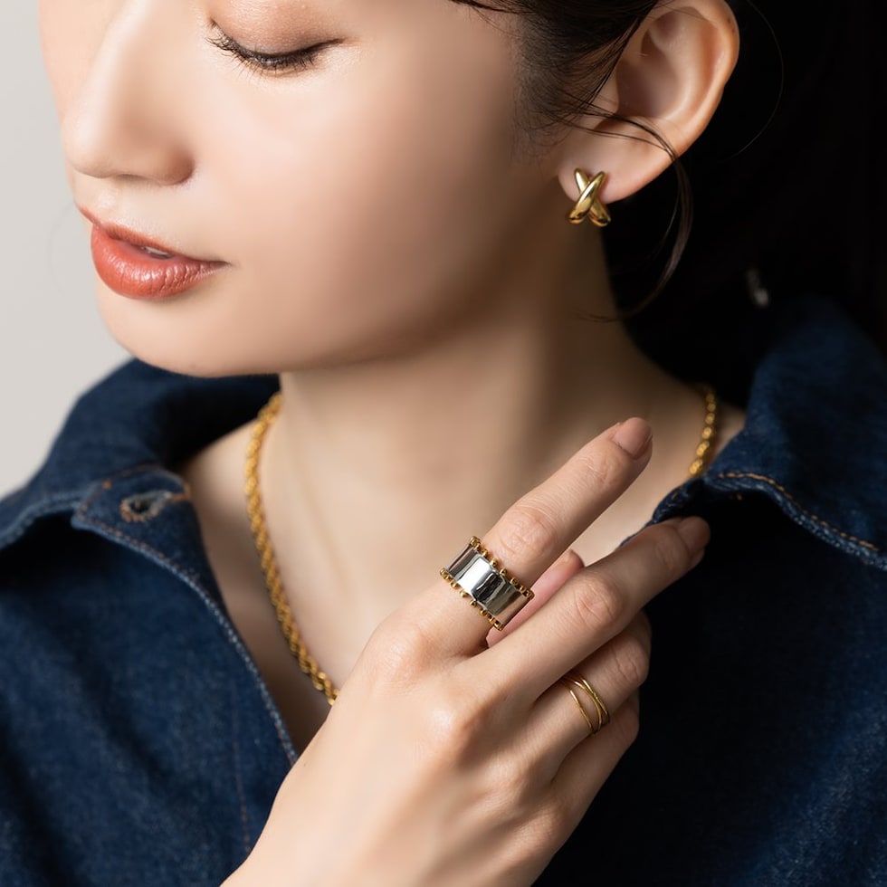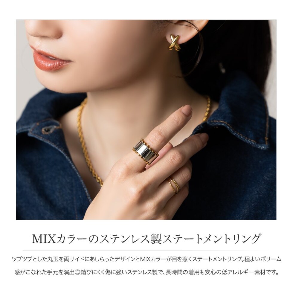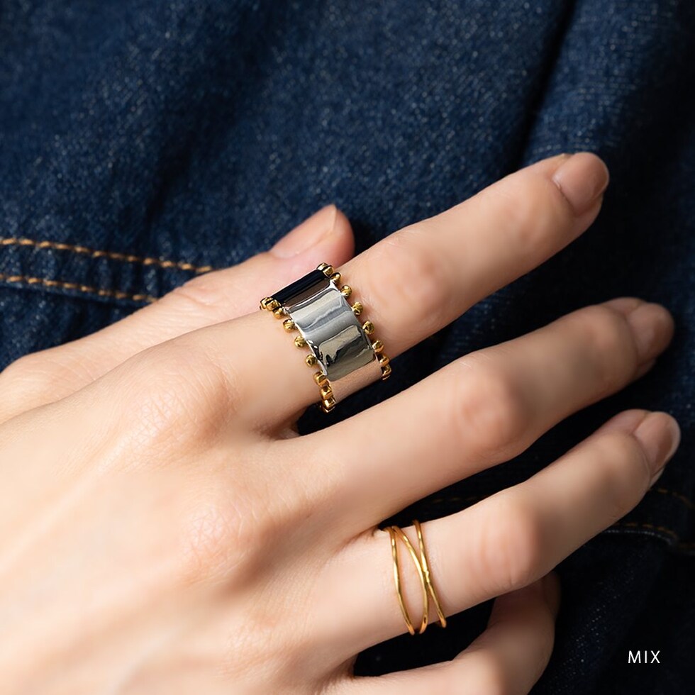 ツブツブとした丸玉を両サイドにあしらったデザインとMIXカラーが目を惹くステートメントリング。程よいボリューム感がこなれた手元を演出◎錆びにくく傷に強いステンレス製で、長時間の着用も安心の低アレルギー素材です。