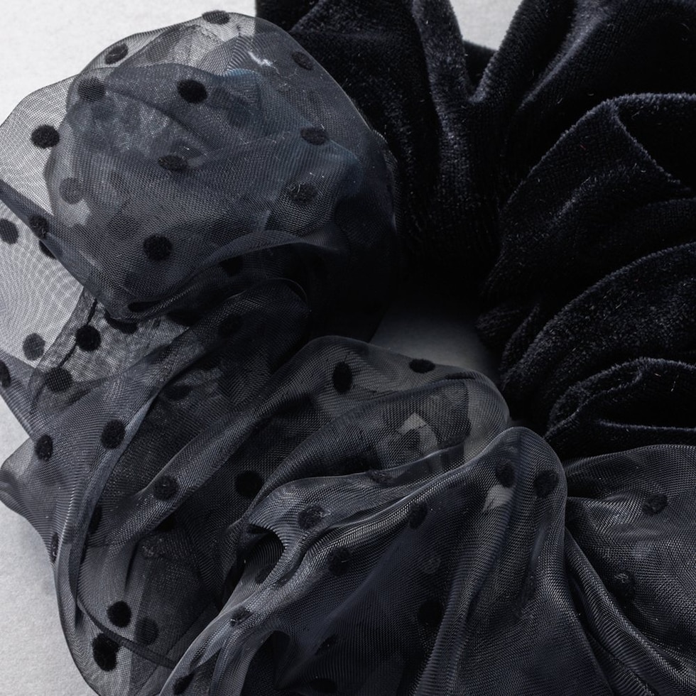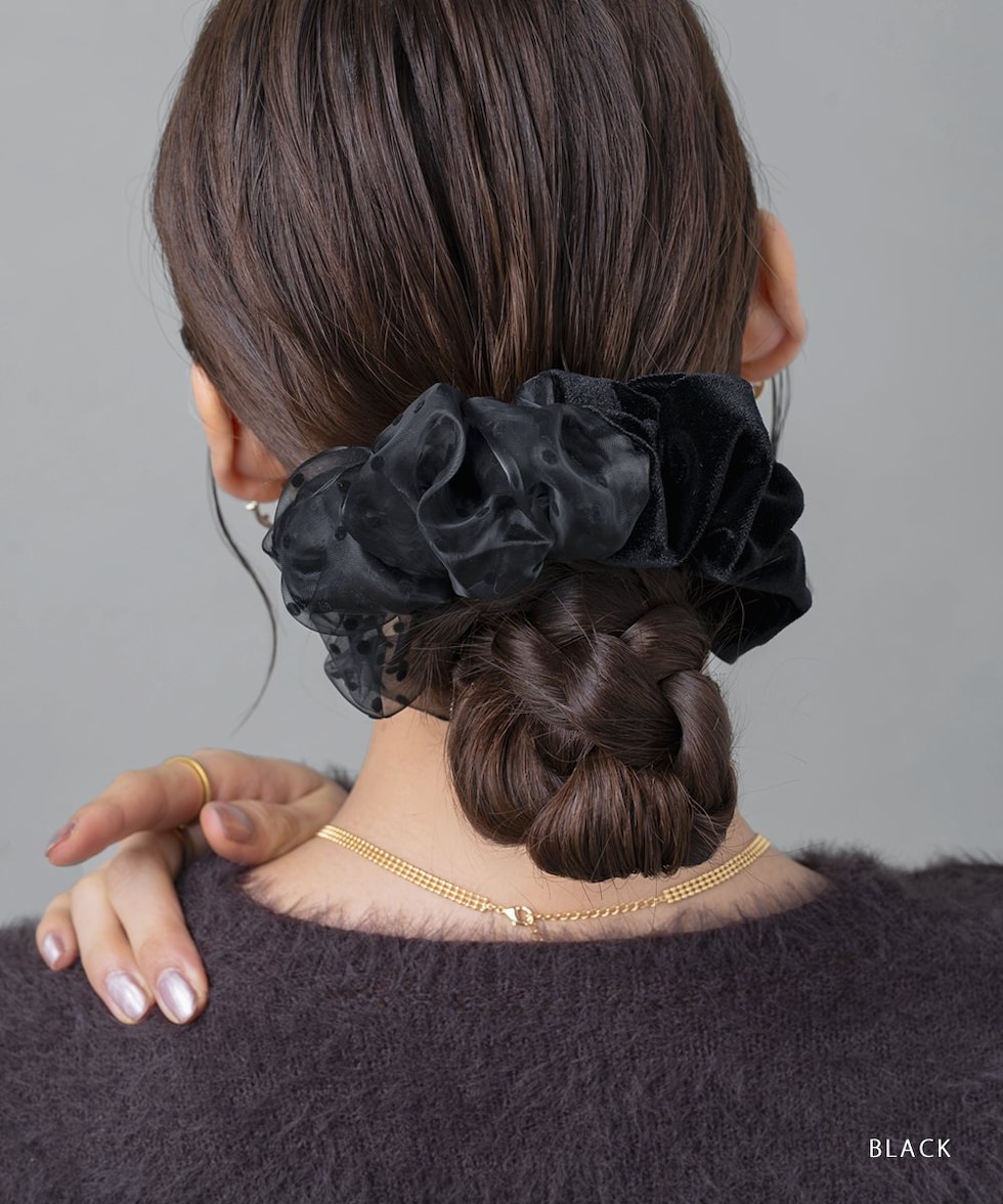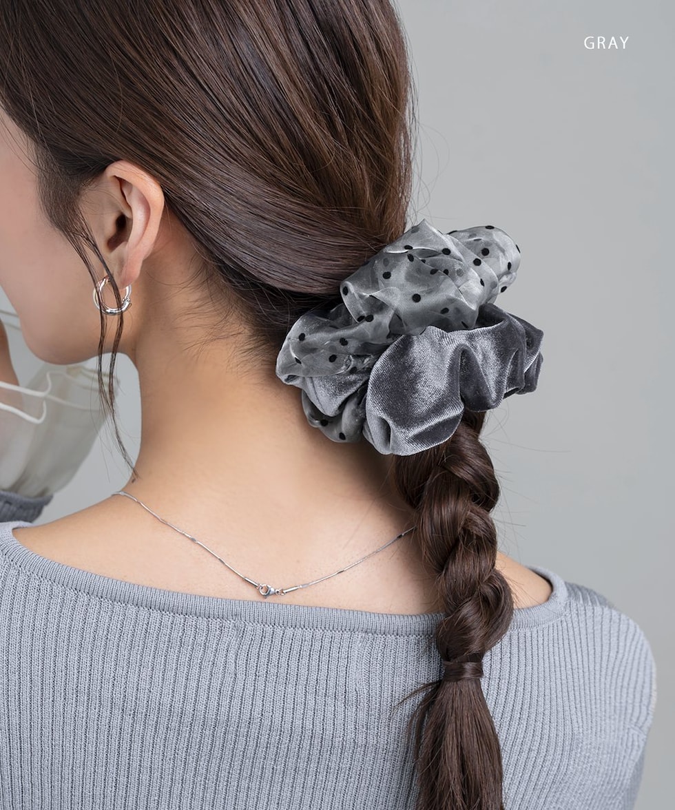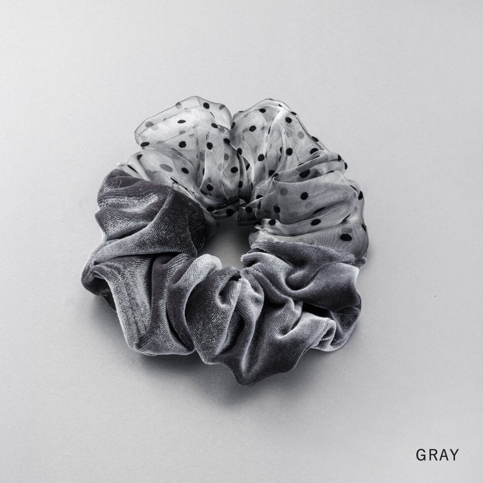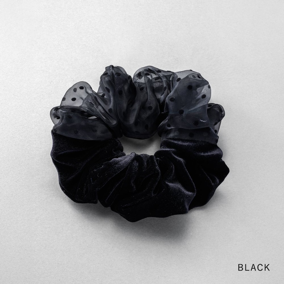 シックカラーの異素材MIXシュシュ。ベロアとドット柄オーガンジー素材の切り替えデザインで大人っぽさの中にも可愛さをひとさじプラス。シンプルなポニーが華やぐ技ありアイテムです◎