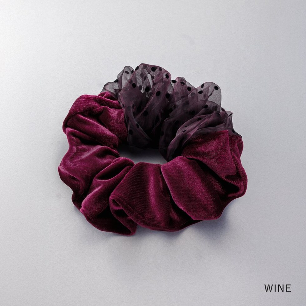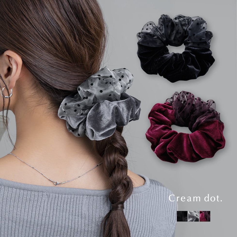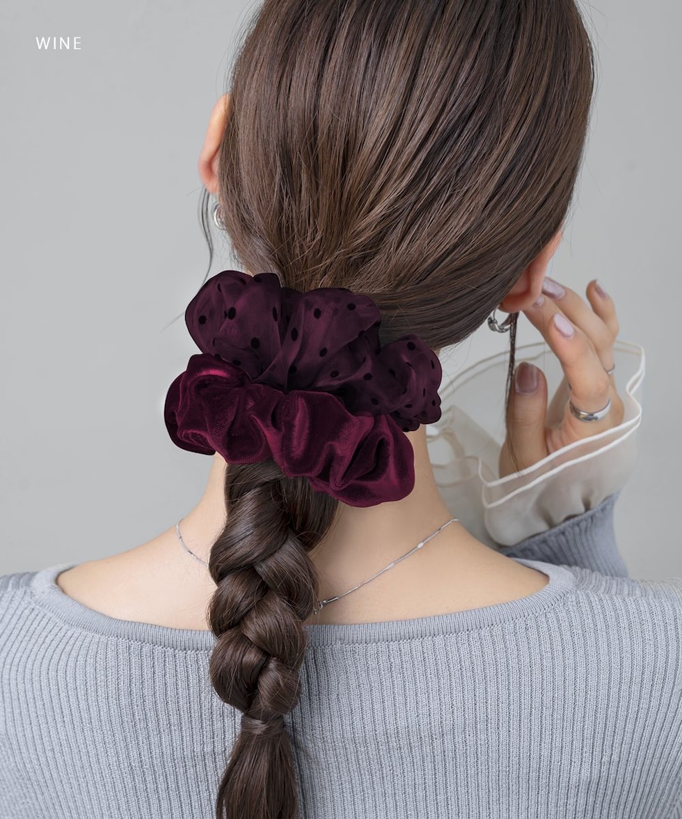 ヘアアクセサリー レディース シュシュ ベロア ベルベット 光沢感 シアー ドット 水玉 異素材 オーガンジー 切り替え ヘアゴム 大きめ ヘアアクセ ヘアアレンジ 簡単 まとめ髪 髪留め ボリューム ワイン cream dot ゆうパケット [ワイン_ワンサイズ]