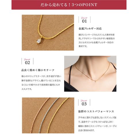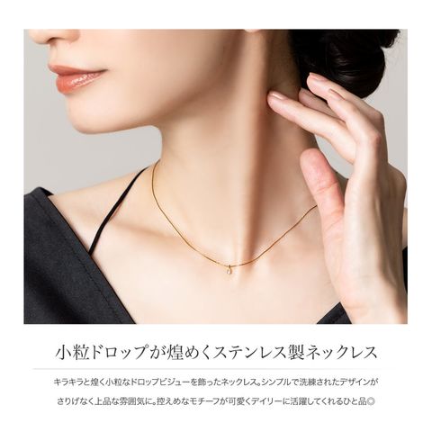 キラキラと煌く小粒なドロップビジューを飾ったネックレス。シンプルで洗練されたデザインがさりげなく上品な雰囲気に。控えめなモチーフが可愛くデイリーに活躍してくれるひと品◎