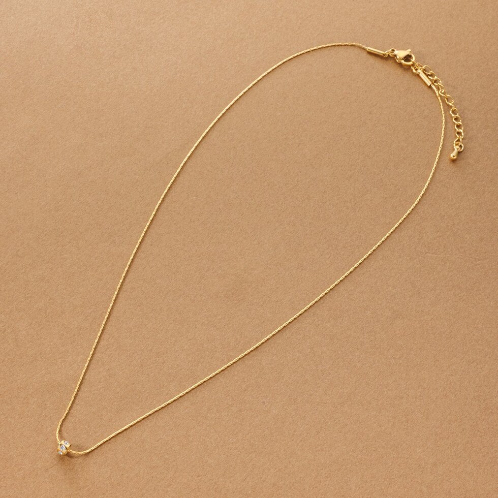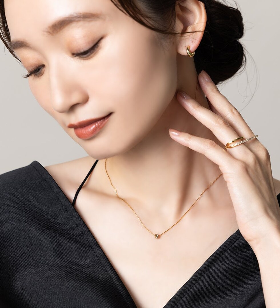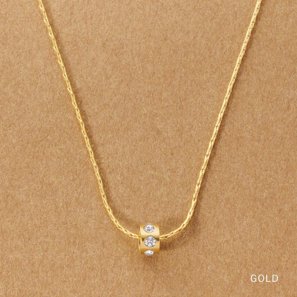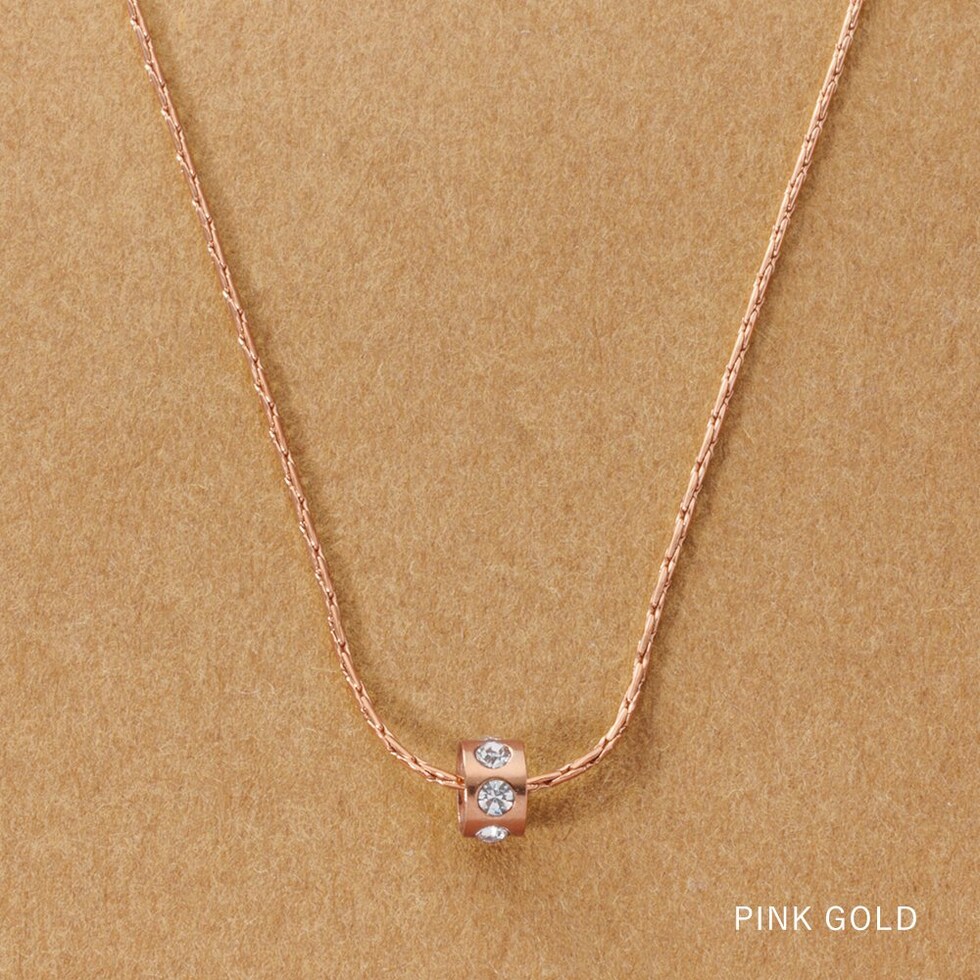 ミニマルなリングのステンレス製ネックレス。リングに埋め込まれたビジューの凛とした輝きが、胸元にさりげない華やかさをプラスしてくれます。大人びた表情に導いてくれる肌馴染みの良い逸品。