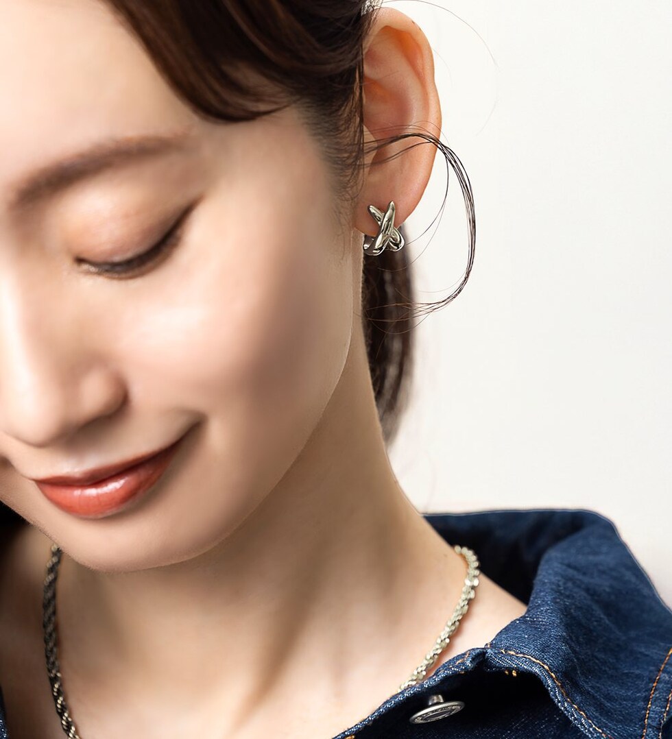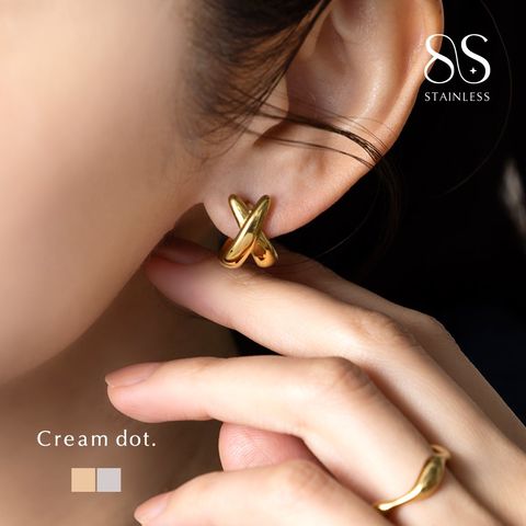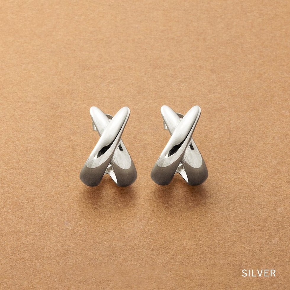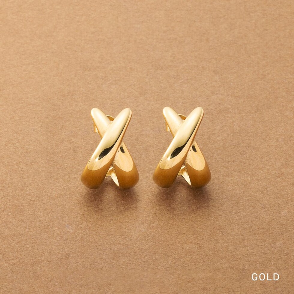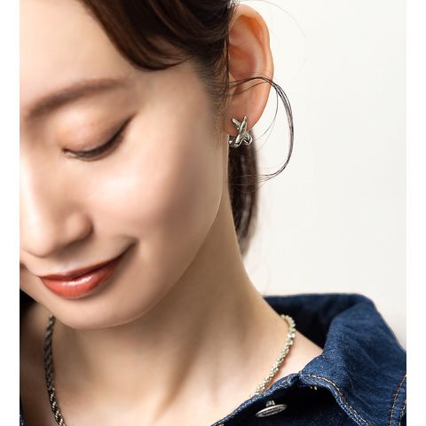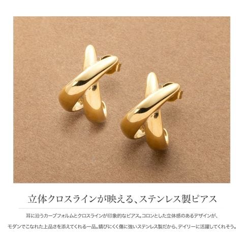 耳に沿うカーブフォルムとクロスラインが印象的なピアス。コロンとした立体感のあるデザインが、モダンでこなれた上品さを添えてくれる一品。錆びにくく傷に強いステンレス製だから、デイリーに活躍してくれそう。