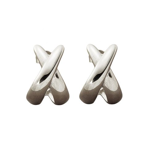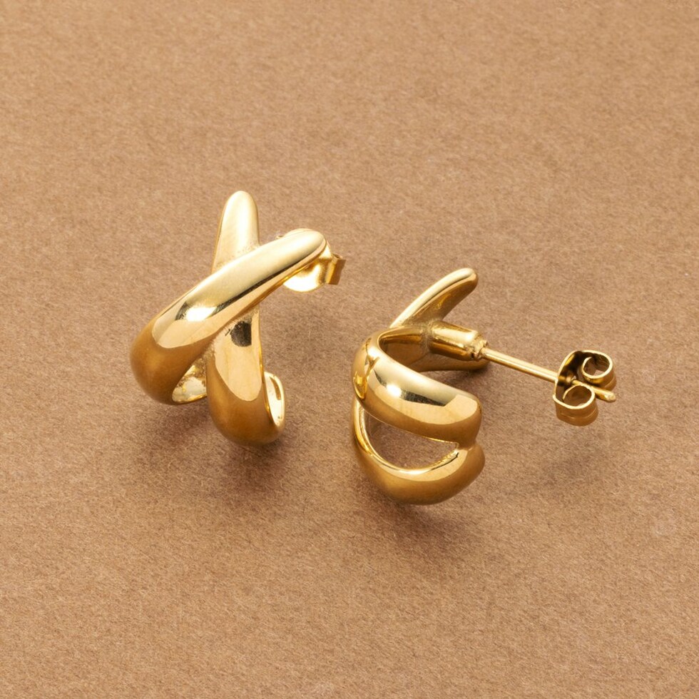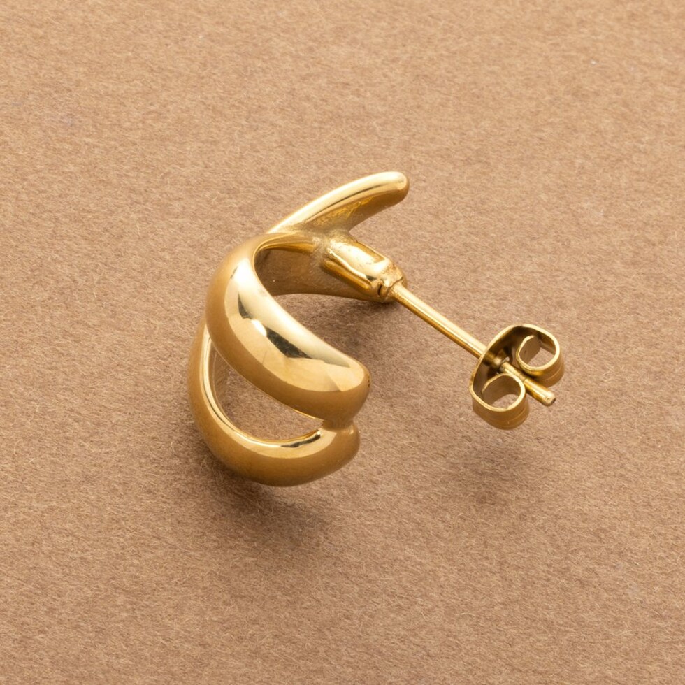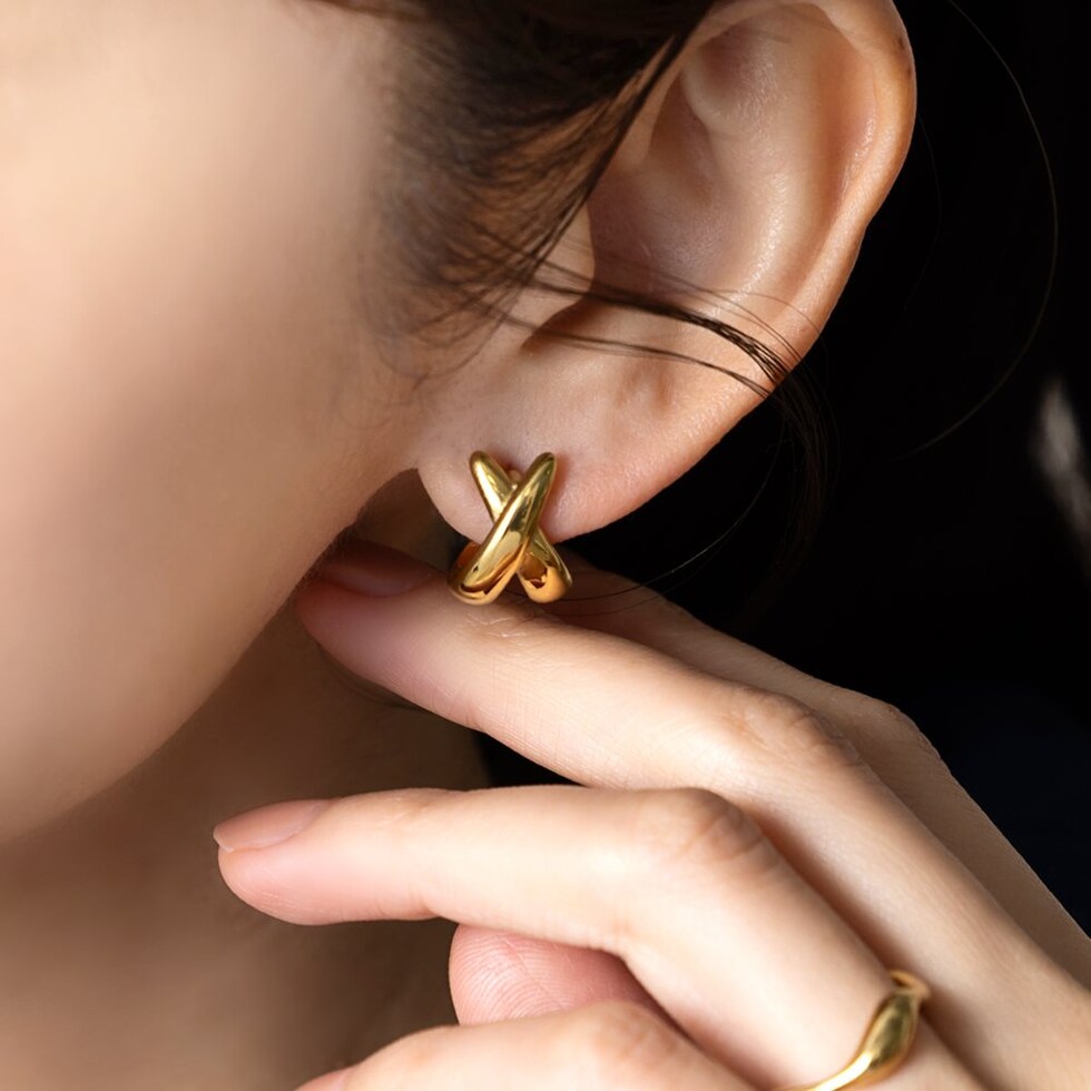 耳に沿うカーブフォルムとクロスラインが印象的なピアス。コロンとした立体感のあるデザインが、モダンでこなれた上品さを添えてくれる一品。錆びにくく傷に強いステンレス製だから、デイリーに活躍してくれそう。