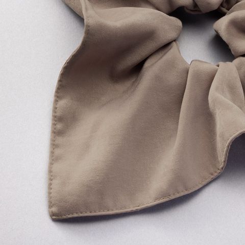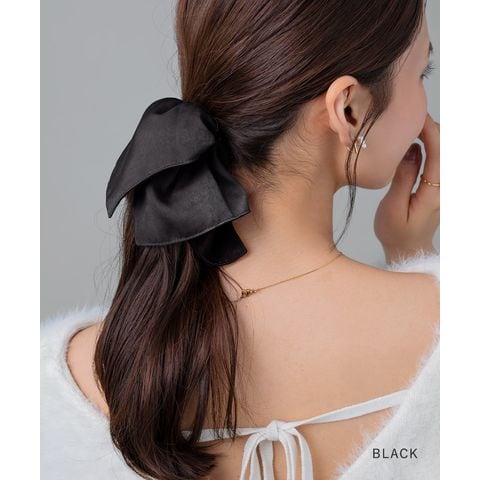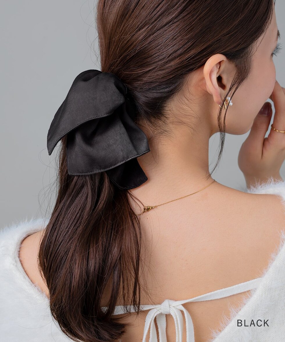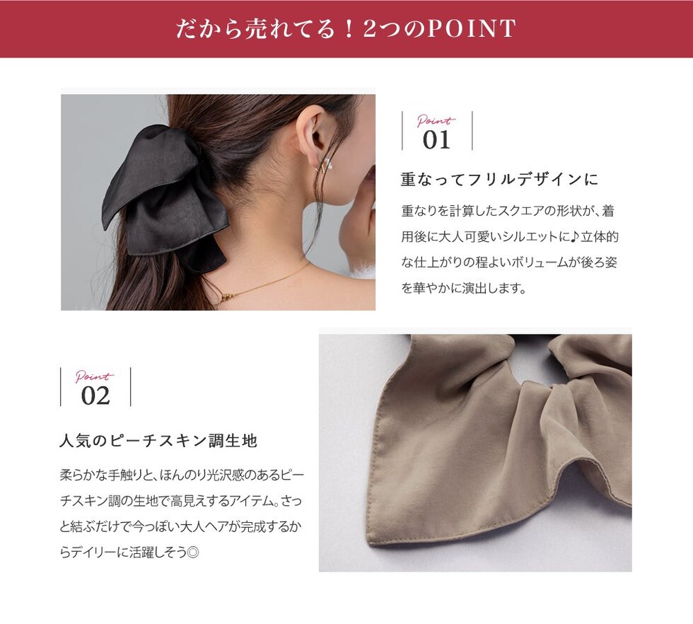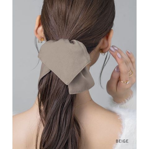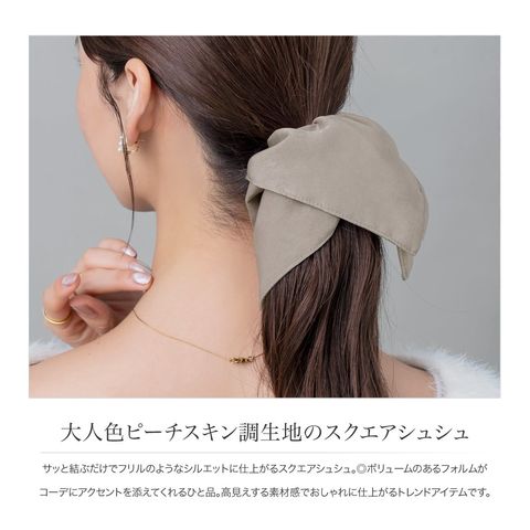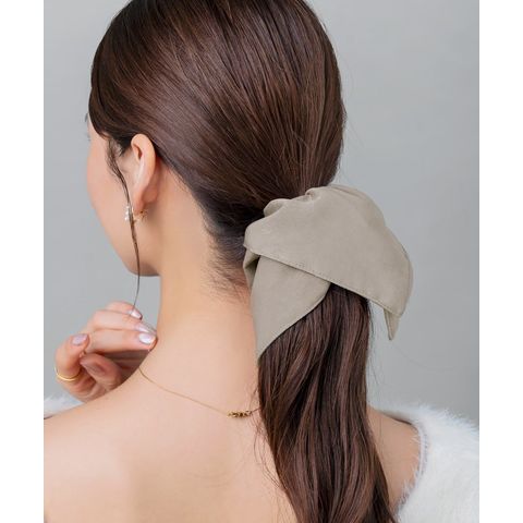 柔らかな手触りと、ほんのり光沢感のあるピーチスキン調の生地で高見えするアイテム。さっと結ぶだけで今っぽい大人ヘアが完成するからデイリーに活躍しそう◎