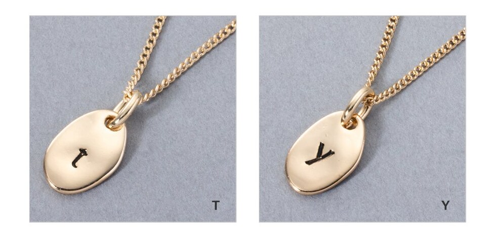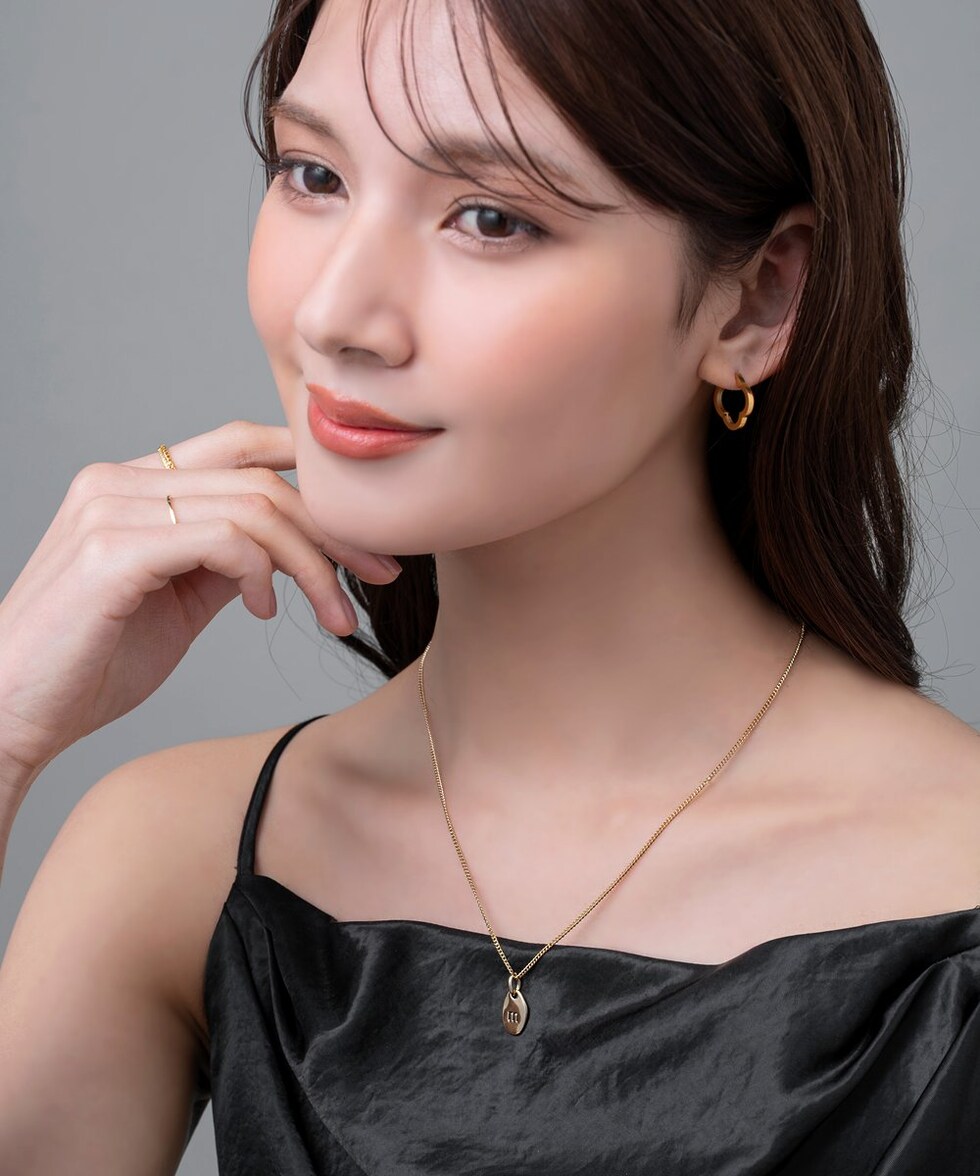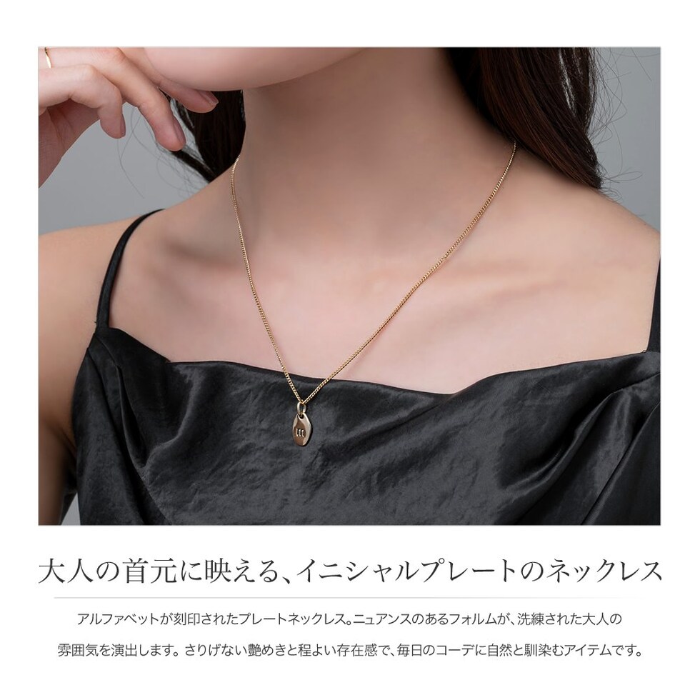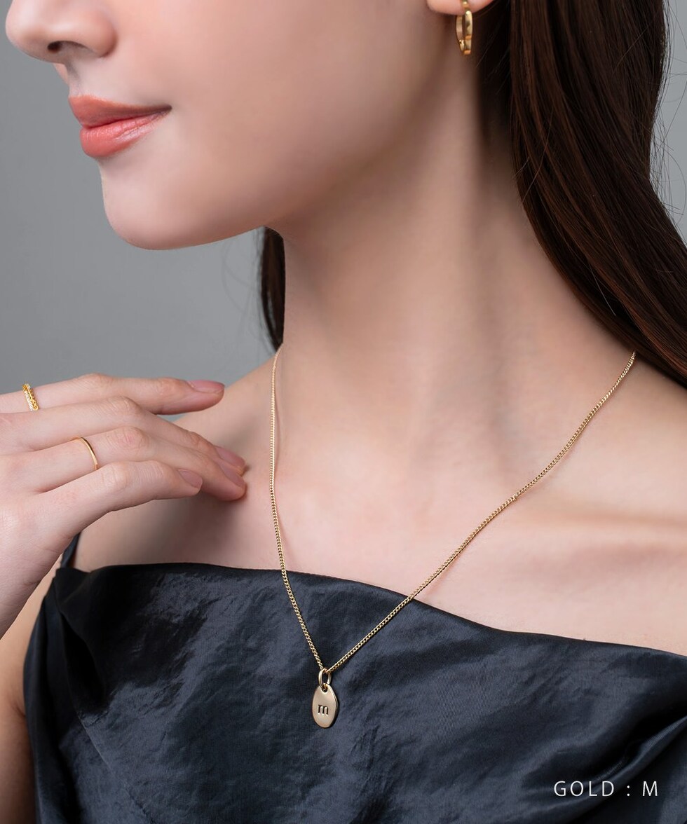 アルファベットが刻印されたプレートネックレス。ニュアンスのあるフォルムが、洗練された大人の雰囲気を演出します。さりげない艶めきと程よい存在感で、毎日のコーデに自然と馴染むアイテムです。