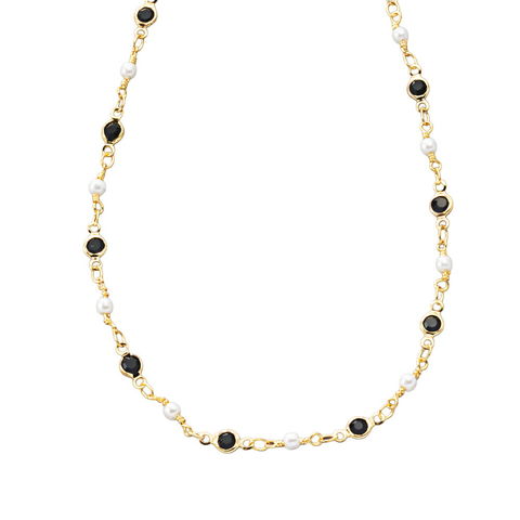 ブラック/半透明ストーンとパールが交互に並ぶステーションネックレス。ストーンは金属枠にセットされ、パールは繊細で上品な一品。シンプルながらも程よい存在感で、フォーマルにもデイリーにも使える万能アイテムです。