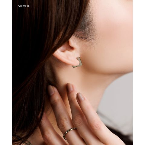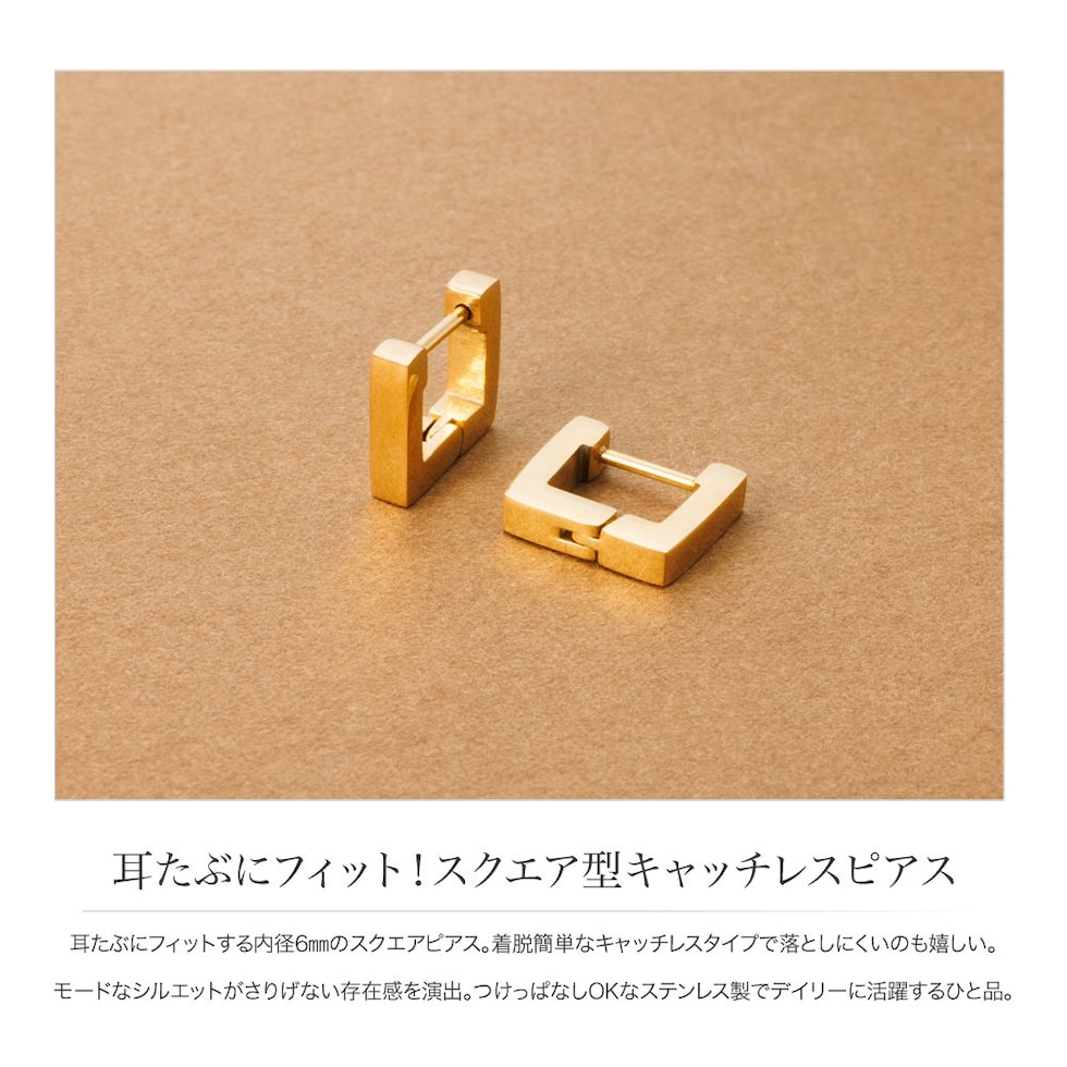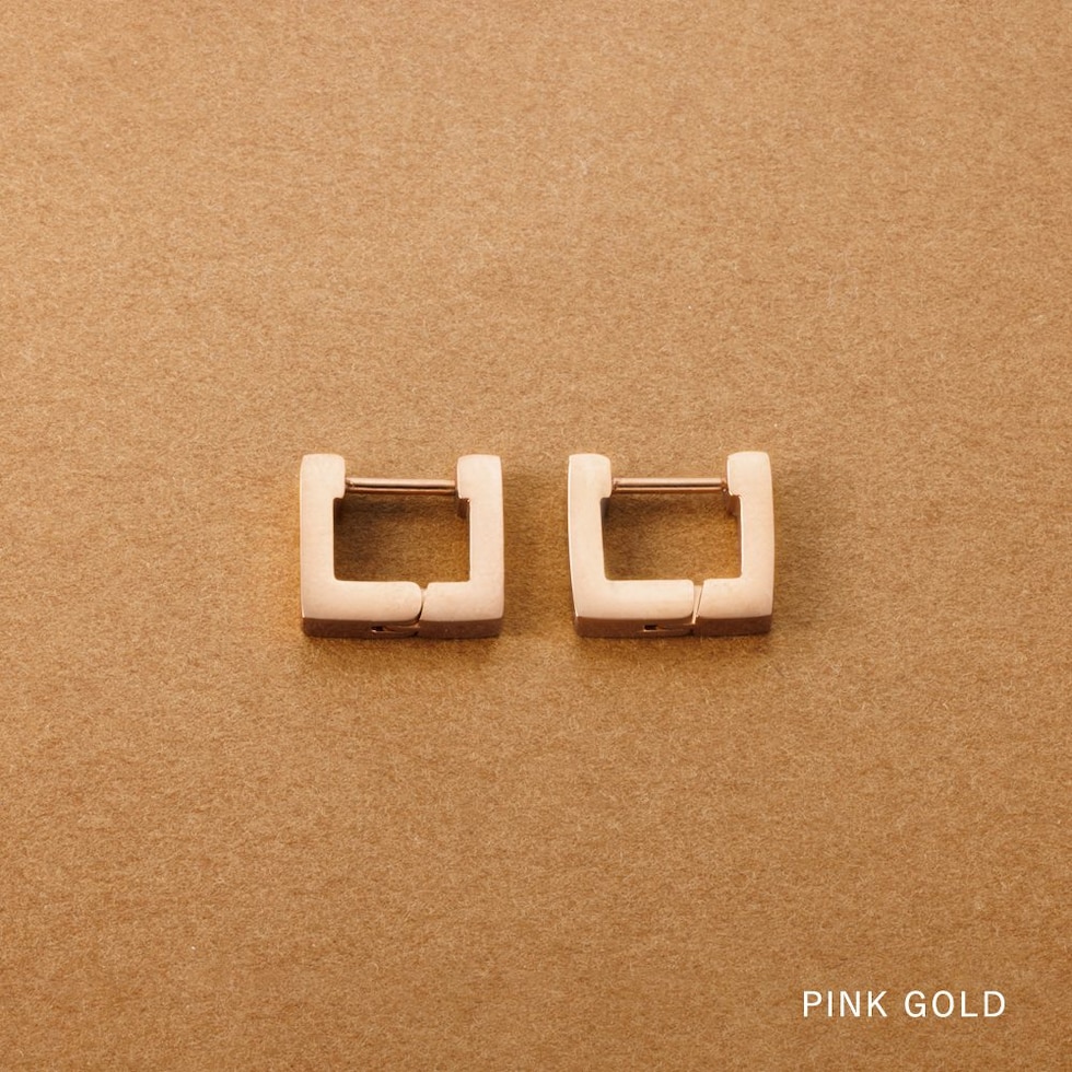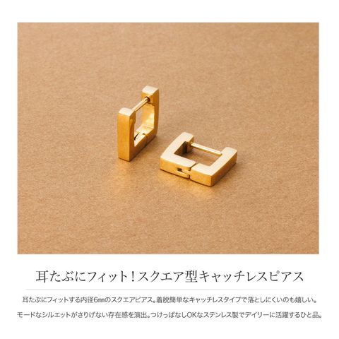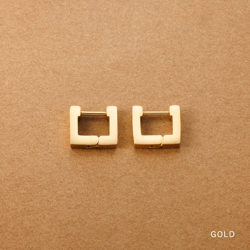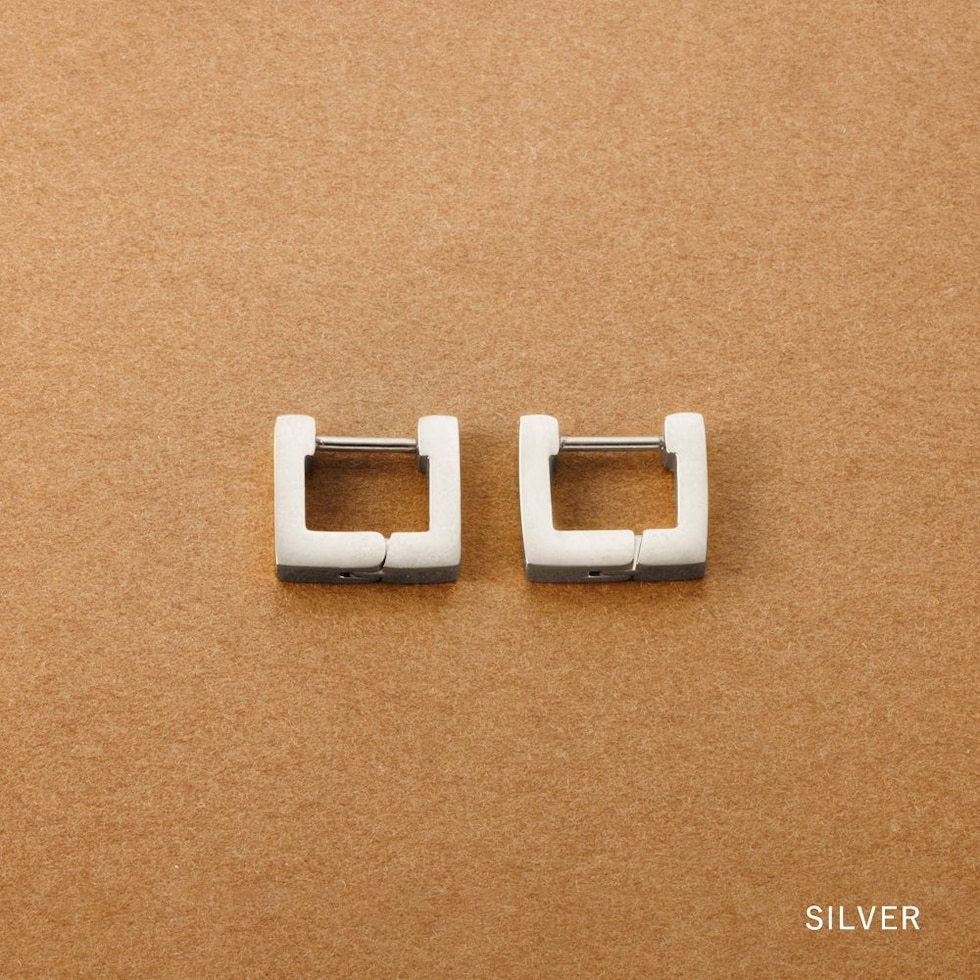耳たぶにフィットする内径6mmのスクエアピアス。着脱簡単なキャッチレスタイプで落としにくいのも嬉しい。モードなシルエットがさりげない存在感を演出。つけっぱなしOKなステンレス製でデイリーに活躍するひと品。
