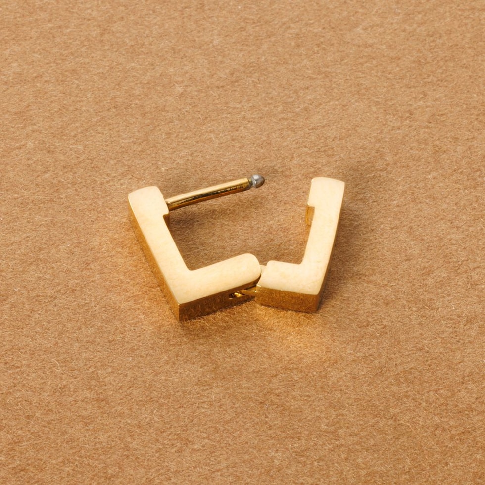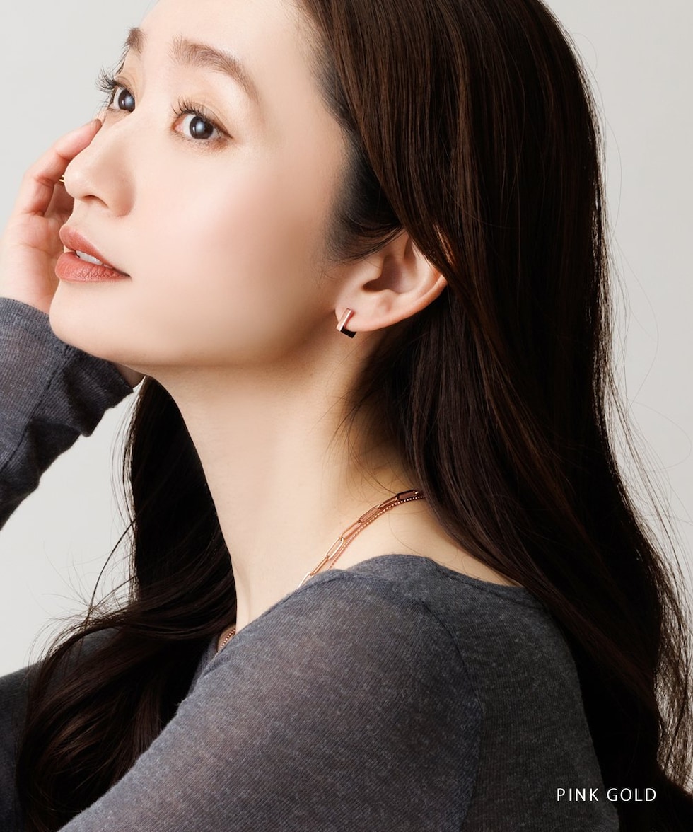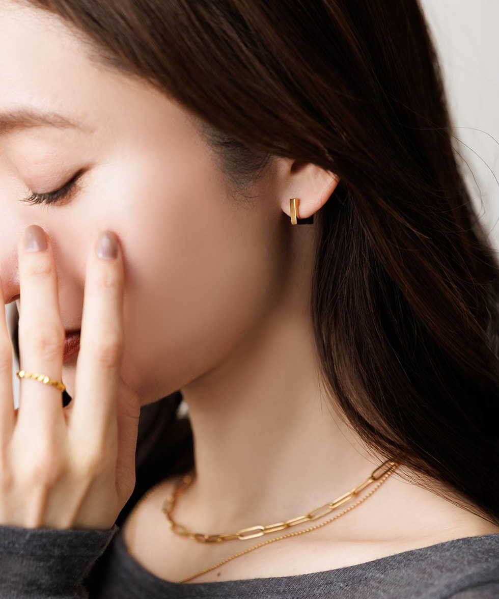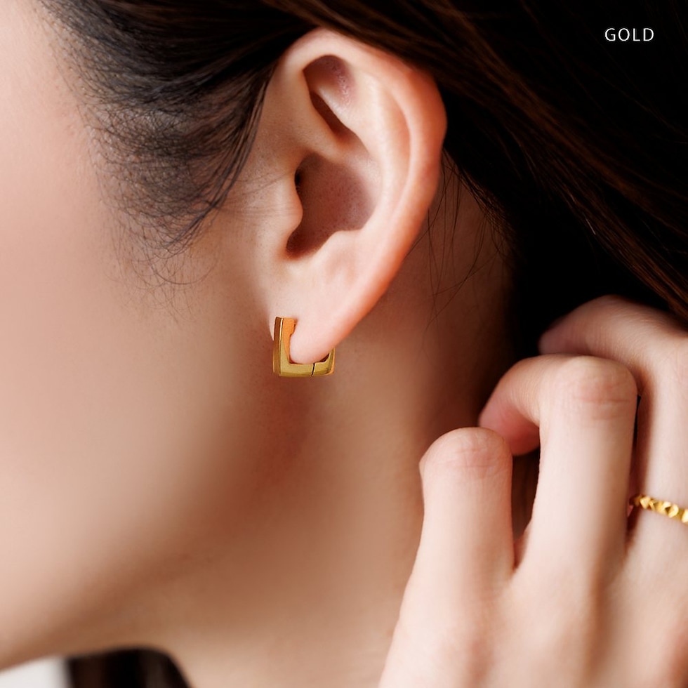 耳たぶにフィットする内径6mmのスクエアピアス。着脱簡単なキャッチレスタイプで落としにくいのも嬉しい。モードなシルエットがさりげない存在感を演出。つけっぱなしOKなステンレス製でデイリーに活躍するひと品。