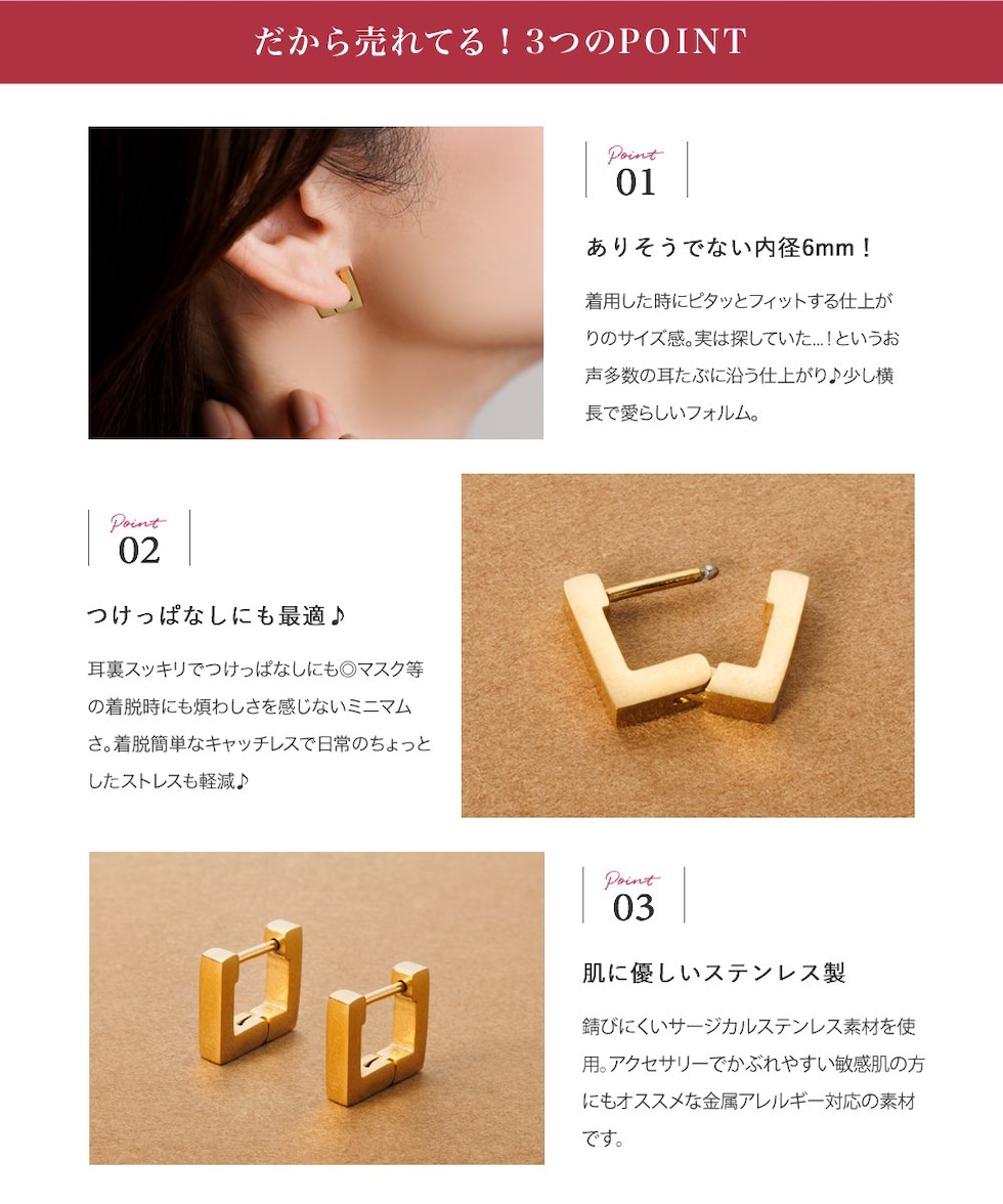 耳裏スッキリでつけっぱなしにも◎マスク等の着脱時にも煩わしさを感じないミニマムさ。着脱簡単なキャッチレスで日常のちょっとしたストレスも軽減♪