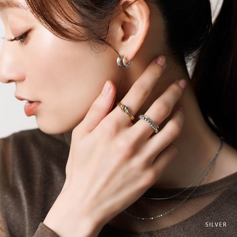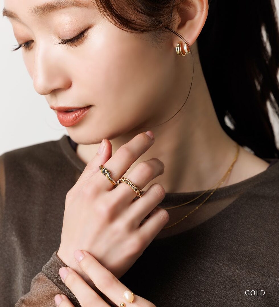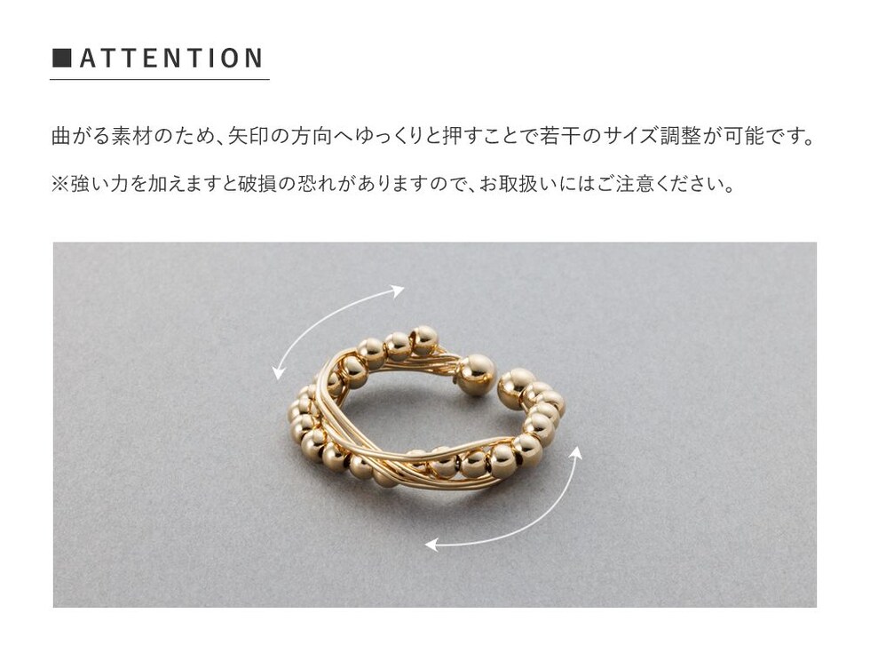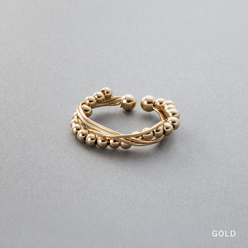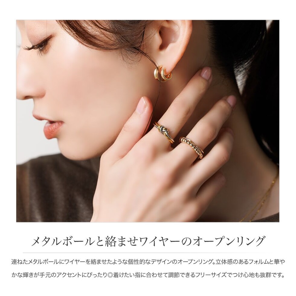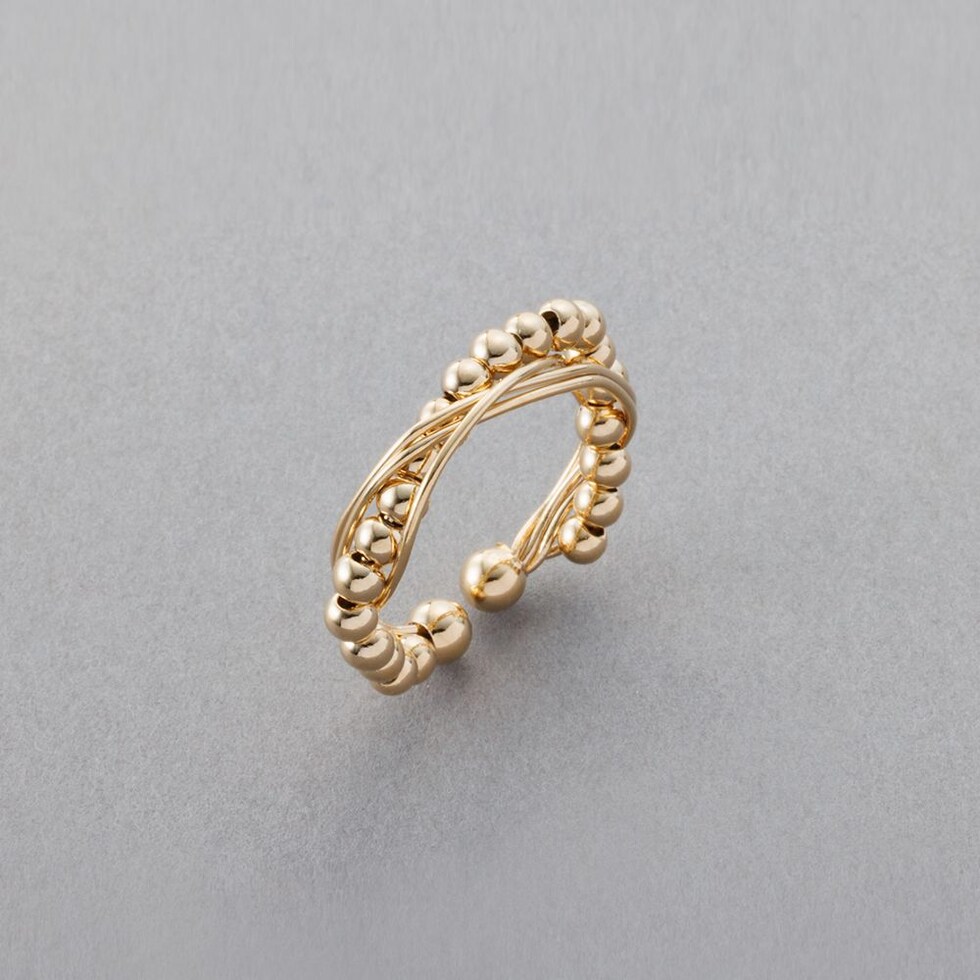 連ねたメタルボールにワイヤーを絡ませたような個性的なデザインのオープンリング。立体感のあるフォルムと華やかな輝きが手元のアクセントにぴったり◎着けたい指に合わせて調節できるフリーサイズでつけ心地も抜群です。