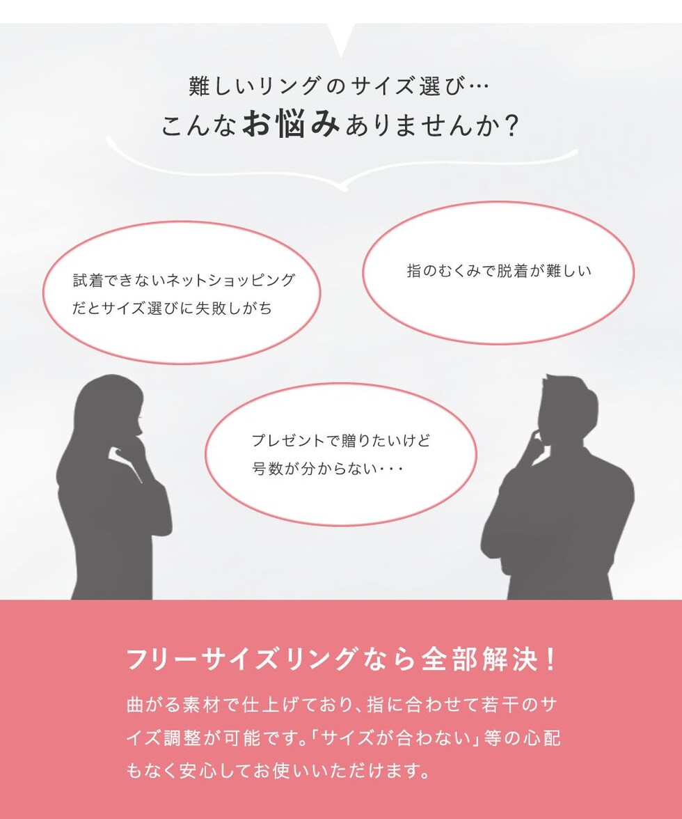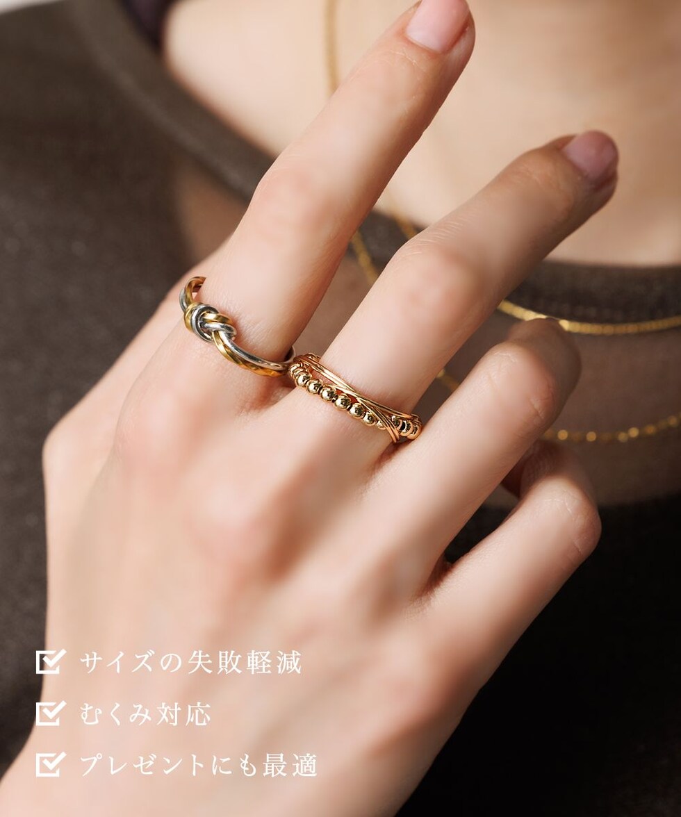 着けたい指に合わせて調整可能なフリーサイズ。むくみ等のお悩みやプレゼントにもサイズを気にせず最適です。締め付け感が少なくストレスフリーなのも高point♪