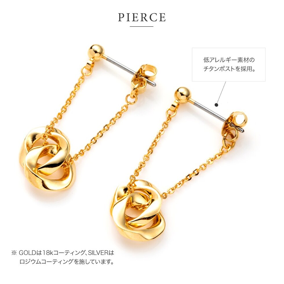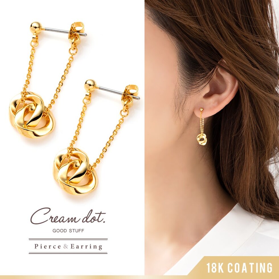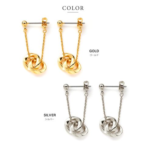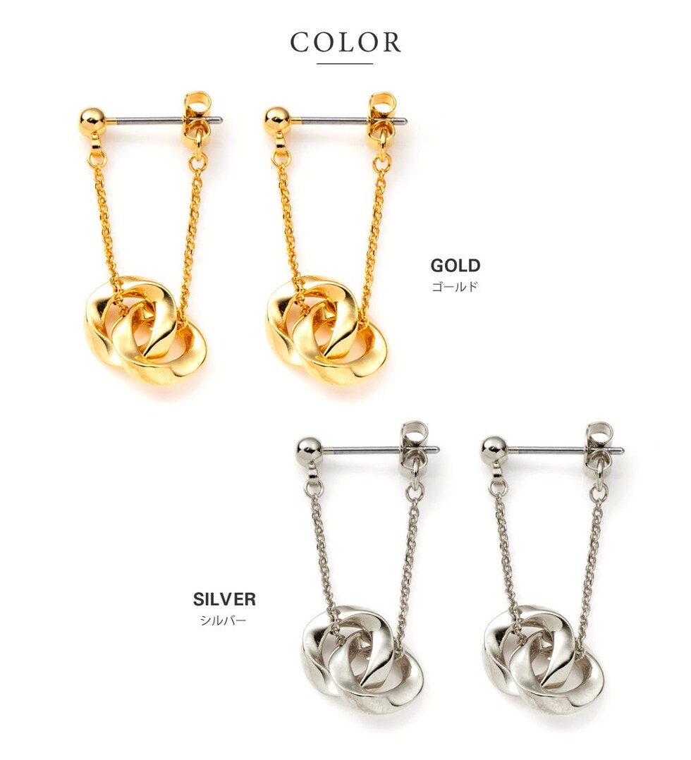 ひねりを加えたサークルモチーフを2つ連ねたスイングピアス/イヤリング。