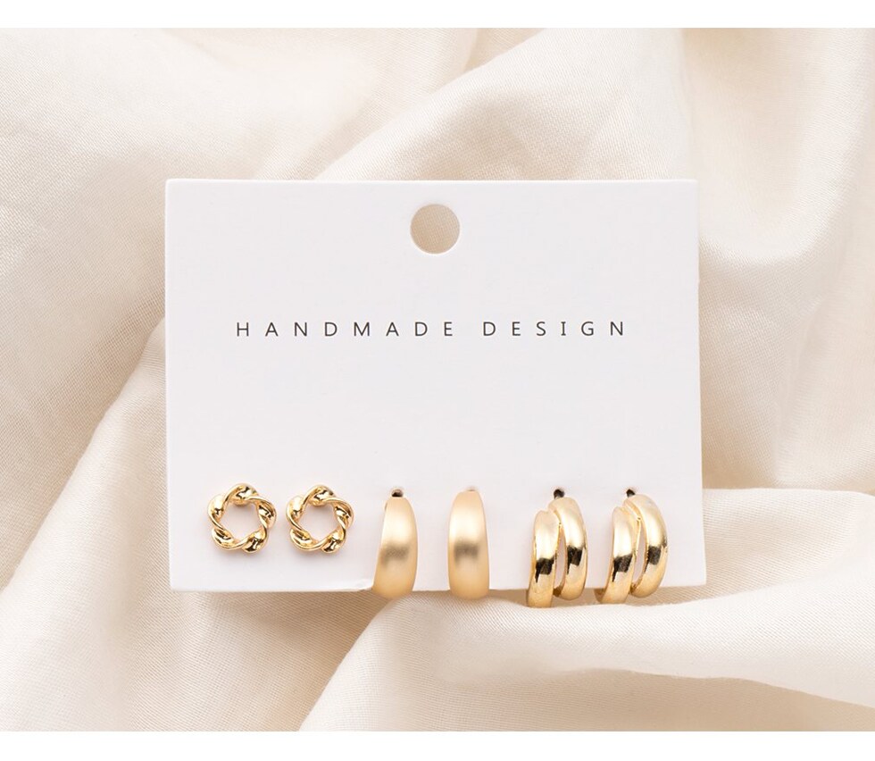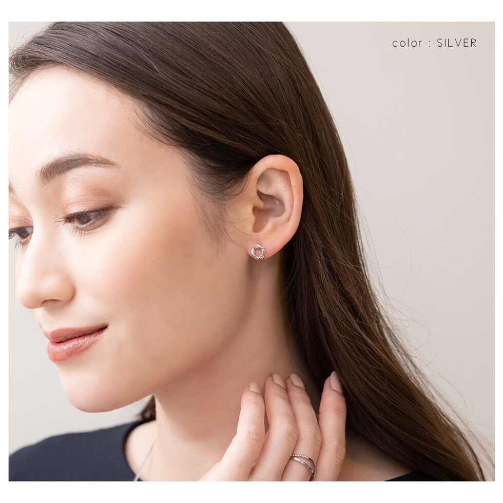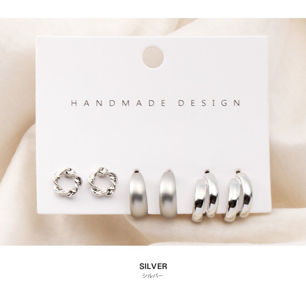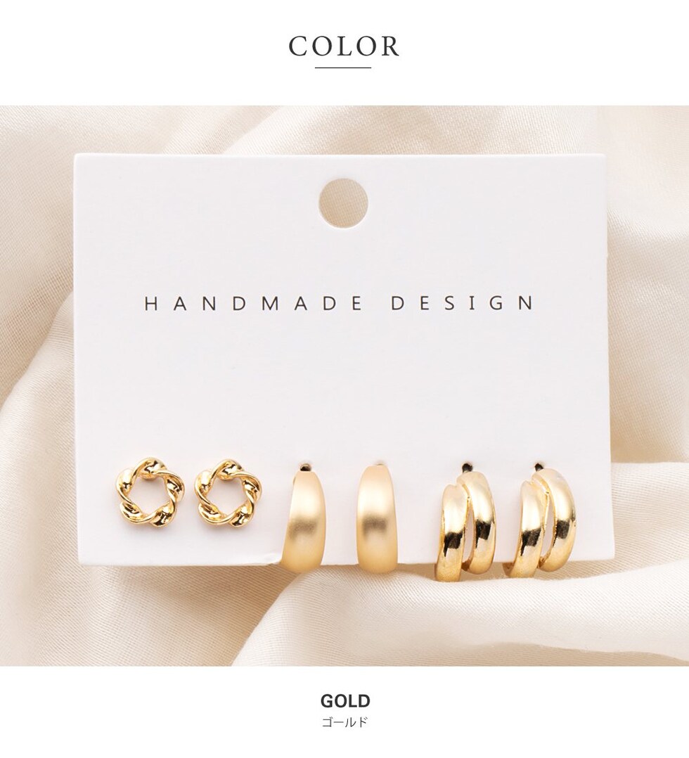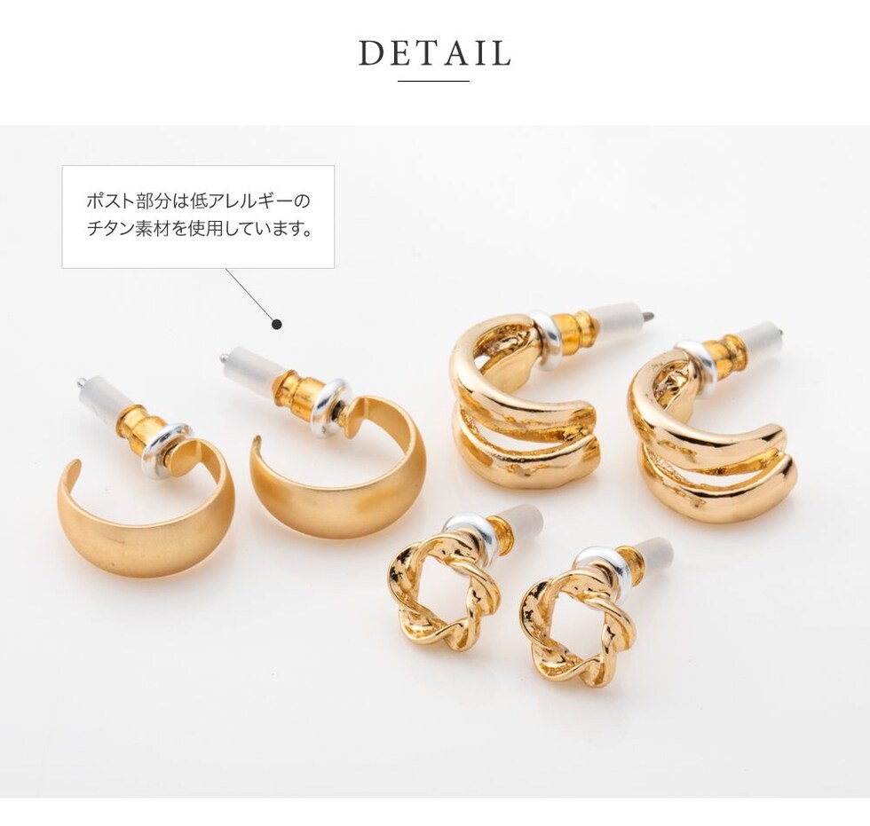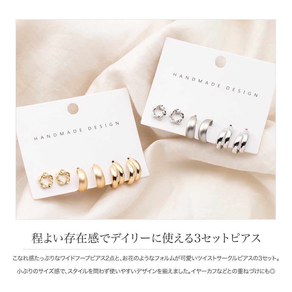 こなれ感たっぷりなワイドフープピアス2点と、お花のようなフォルムが可愛いツイストサークルピアスの3セット。