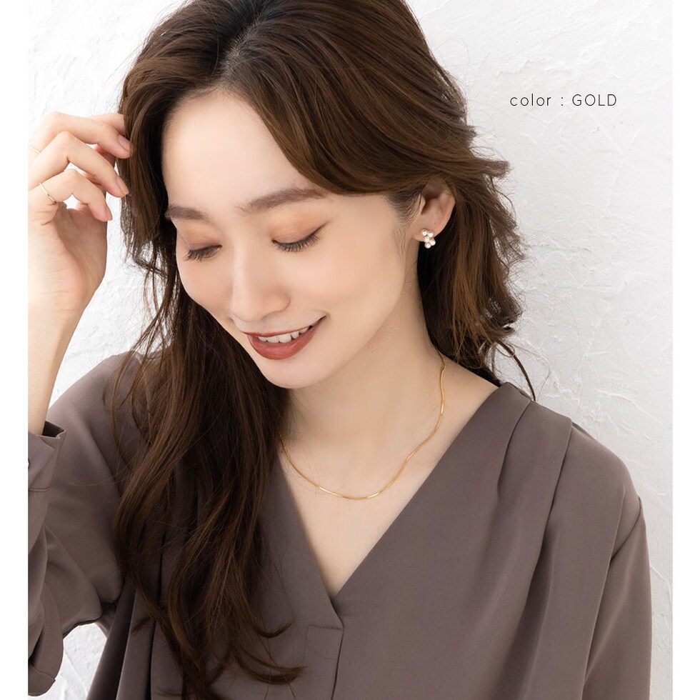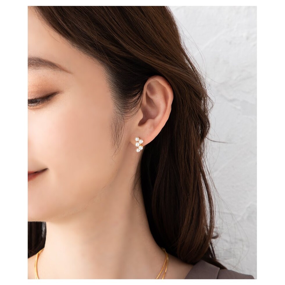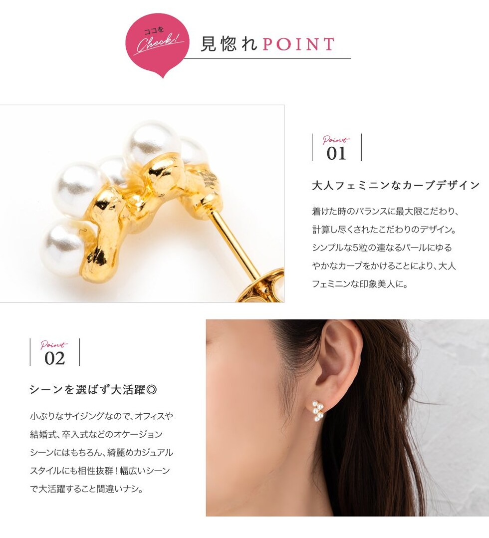 着けた時のバランスに最大限こだわり、計算し尽くされたこだわりのデザイン。シンプルな5粒の連なるパールにゆるやかなカーブをかけることにより、大人フェミニンな印象美人に。