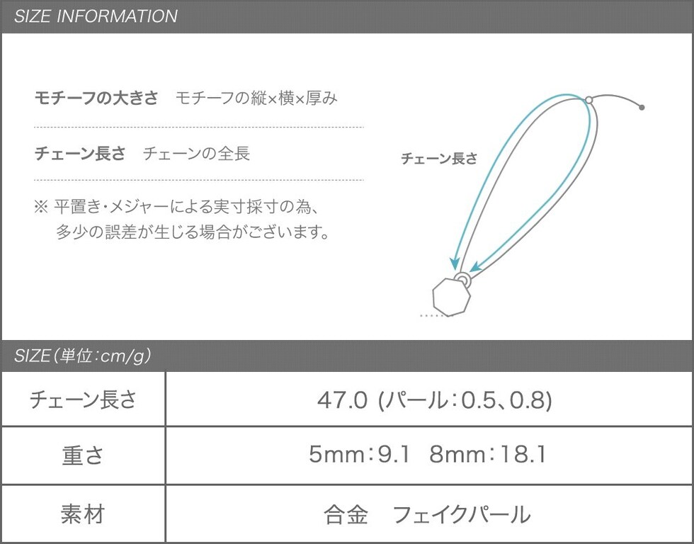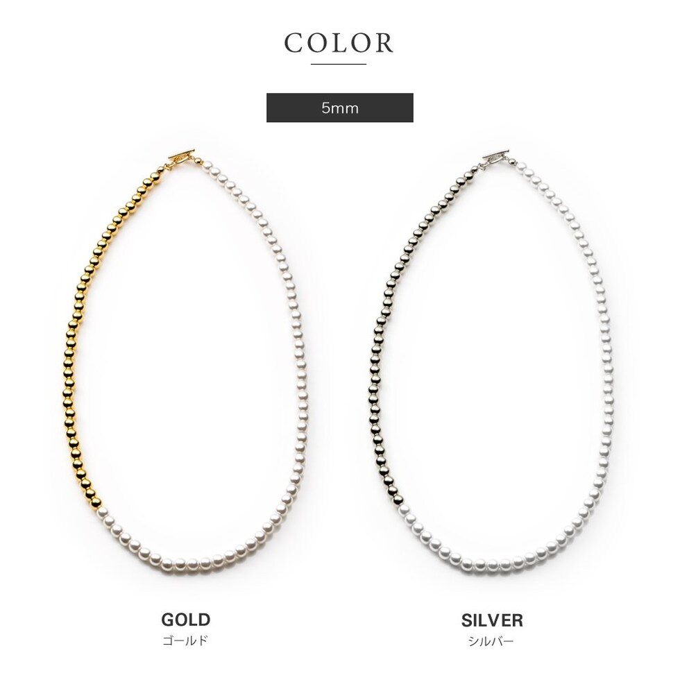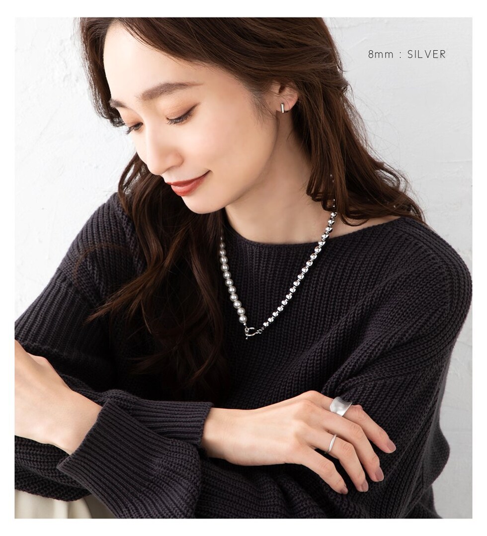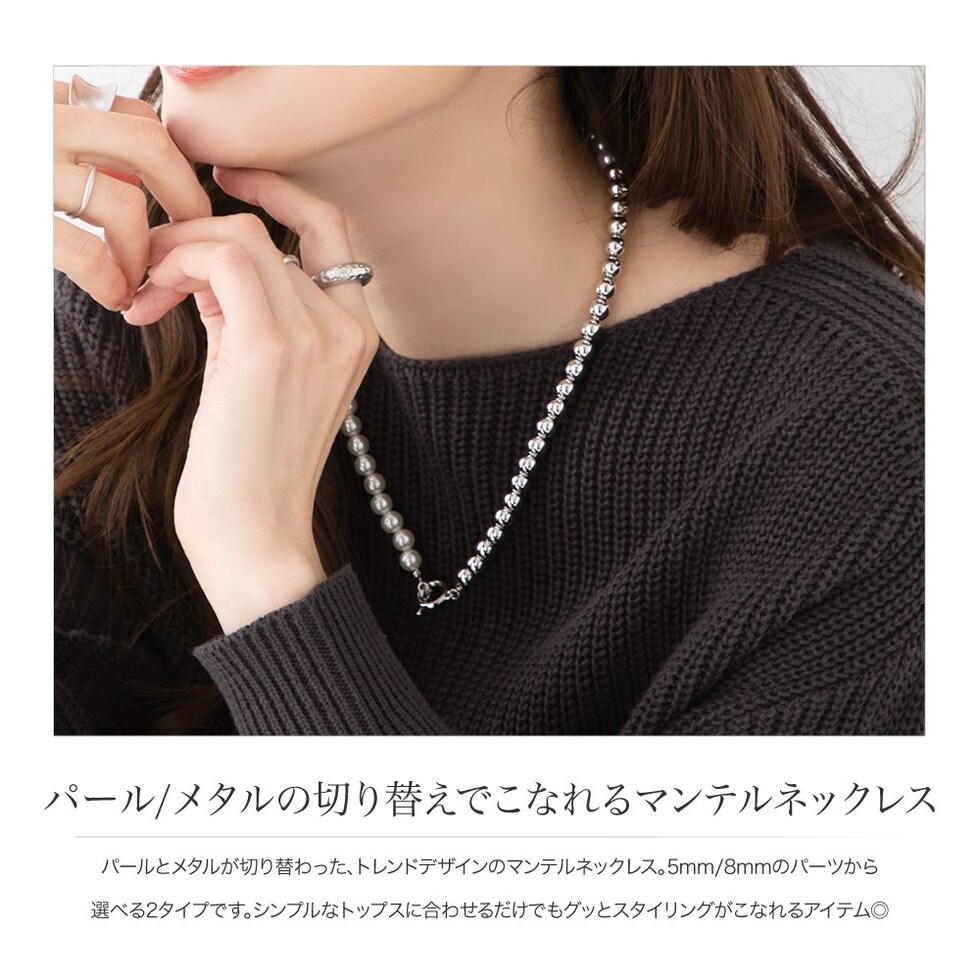 パールとメタルが切り替わった、トレンドデザインのマンテルネックレス。5mm/8mmのパーツから選べる2タイプです。シンプルなトップスに合わせるだけでもグッとスタイリングがこなれるアイテム◎