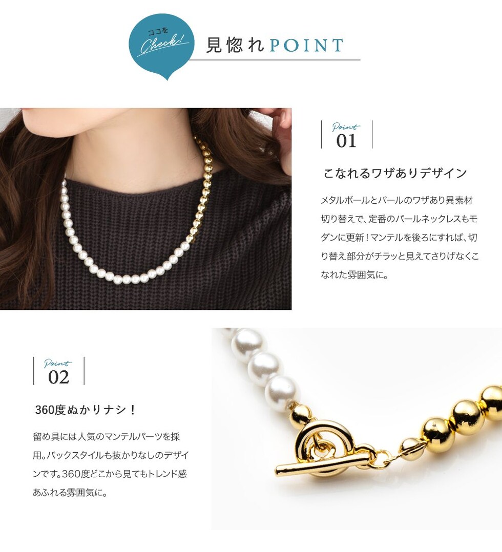 メタルボールとパールのワザあり異素材切り替えで、定番のパールネックレスもモダンに更新!マンテルを後ろにすれば、切り替え部分がチラッと見えてさりげなくこなれた雰囲気に。